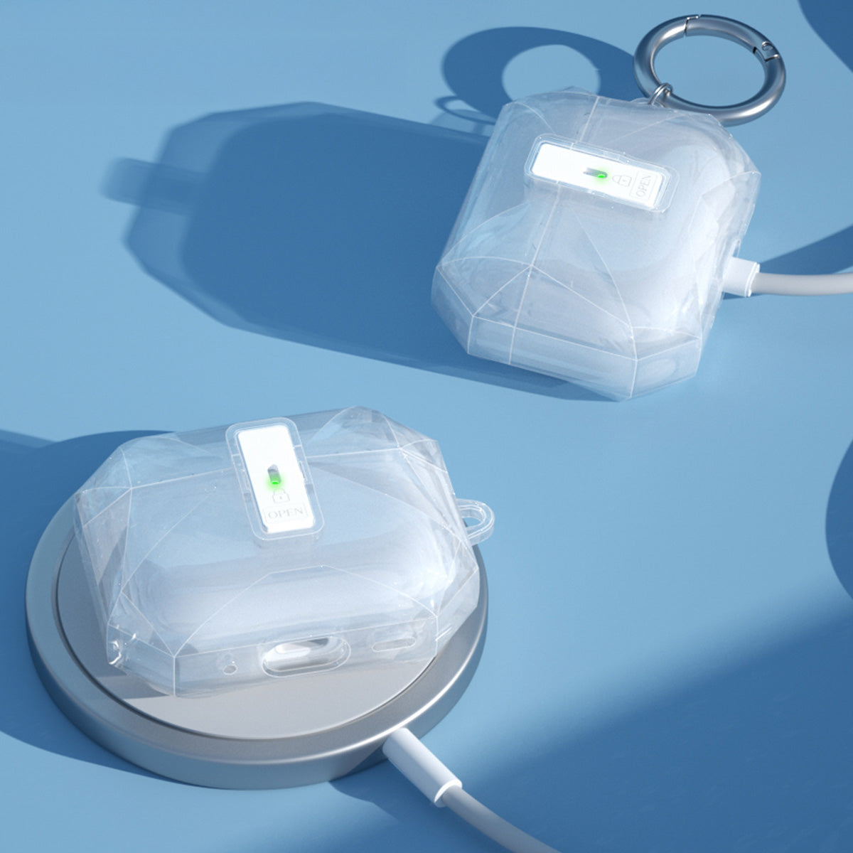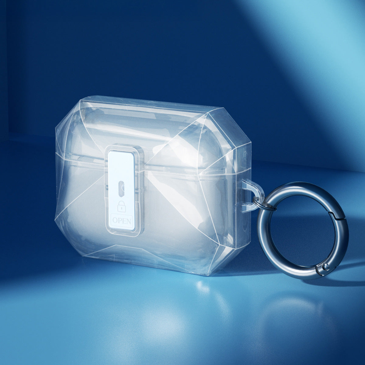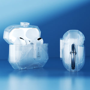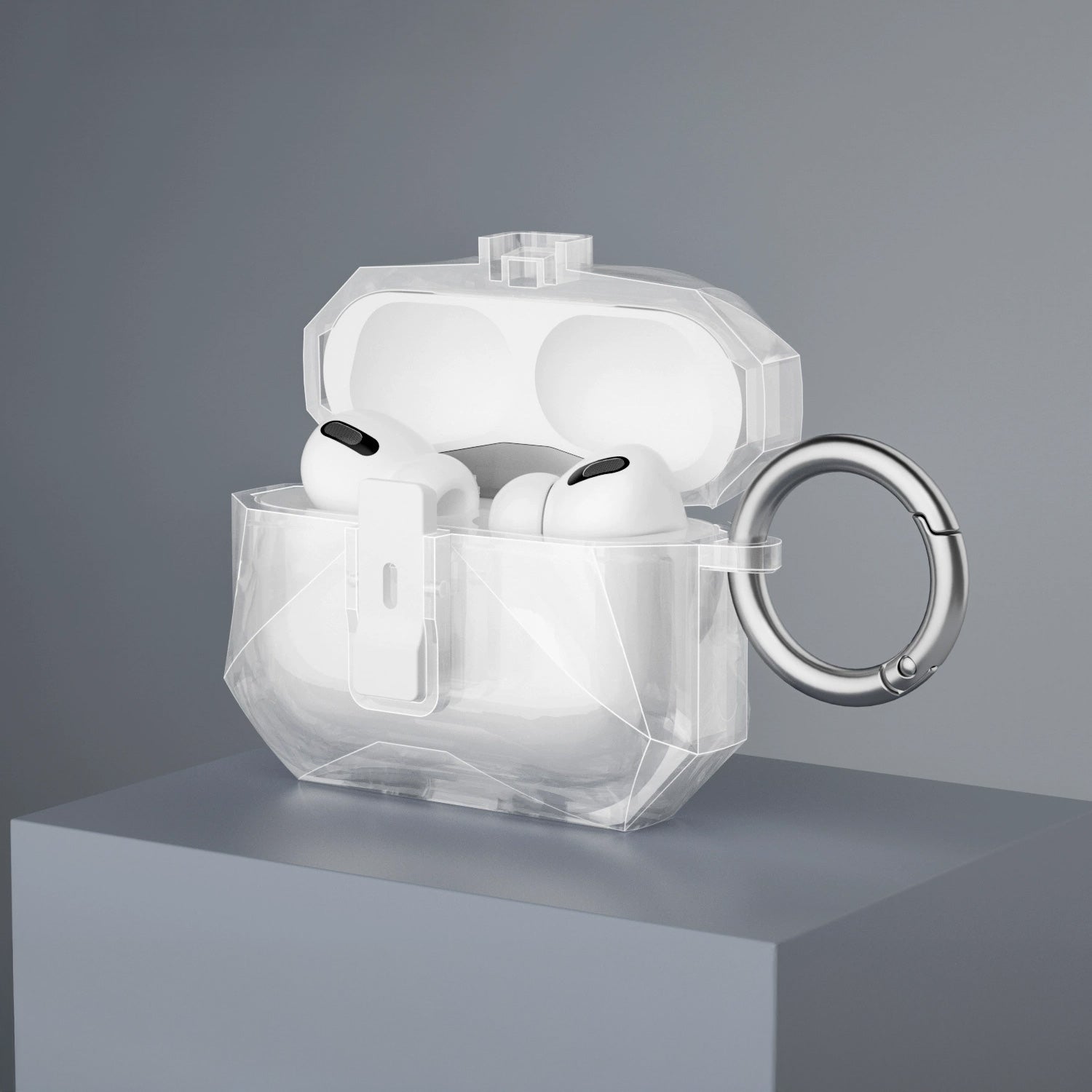 Protect your AirPods in stunning, sculptural style. This transparent AirPods Case features a striking, gem-like design, with geometric facets that catch and refract light like a piece of cut crystal. Its crystal-clear construction beautifully showcases the original minimalist design of your AirPods, while adding a touch of modern artistry. This durable AirPods Case is engineered to provide robust protection from everyday scratches, scuffs, and drops, keeping your tech safe and secure. The included sleek metal carabiner allows you to conveniently attach your AirPods to your keys, bag, or belt loop for easy access and peace of mind.