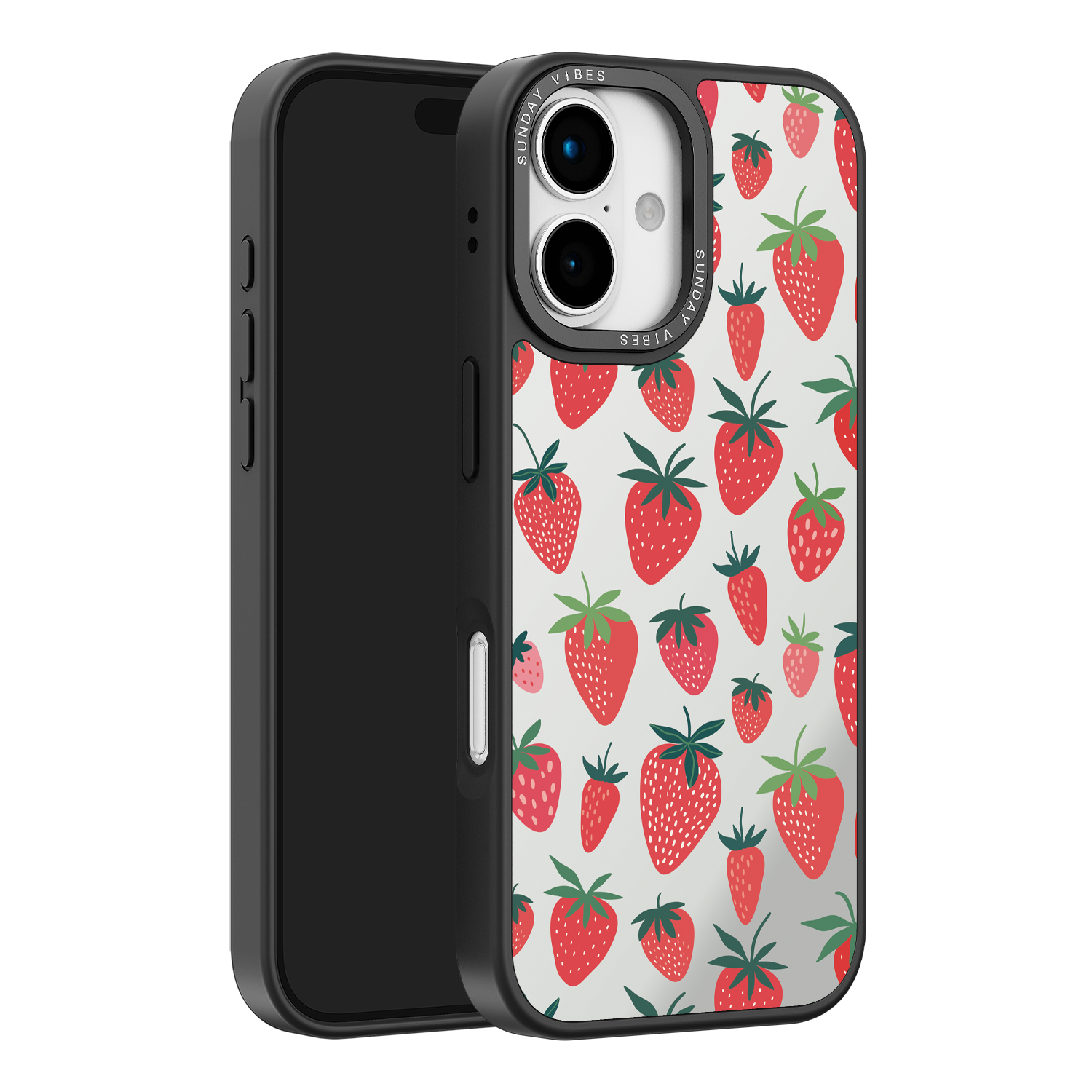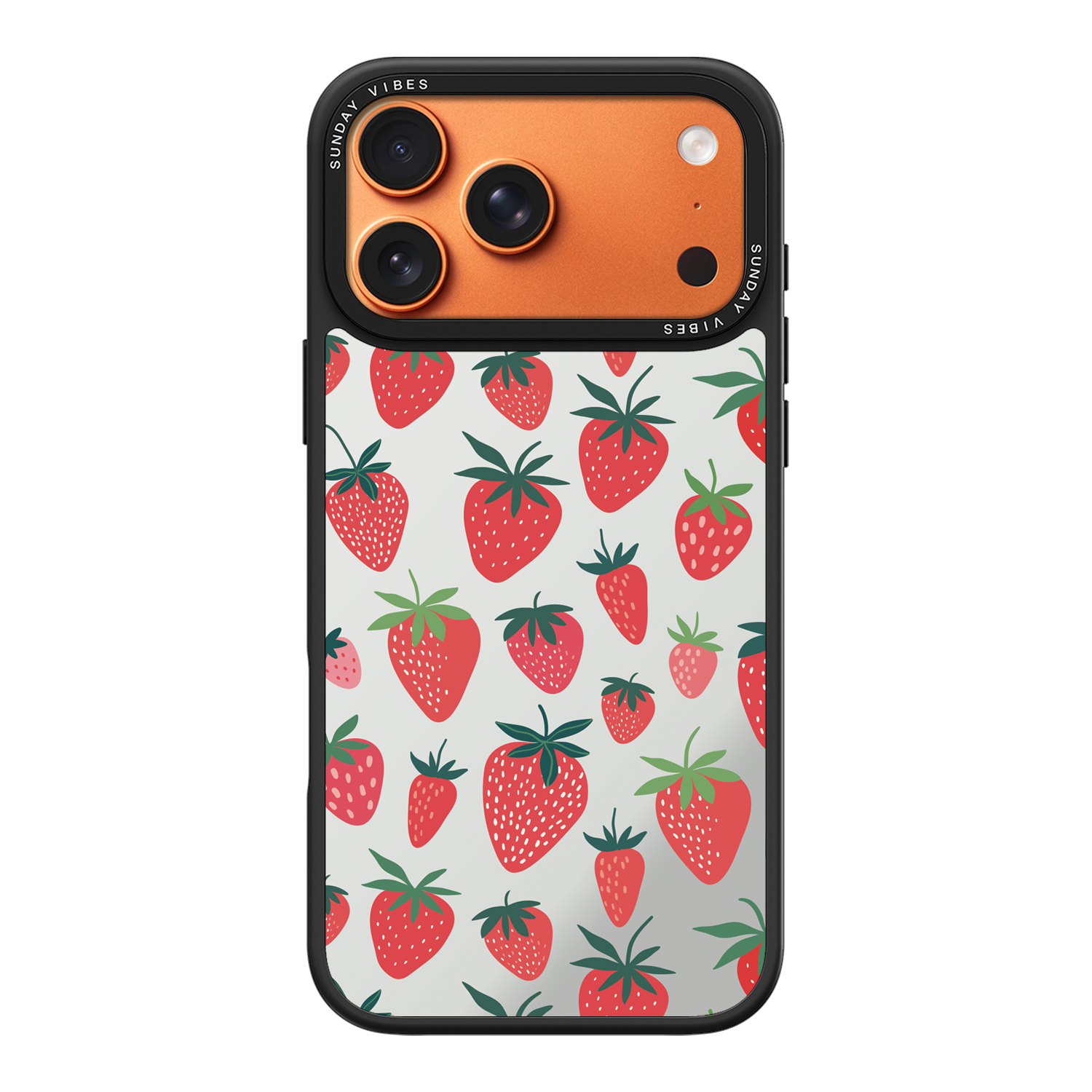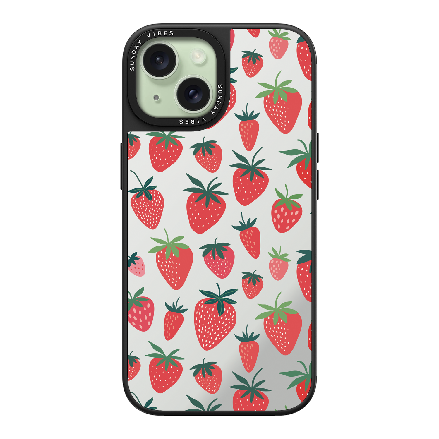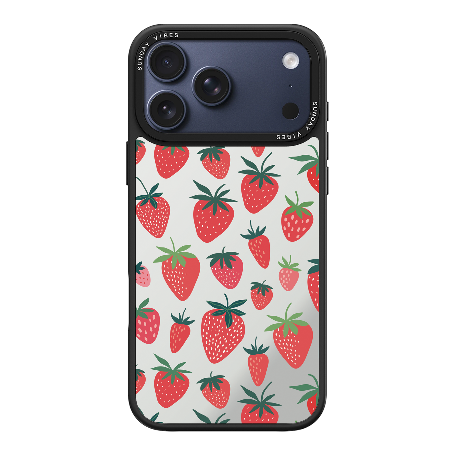 Adorn your device with the pure, vibrant fun of the Berry Cheeky iPhone Case. This striking design showcases a cheerful, repeated pattern of juicy red strawberries and green foliage, set against the highly reflective, functional mirror backing. This fresh, energetic aesthetic ensures you are always ready for a quick style check or selfie. The vibrant print and texture are applied directly onto the mirror surface for maximum visual impact.
