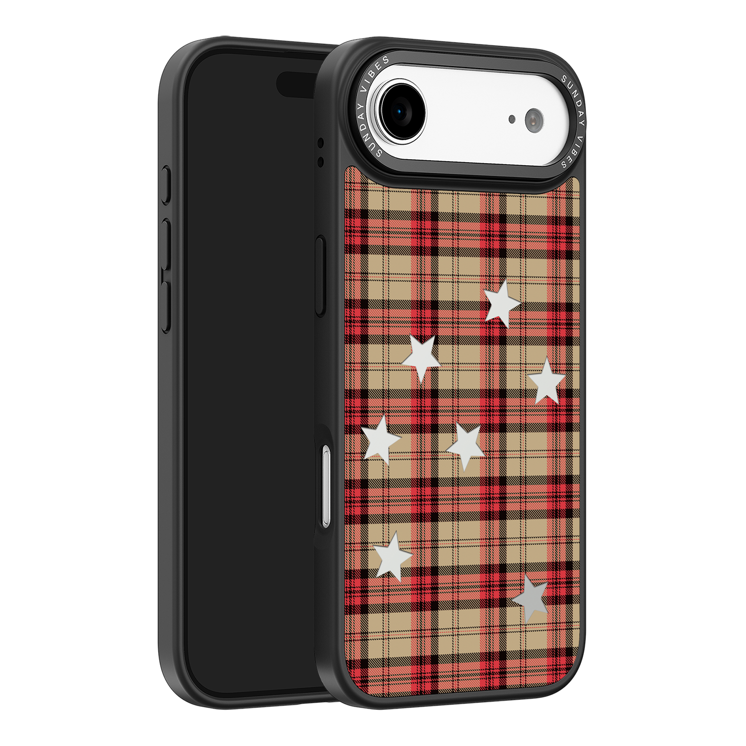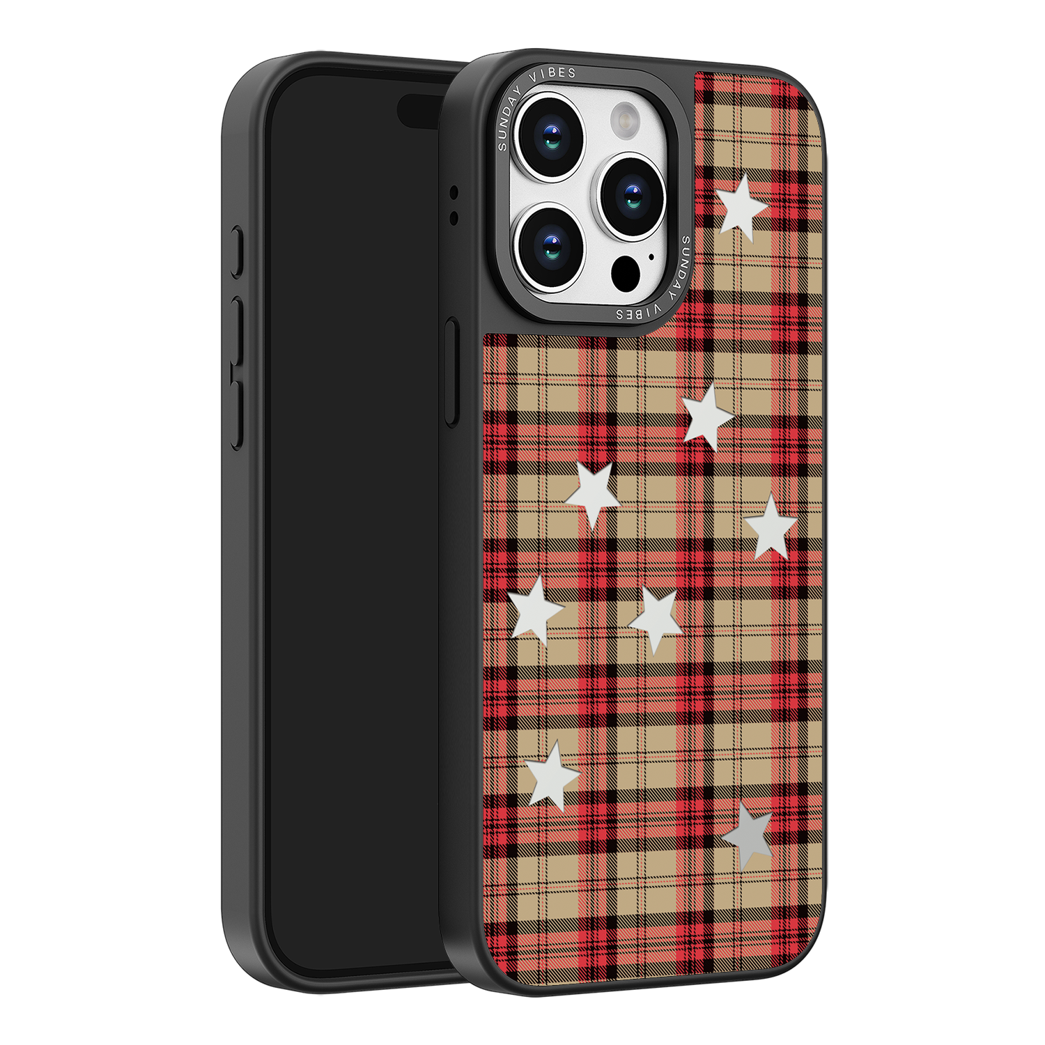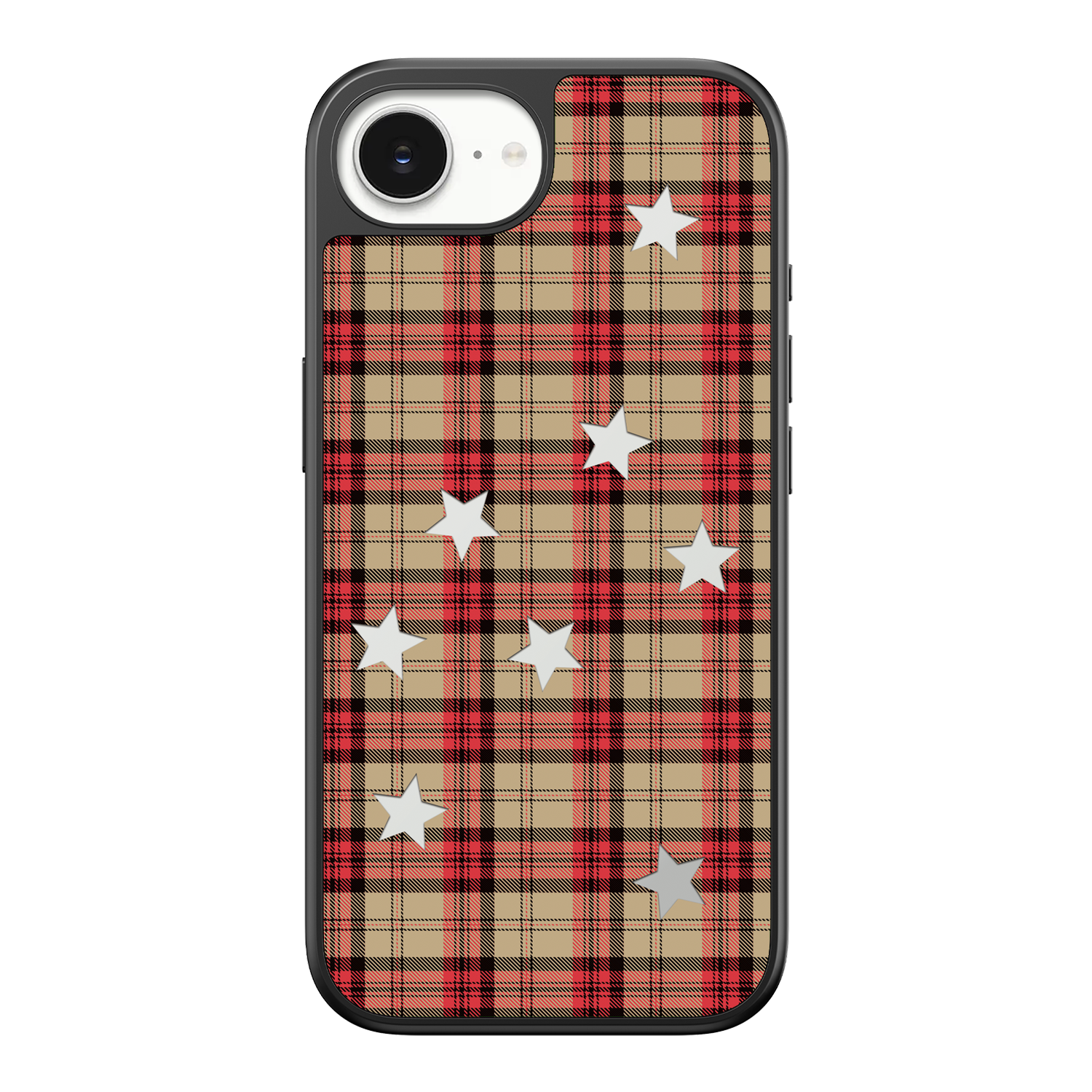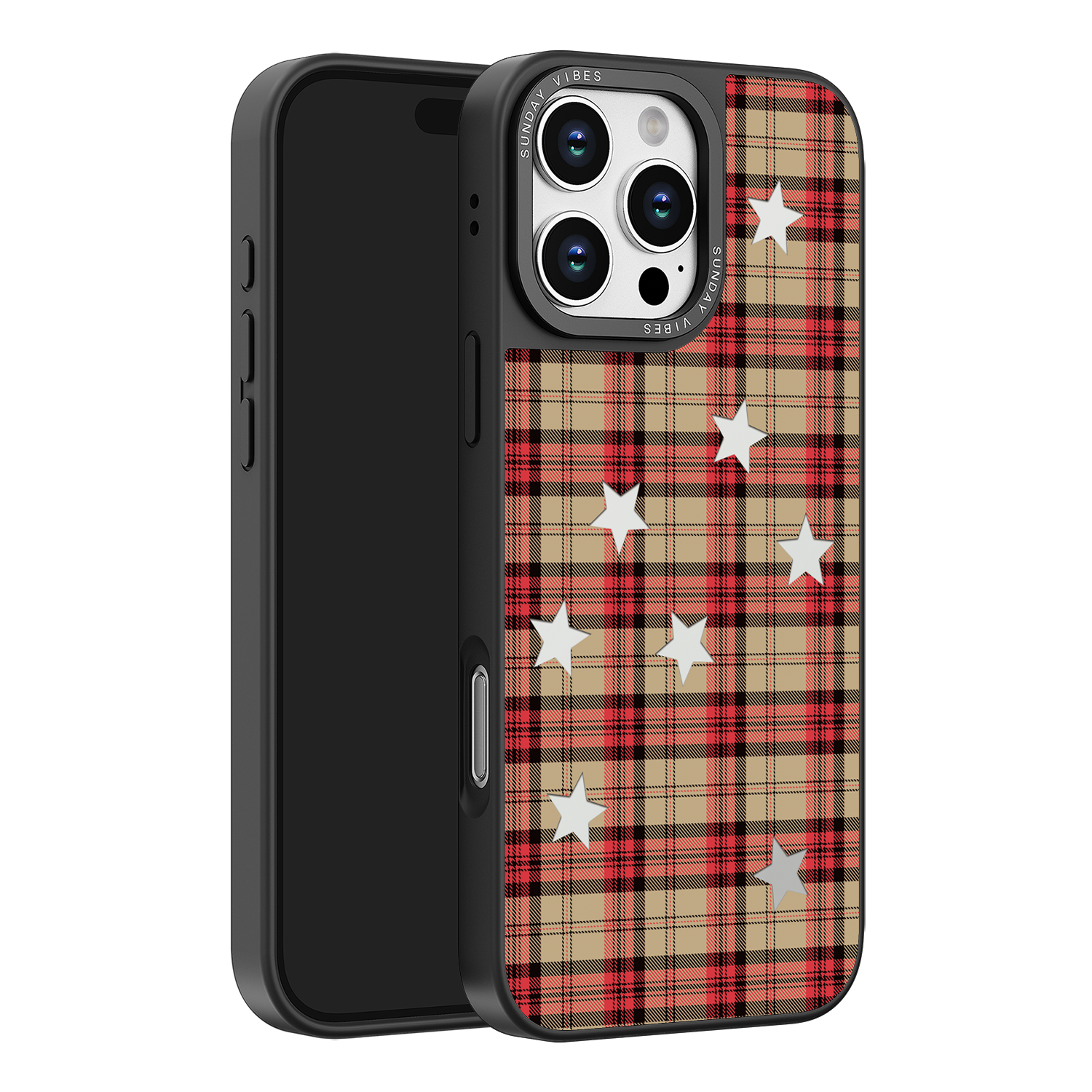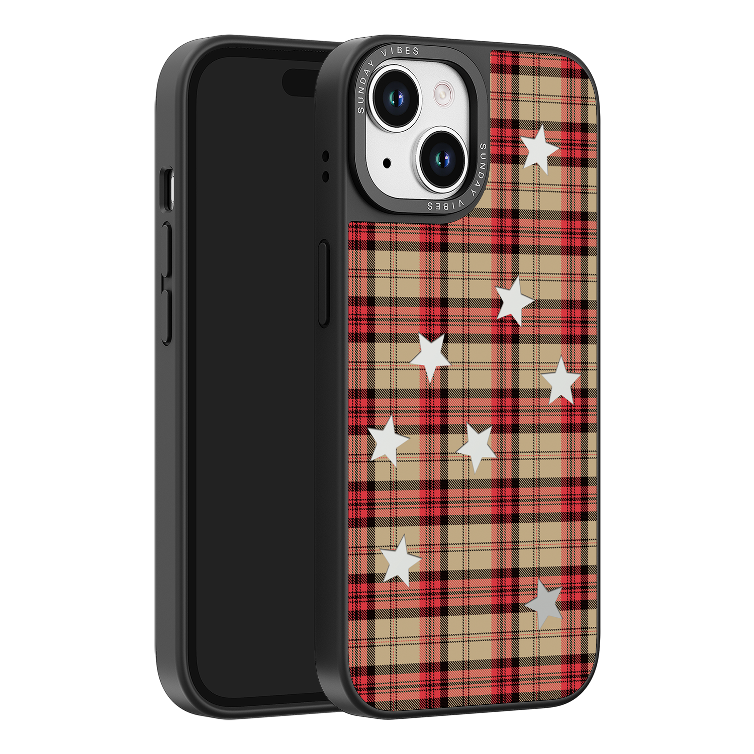 Adorn your device with the luxurious, timeless feel of the Cashmere Star iPhone Case. This striking design showcases a classic tartan pattern blending rich tan, black, and red tones, playfully overlaid with contrasting scattered stars. The design is printed directly onto the high-shine mirror backing, ensuring you are always ready for a quick style check or selfie.