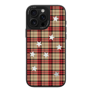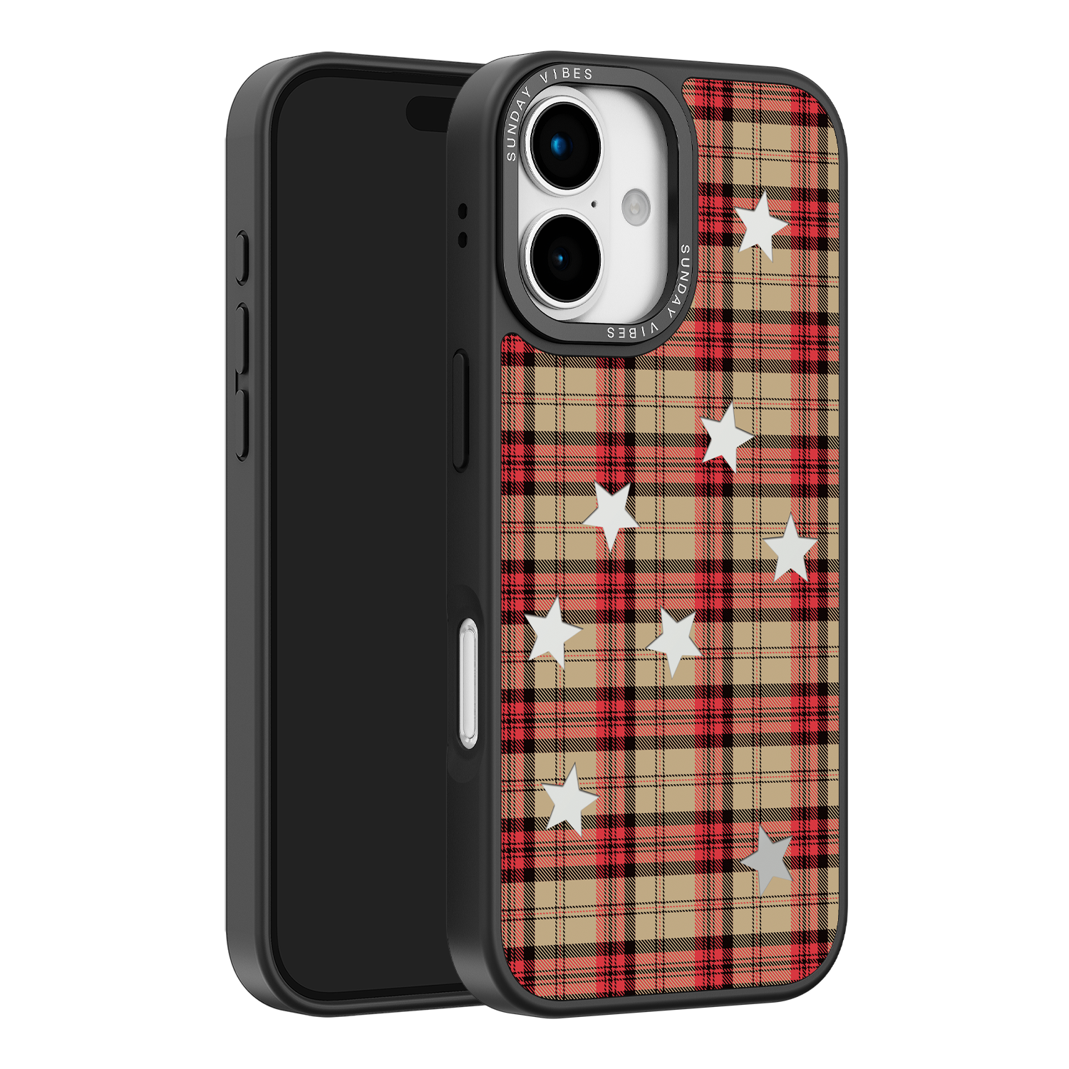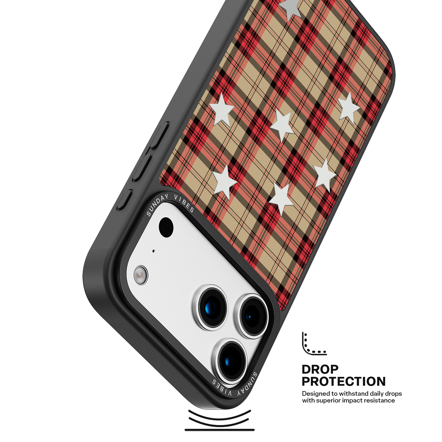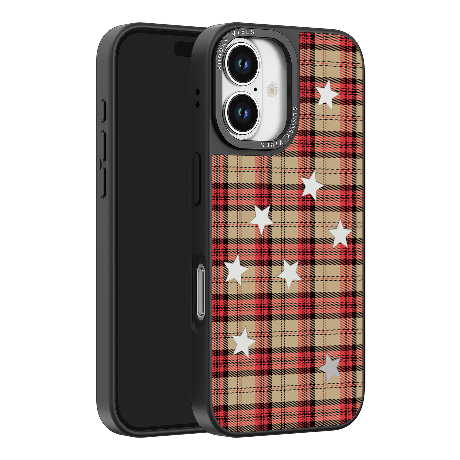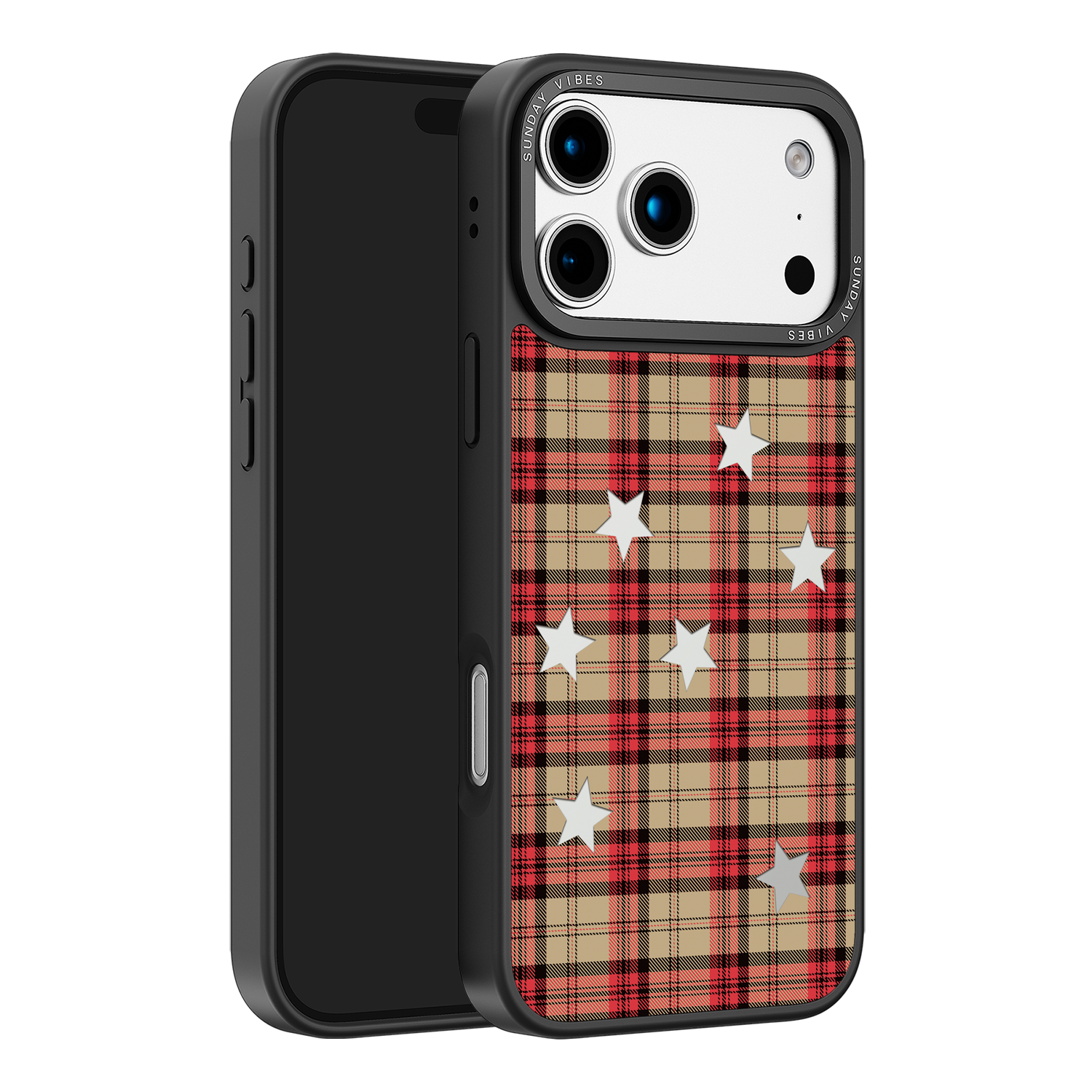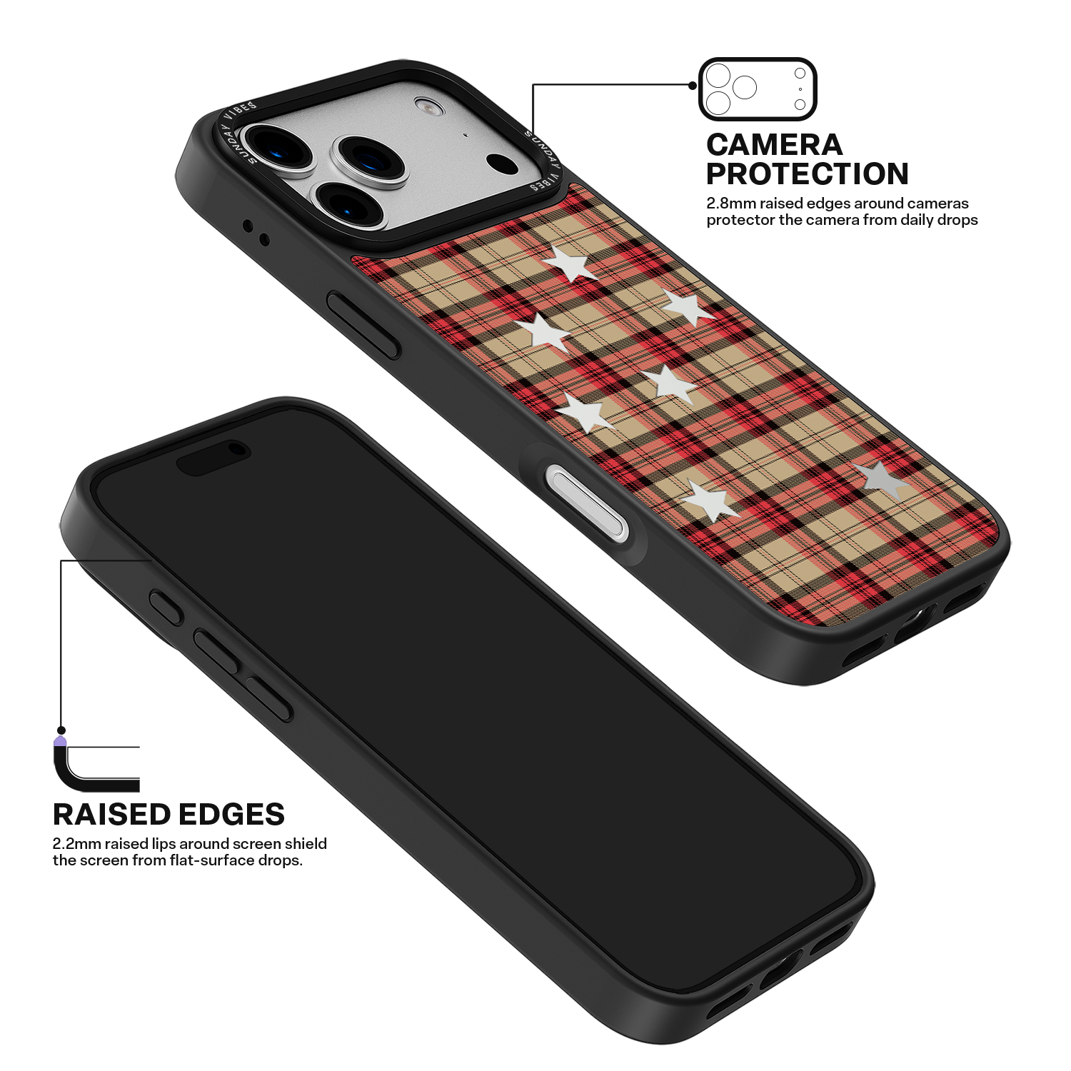 Adorn your device with the luxurious, timeless feel of the Cashmere Star iPhone Case. This striking design showcases a classic tartan pattern blending rich tan, black, and red tones, playfully overlaid with contrasting scattered stars. The design is printed directly onto the high-shine mirror backing, ensuring you are always ready for a quick style check or selfie.