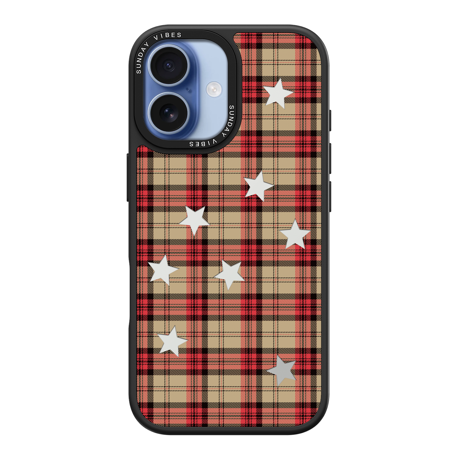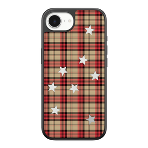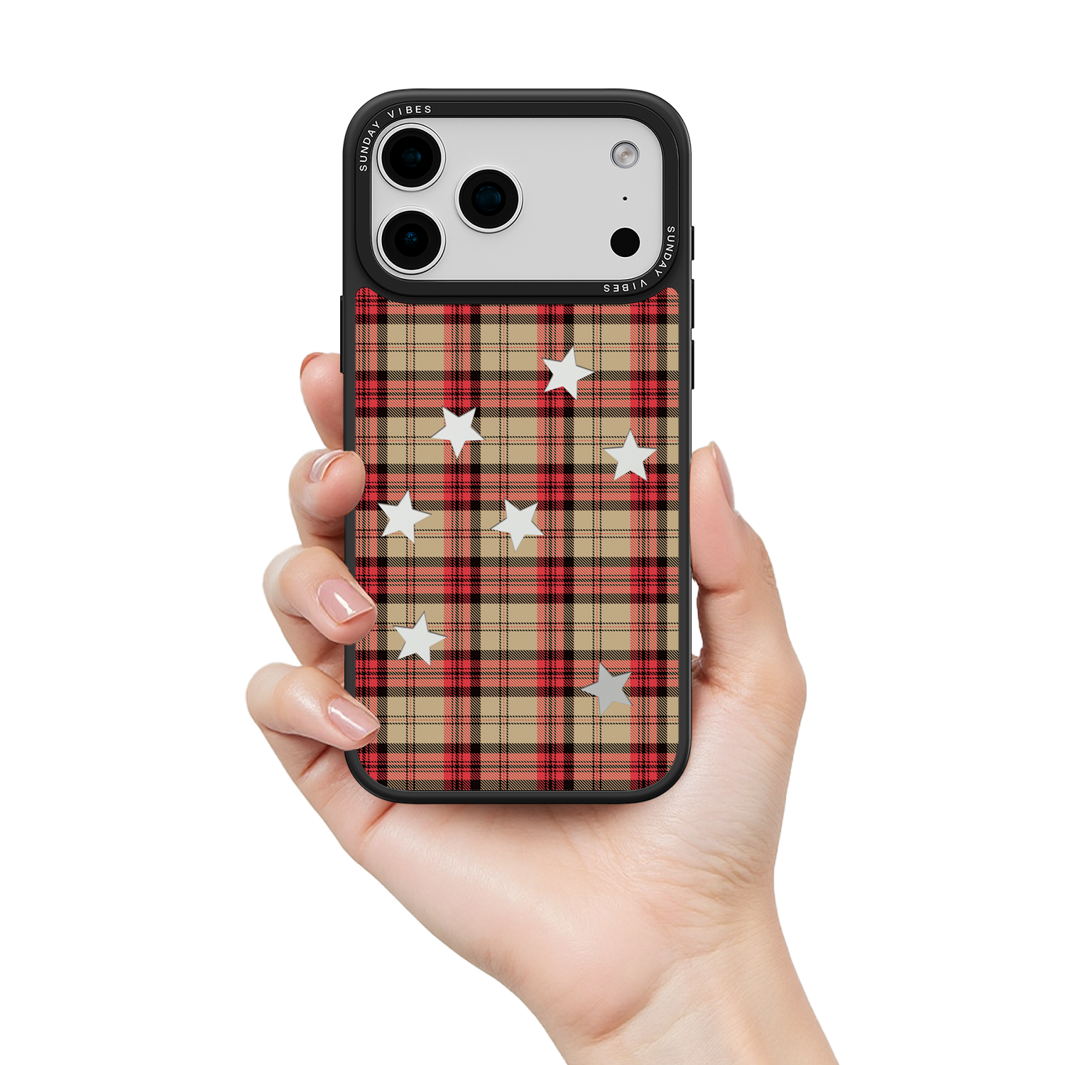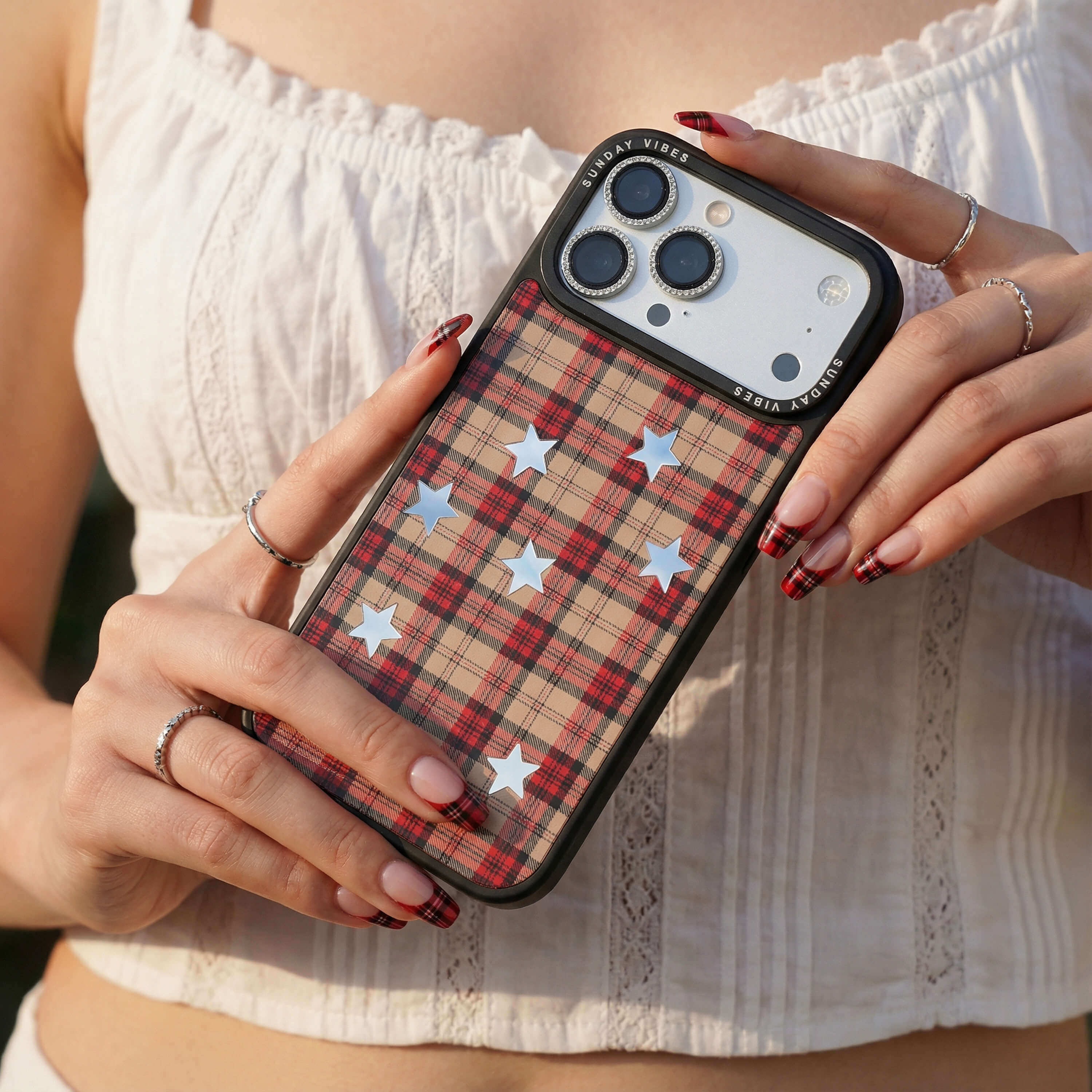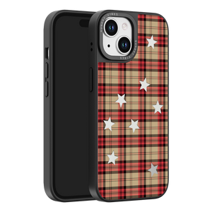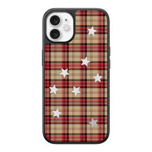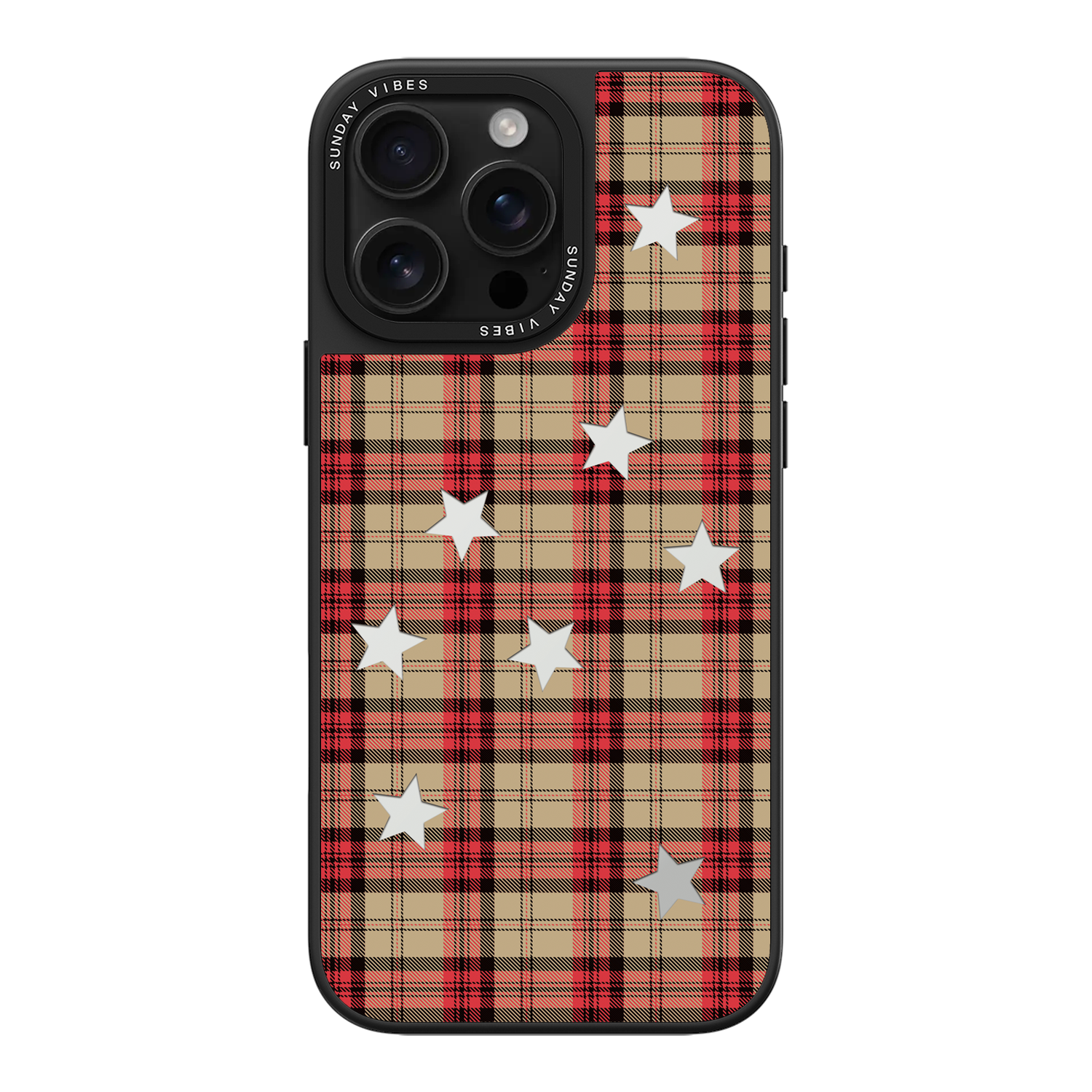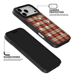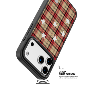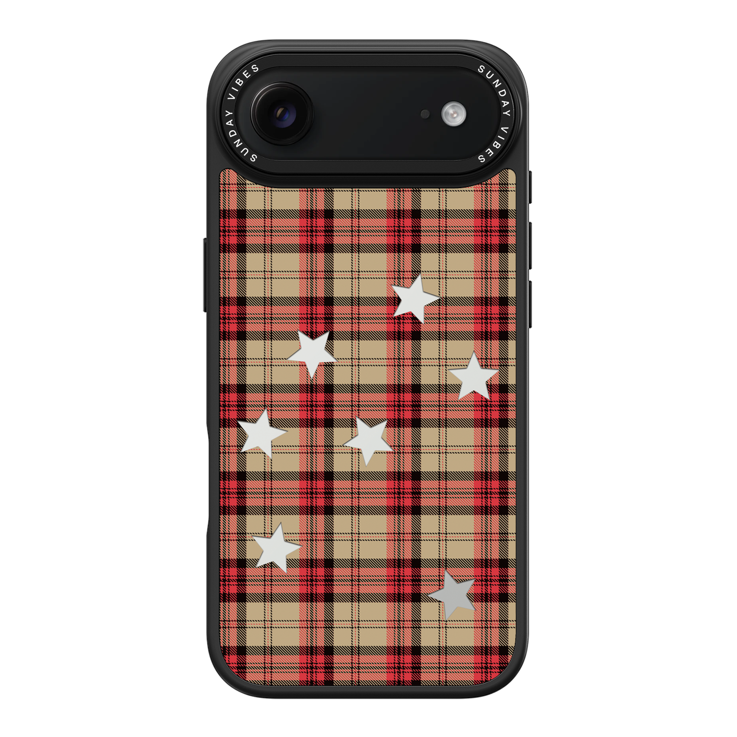 Adorn your device with the luxurious, timeless feel of the Cashmere Star iPhone Case. This striking design showcases a classic tartan pattern blending rich tan, black, and red tones, playfully overlaid with contrasting scattered stars. The design is printed directly onto the high-shine mirror backing, ensuring you are always ready for a quick style check or selfie.
