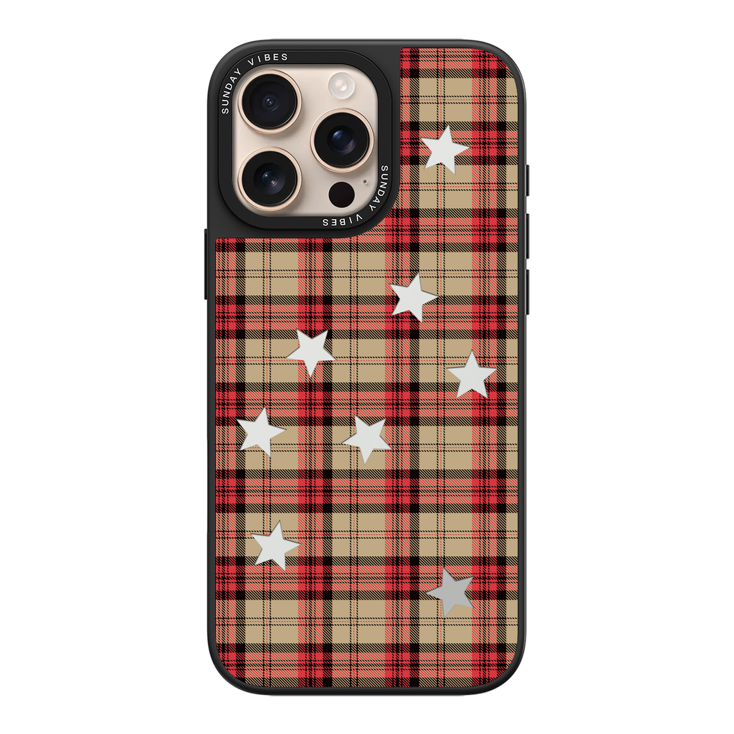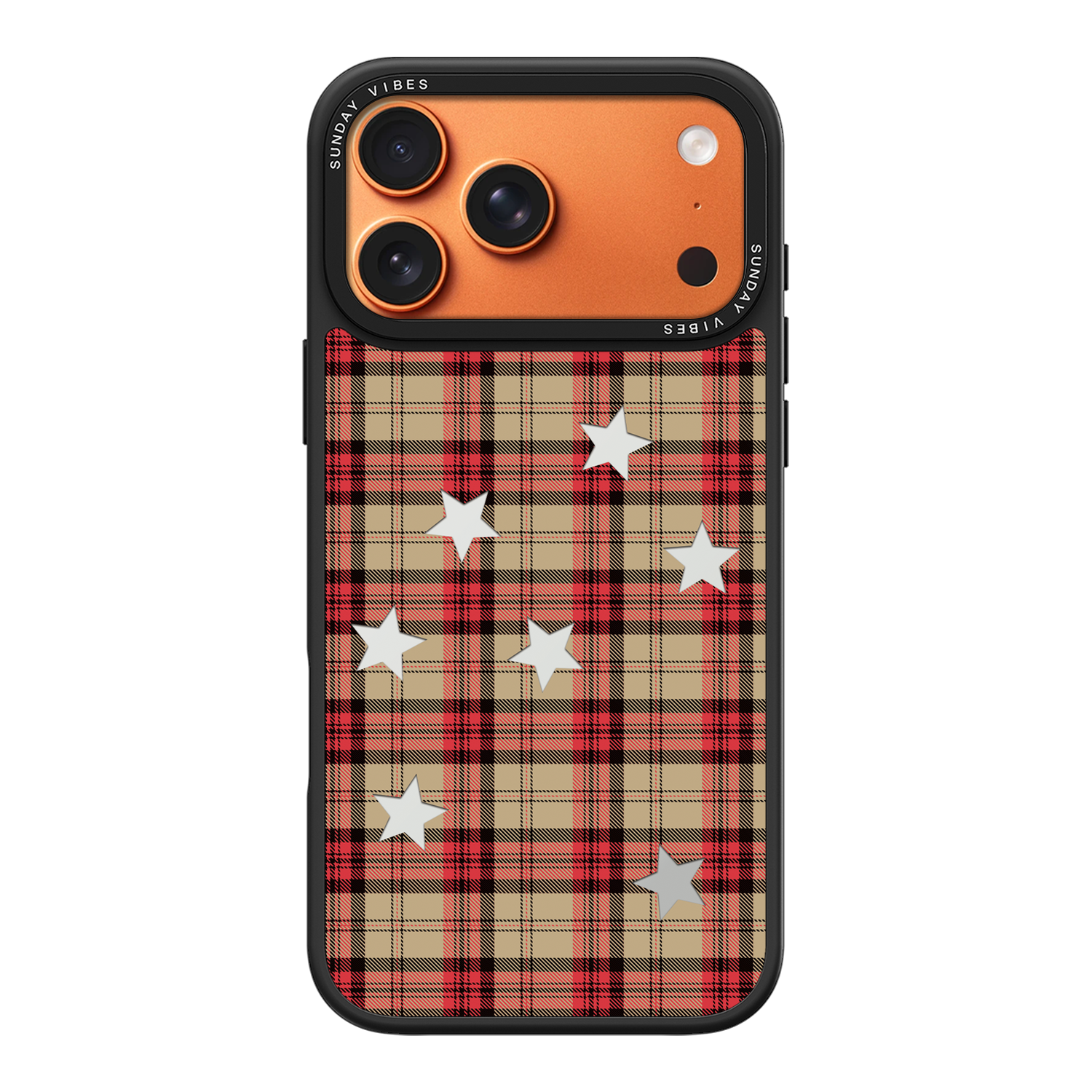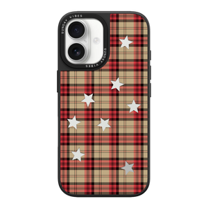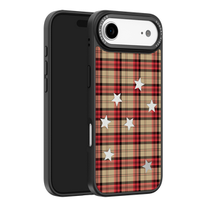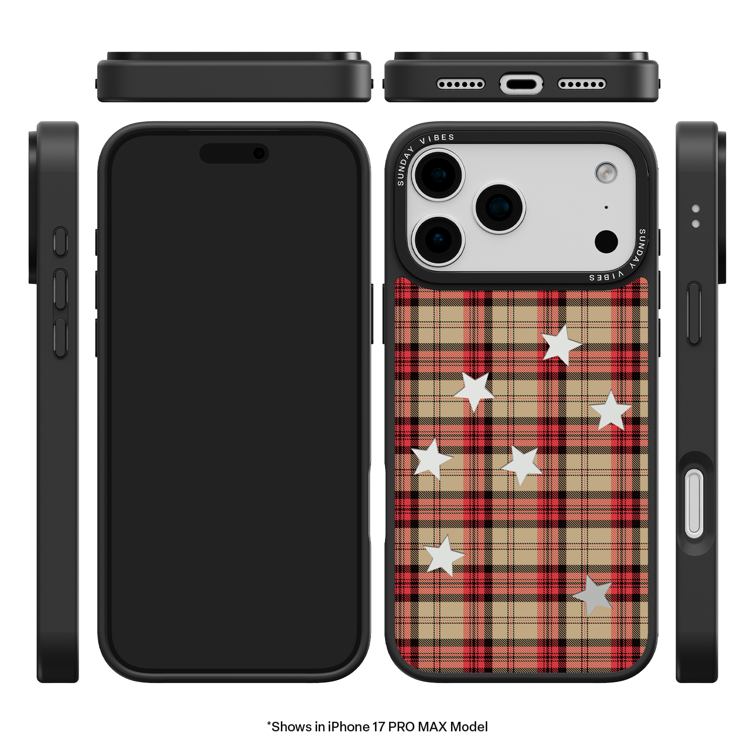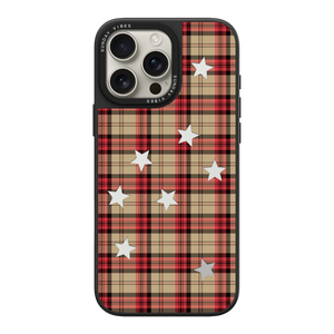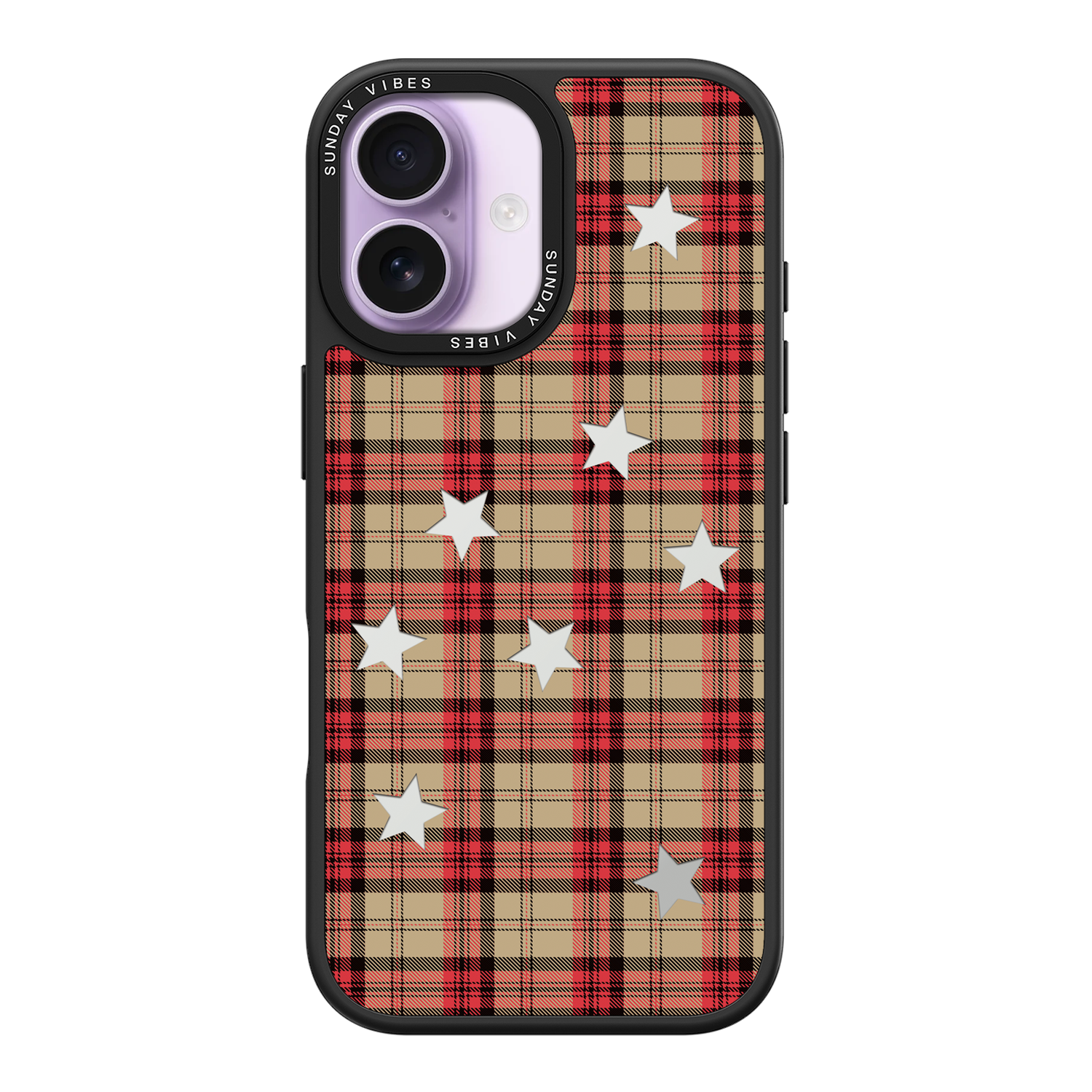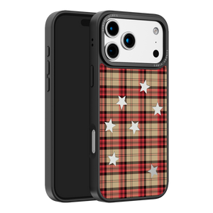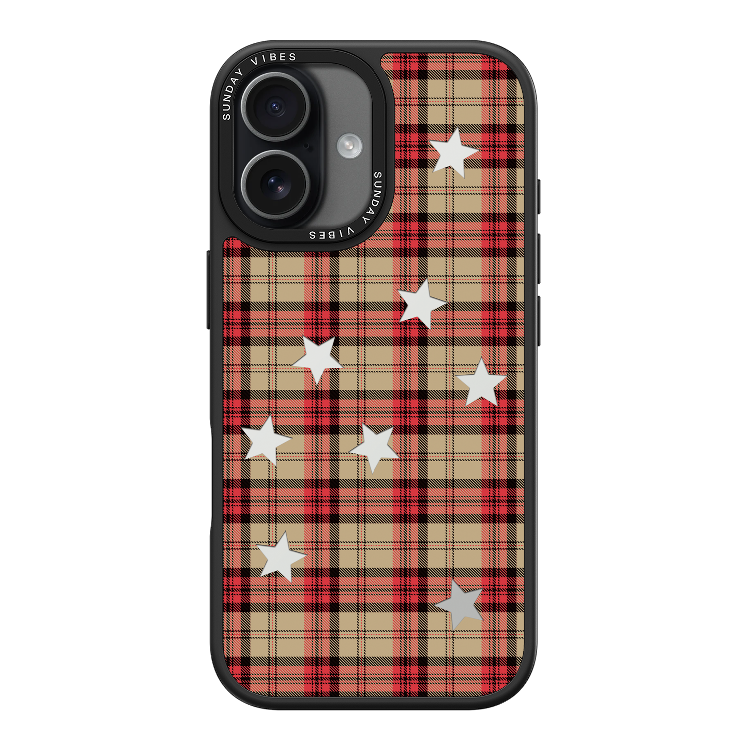 Adorn your device with the luxurious, timeless feel of the Cashmere Star iPhone Case. This striking design showcases a classic tartan pattern blending rich tan, black, and red tones, playfully overlaid with contrasting scattered stars. The design is printed directly onto the high-shine mirror backing, ensuring you are always ready for a quick style check or selfie.