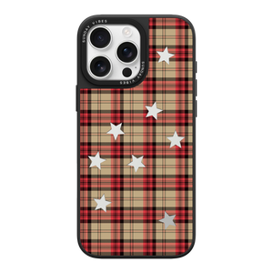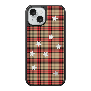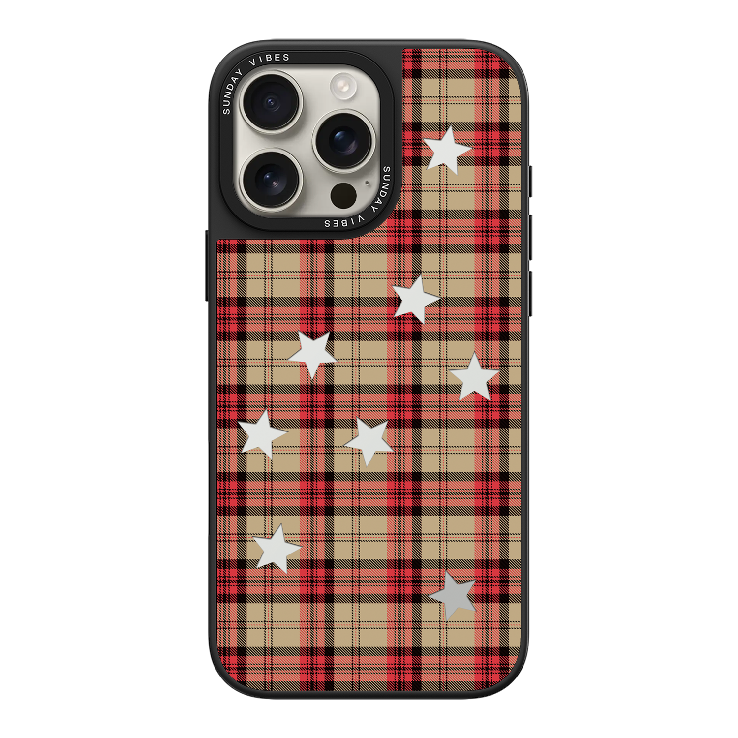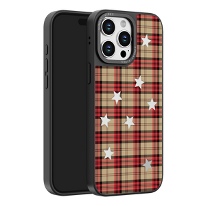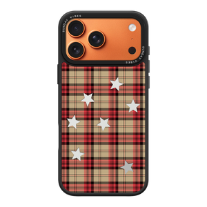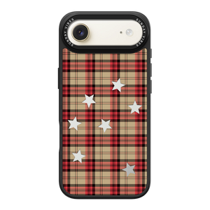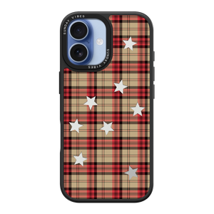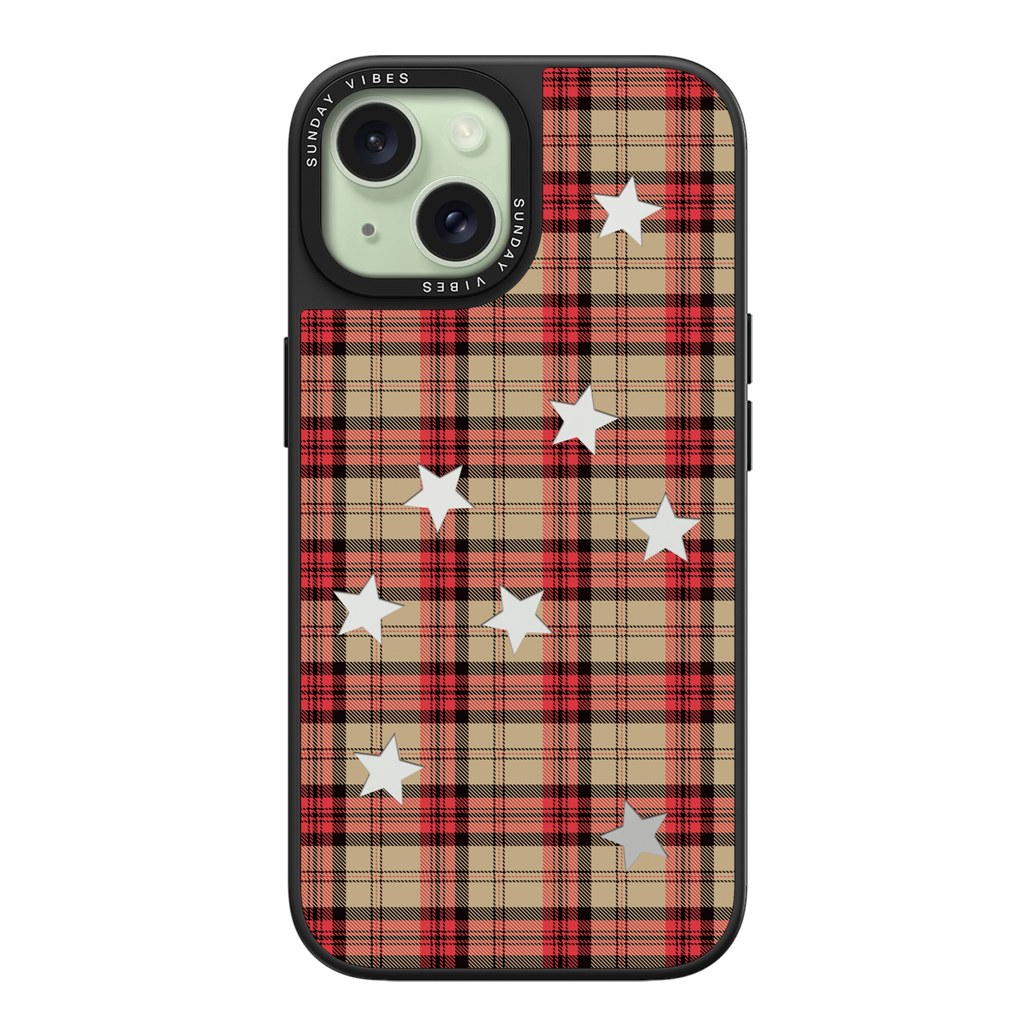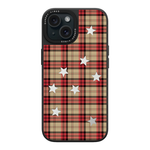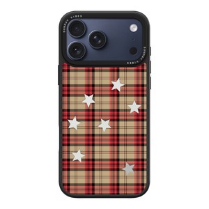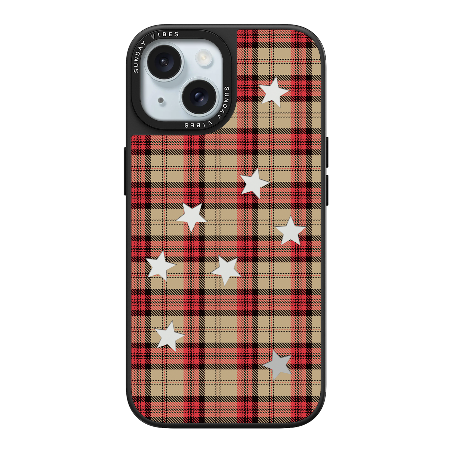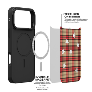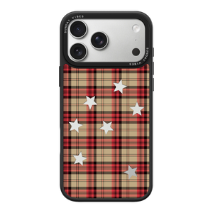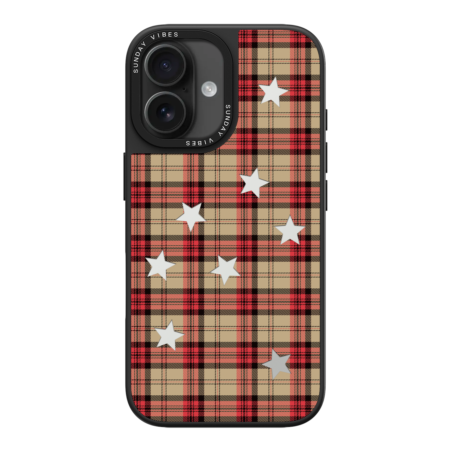 Adorn your device with the luxurious, timeless feel of the Cashmere Star iPhone Case. This striking design showcases a classic tartan pattern blending rich tan, black, and red tones, playfully overlaid with contrasting scattered stars. The design is printed directly onto the high-shine mirror backing, ensuring you are always ready for a quick style check or selfie.