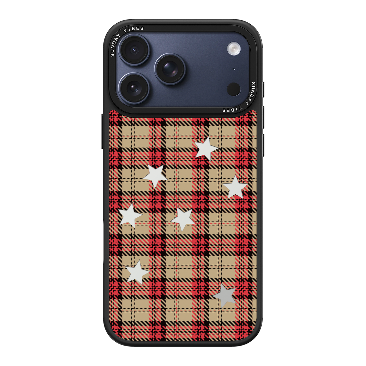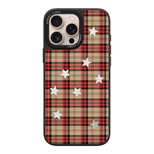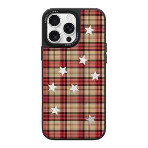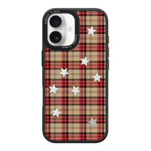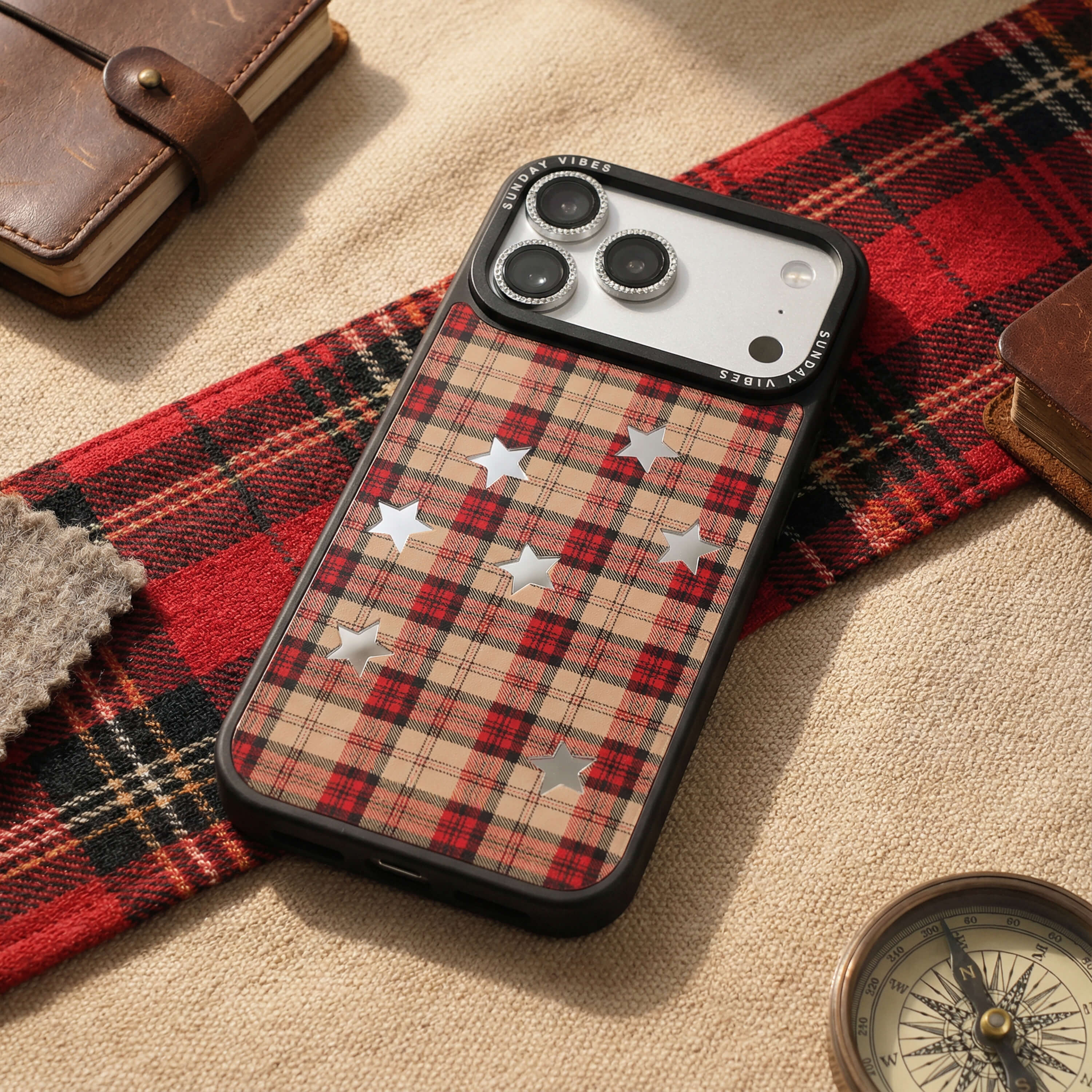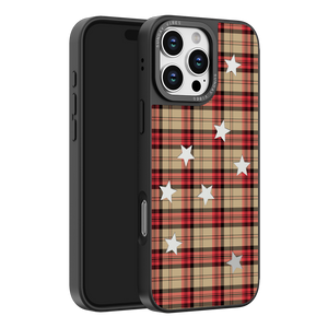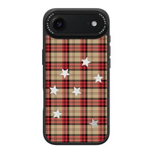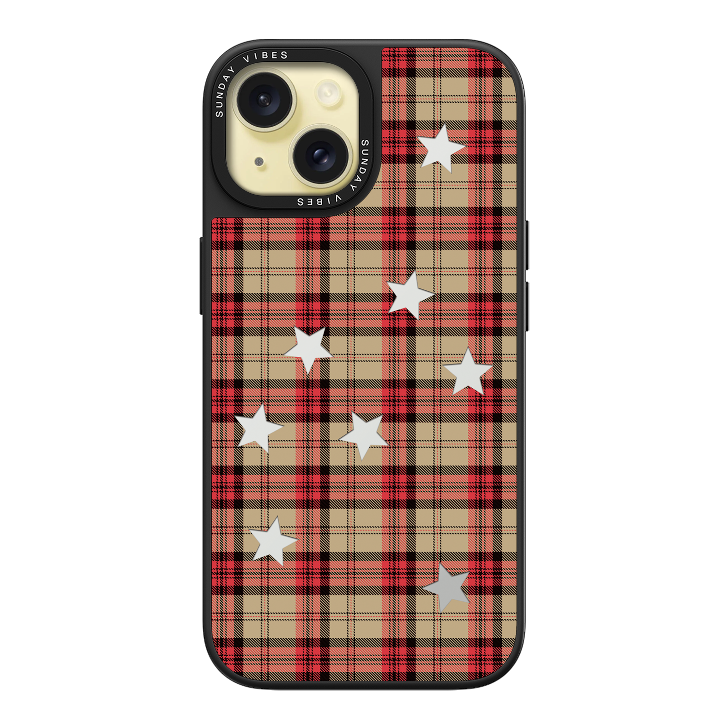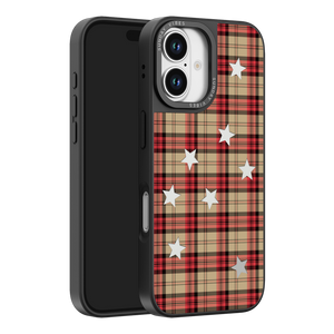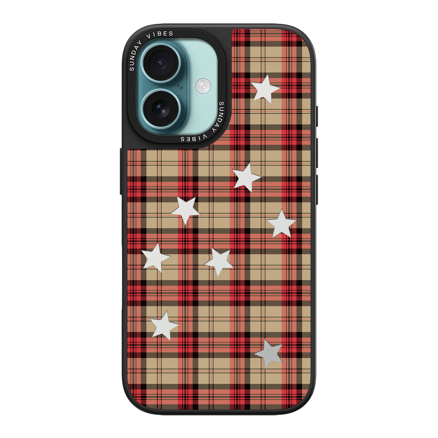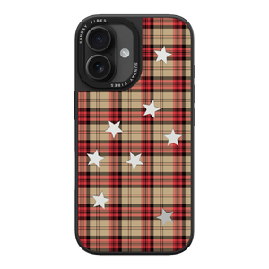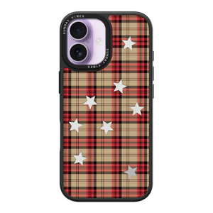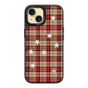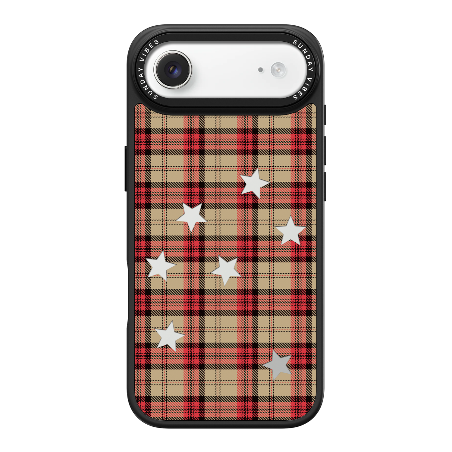 Adorn your device with the luxurious, timeless feel of the Cashmere Star iPhone Case. This striking design showcases a classic tartan pattern blending rich tan, black, and red tones, playfully overlaid with contrasting scattered stars. The design is printed directly onto the high-shine mirror backing, ensuring you are always ready for a quick style check or selfie.