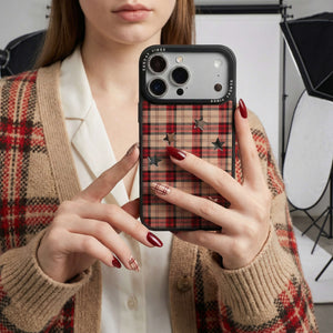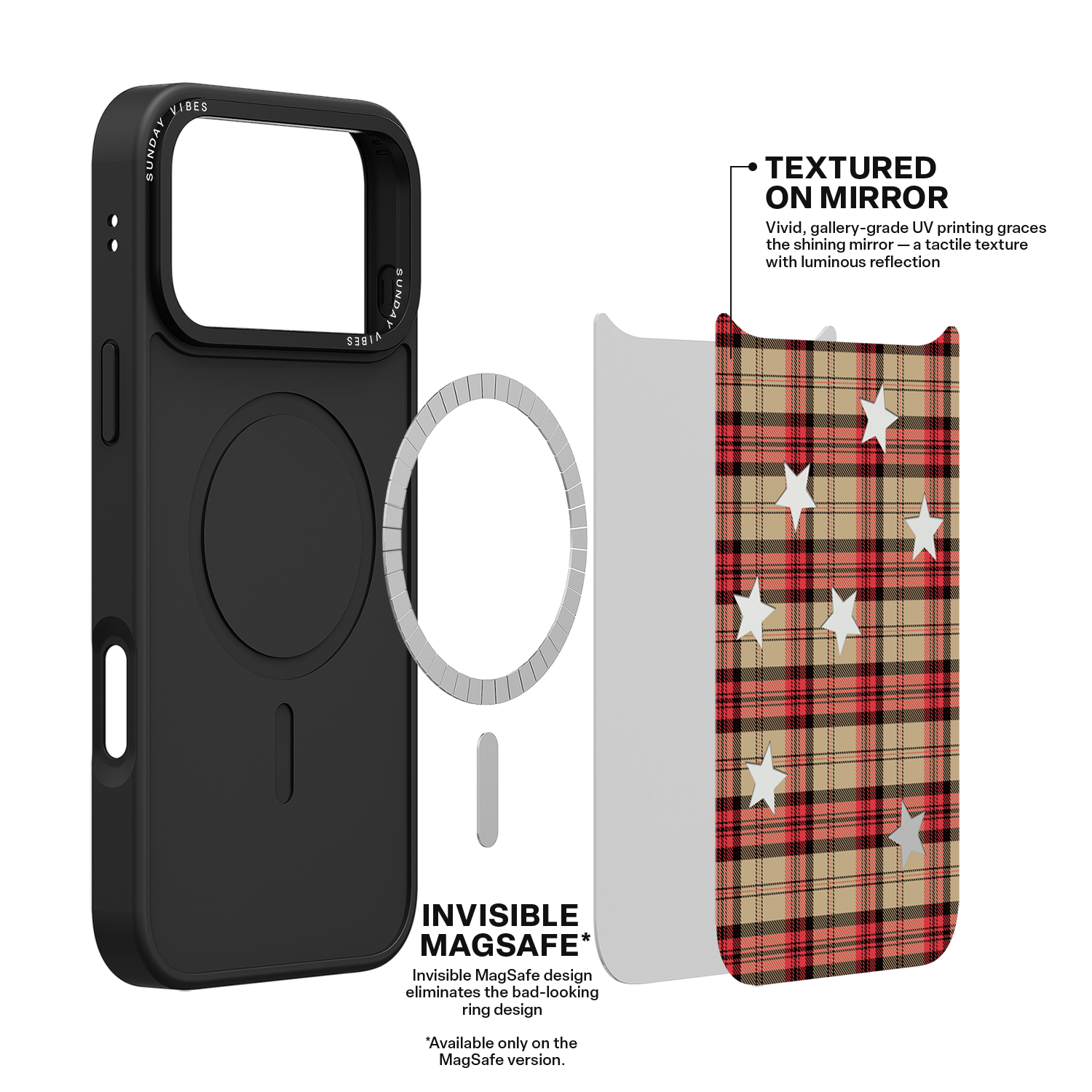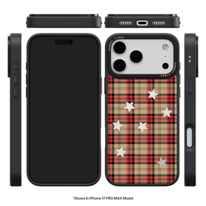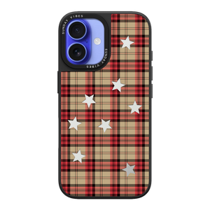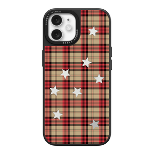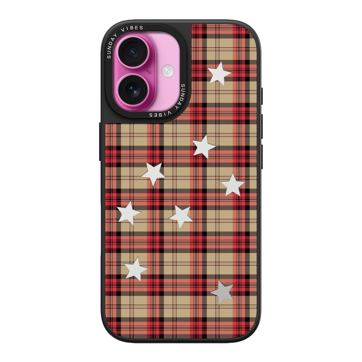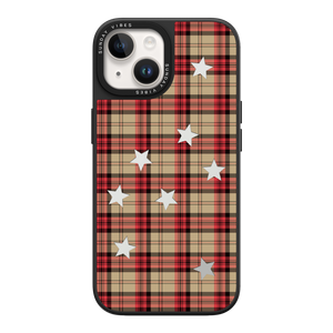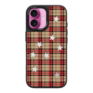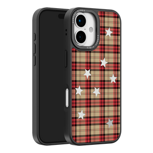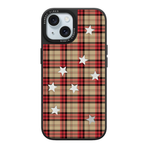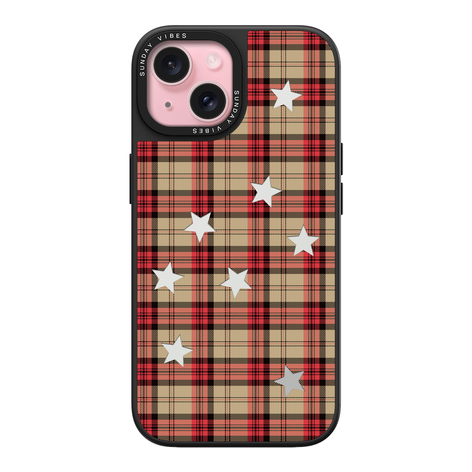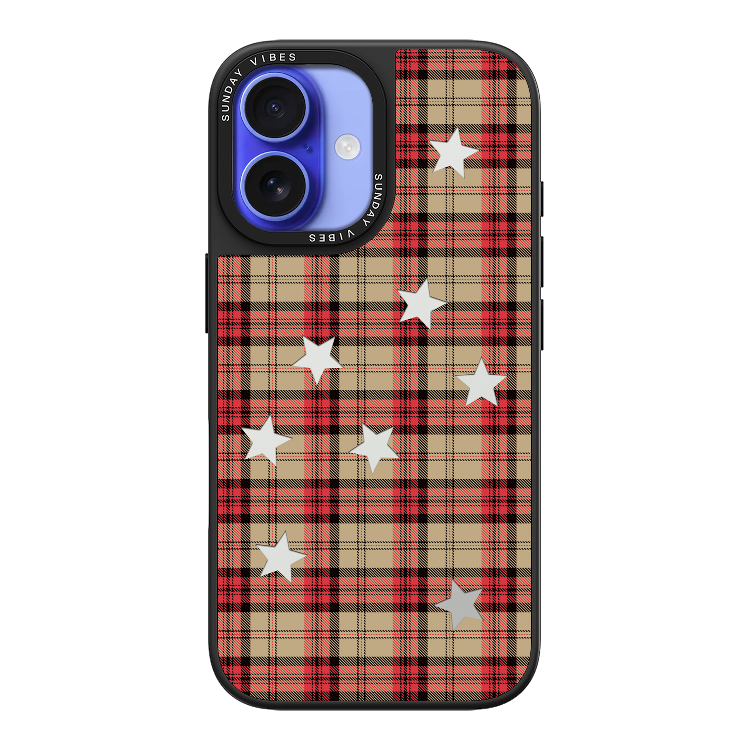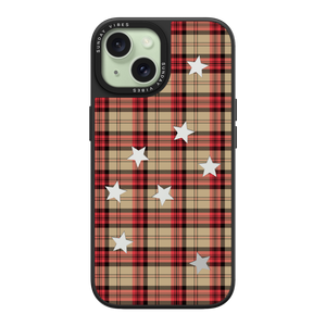 Adorn your device with the luxurious, timeless feel of the Cashmere Star iPhone Case. This striking design showcases a classic tartan pattern blending rich tan, black, and red tones, playfully overlaid with contrasting scattered stars. The design is printed directly onto the high-shine mirror backing, ensuring you are always ready for a quick style check or selfie.
