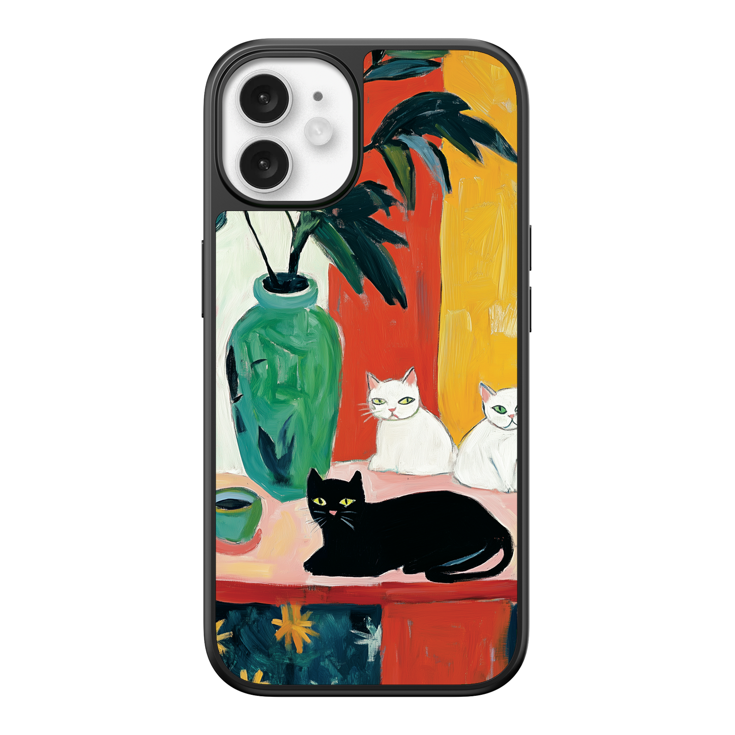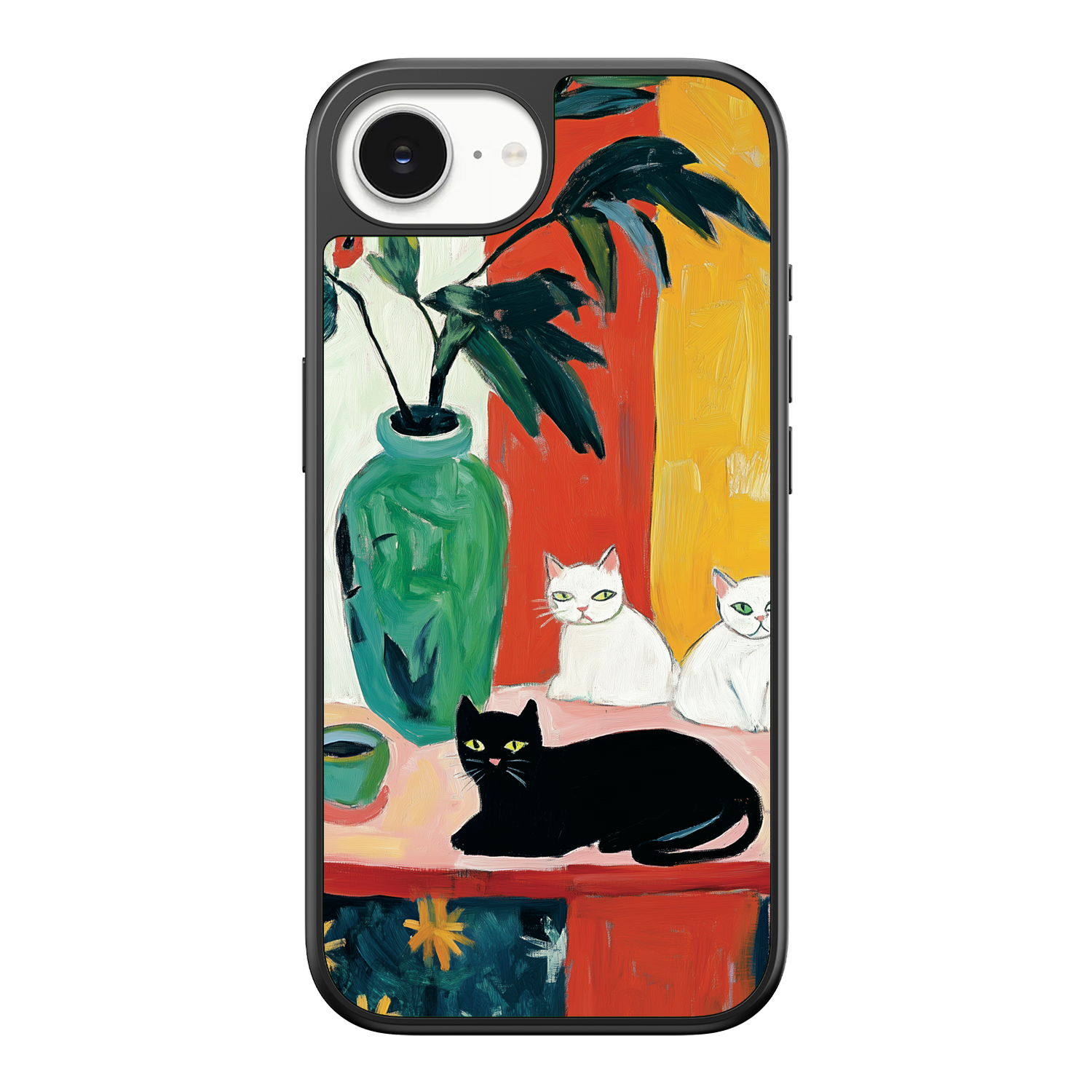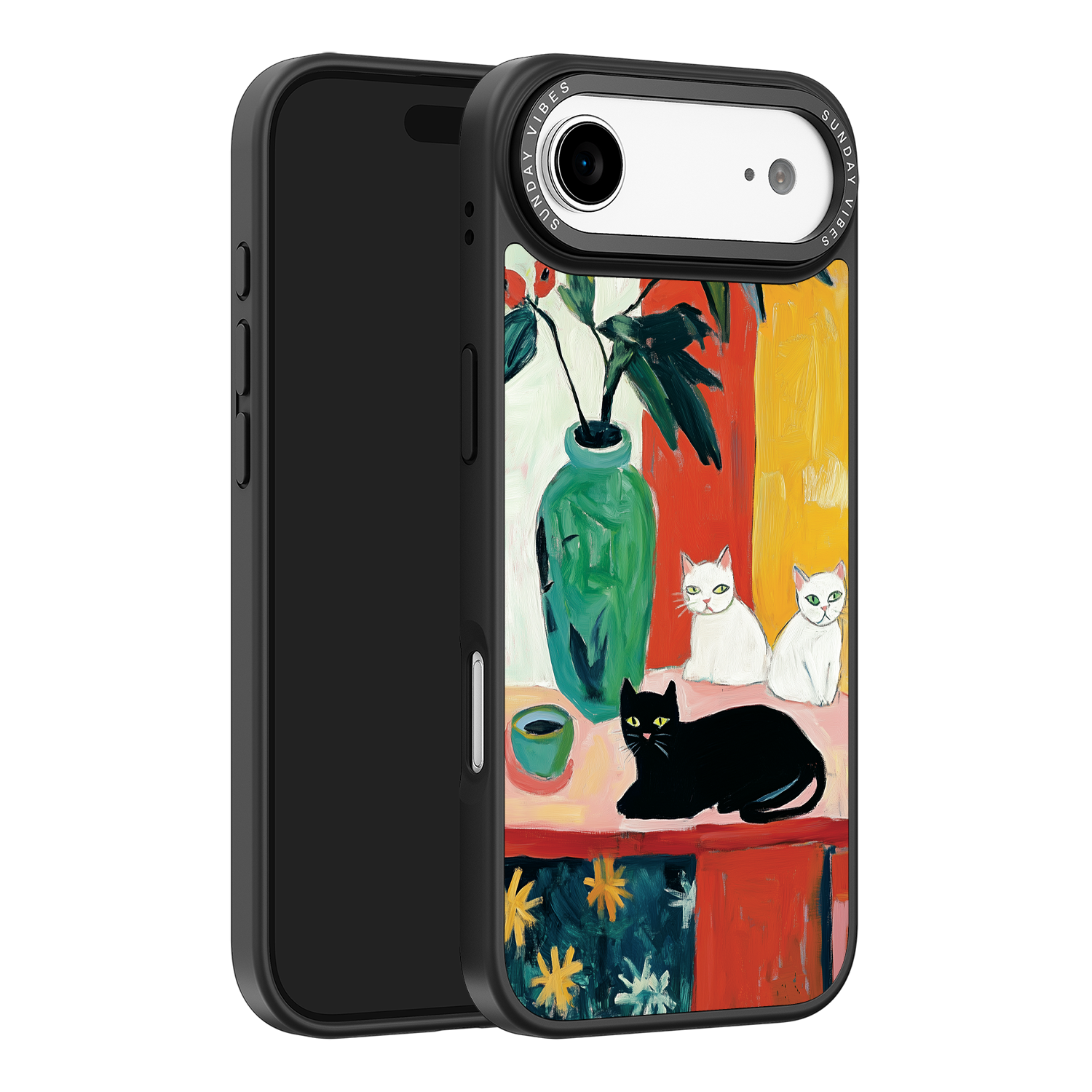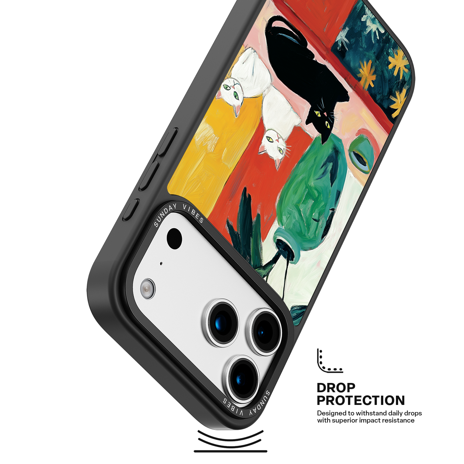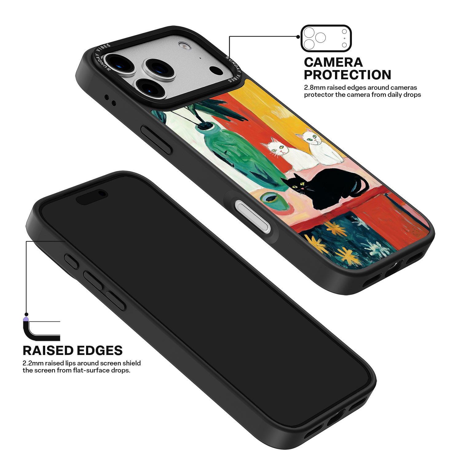 Adorn your device with the bold, quirky charm of the Feline Artistry iPhone Case. This exquisite design captures an expressive, painted scene featuring high-contrast black and white cats set against striking colour blocks of red and yellow. The visible brushstrokes and vivid composition transform your phone into a unique, wearable statement piece that celebrates artistic freedom. The core aesthetic integrity is preserved by the case's premium 3-layer back panel: a base layer for protection, a middle ultra HD gallery print layer for precise detail, and a velvet smooth anti-scratch and anti-fingerprint top coating.