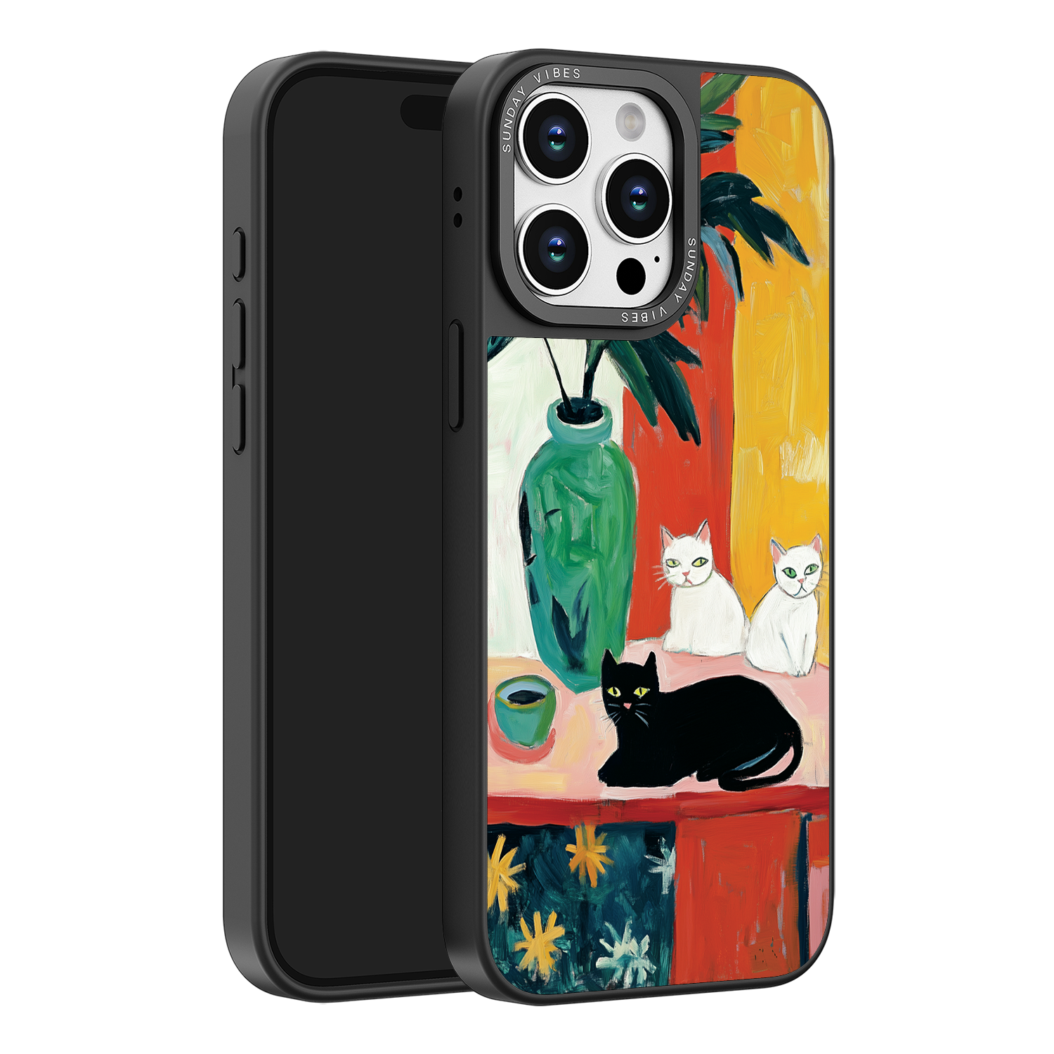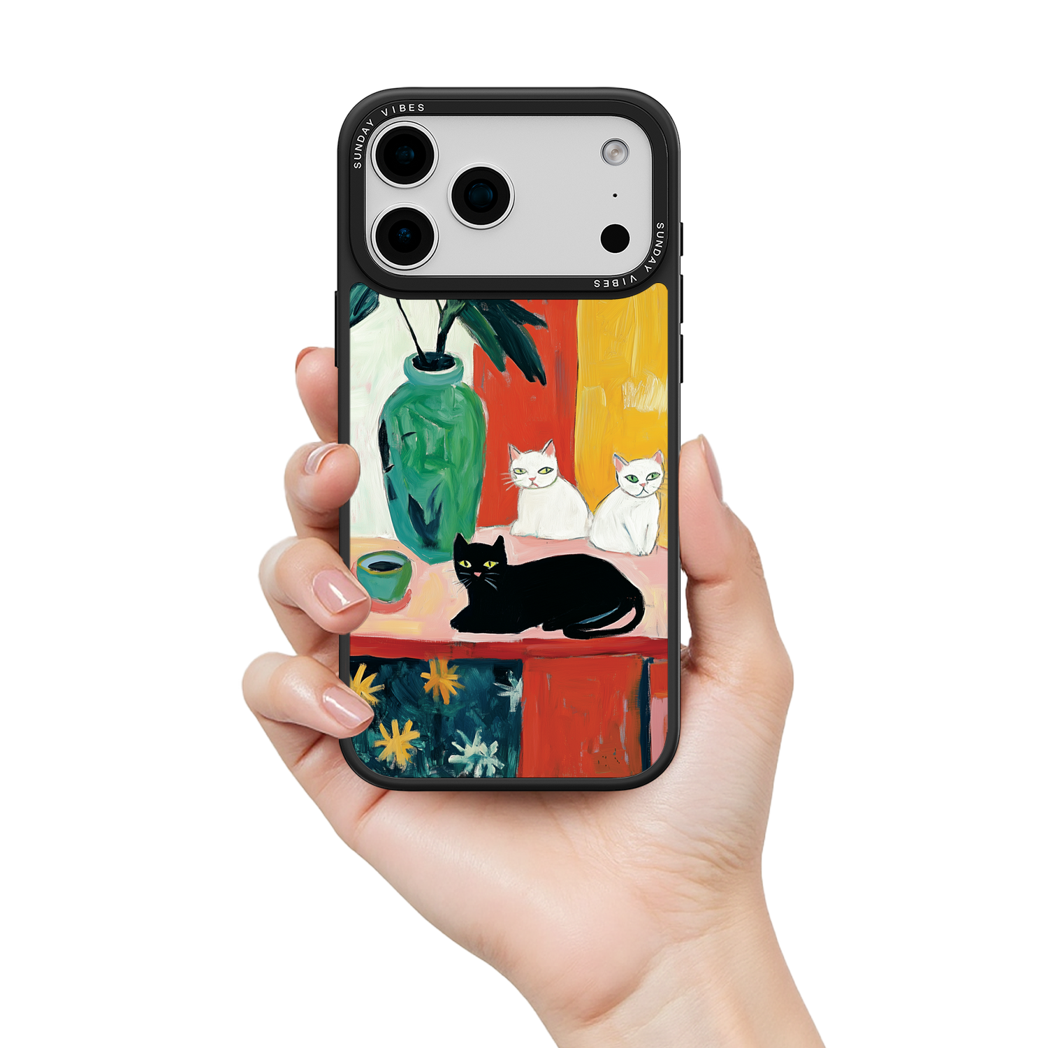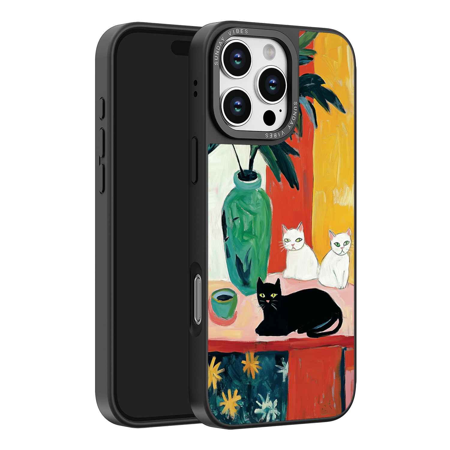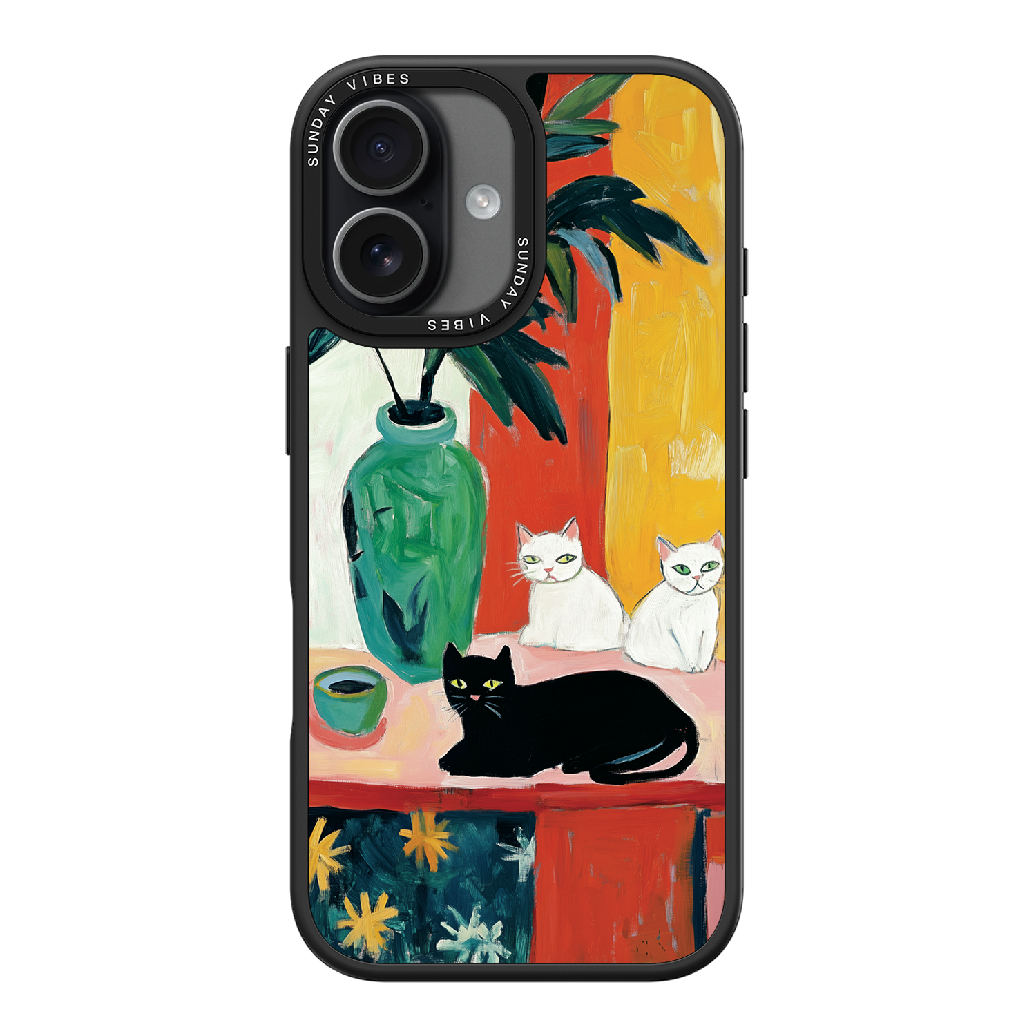 Adorn your device with the bold, quirky charm of the Feline Artistry iPhone Case. This exquisite design captures an expressive, painted scene featuring high-contrast black and white cats set against striking colour blocks of red and yellow. The visible brushstrokes and vivid composition transform your phone into a unique, wearable statement piece that celebrates artistic freedom. The core aesthetic integrity is preserved by the case's premium 3-layer back panel: a base layer for protection, a middle ultra HD gallery print layer for precise detail, and a velvet smooth anti-scratch and anti-fingerprint top coating.
