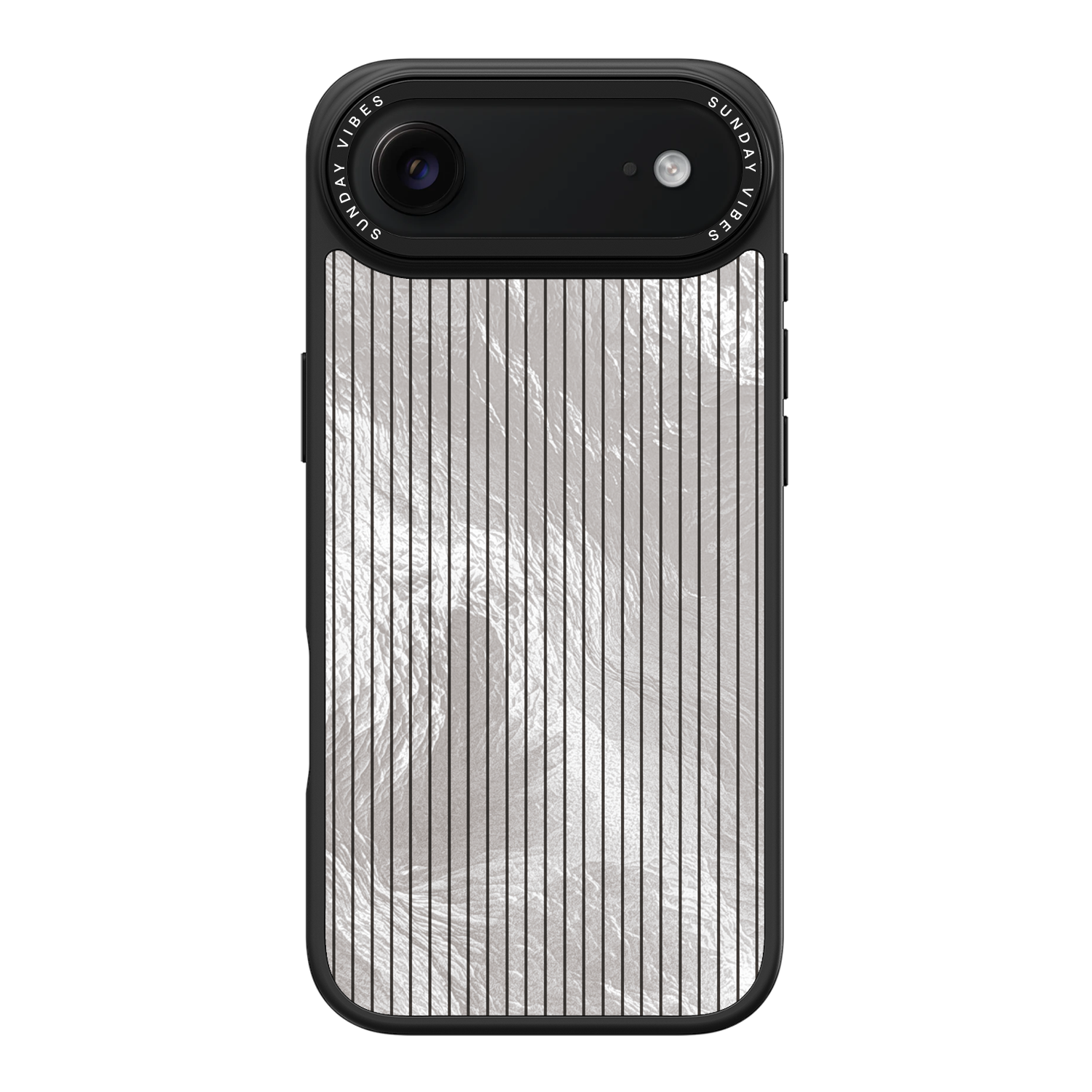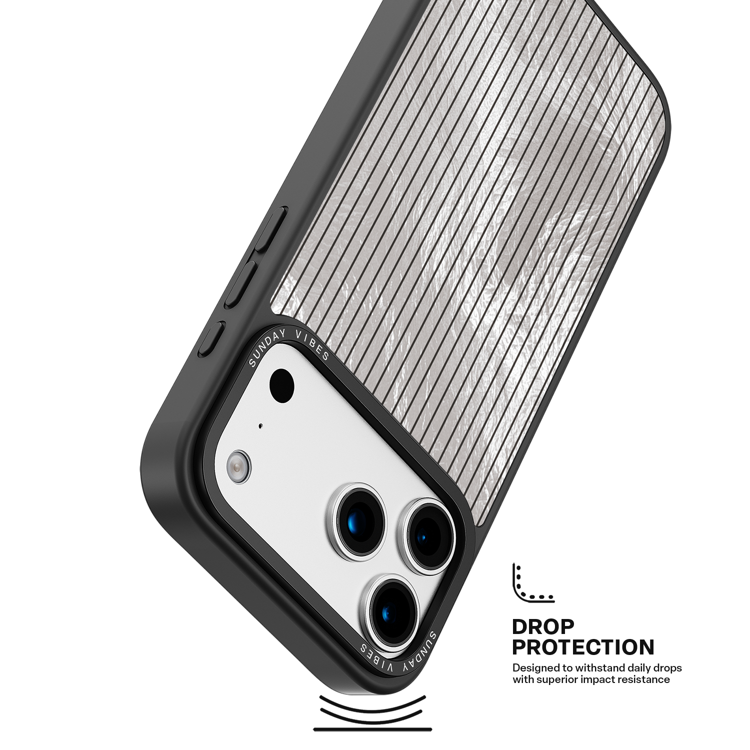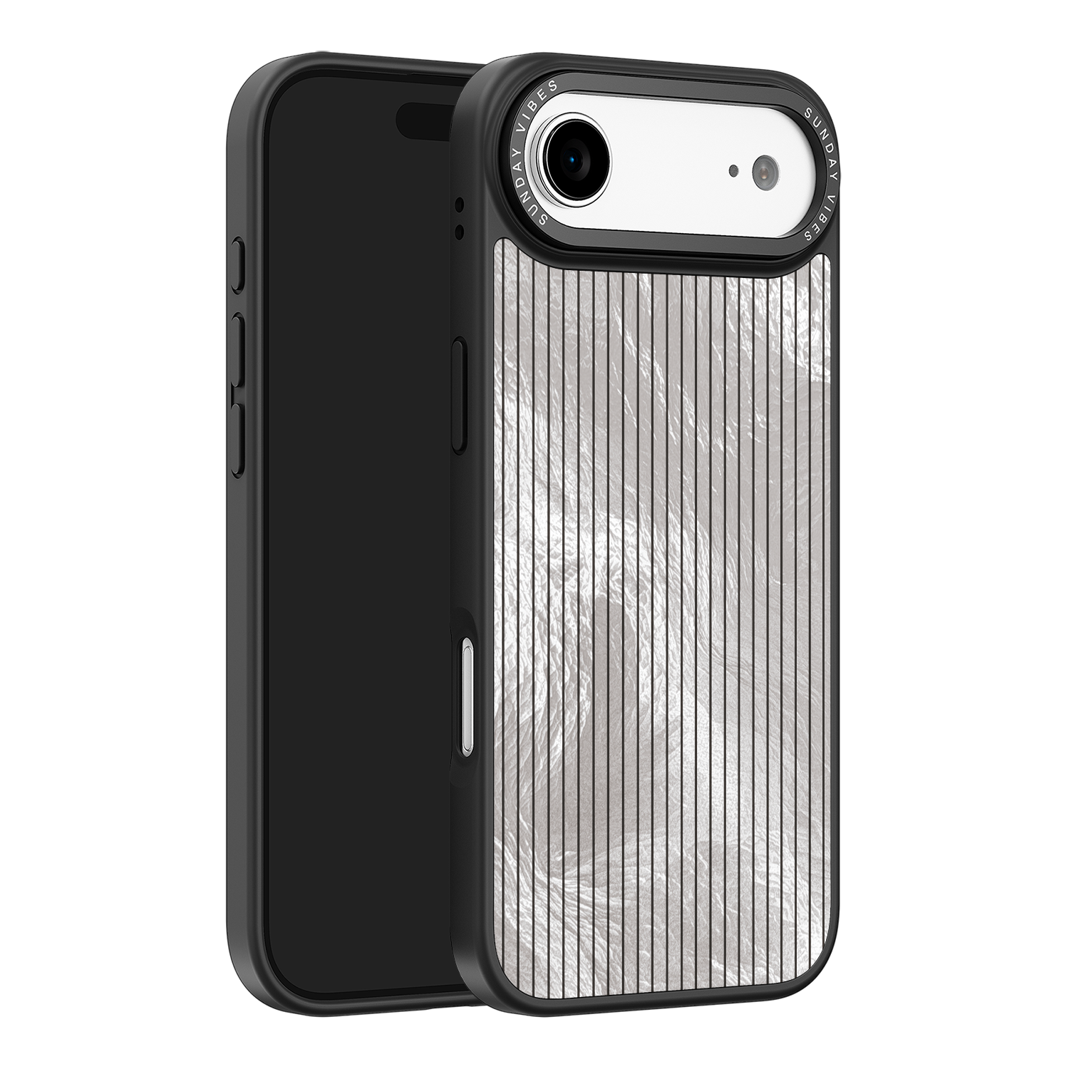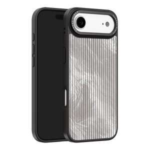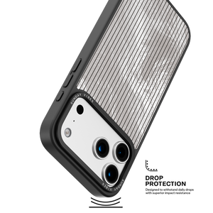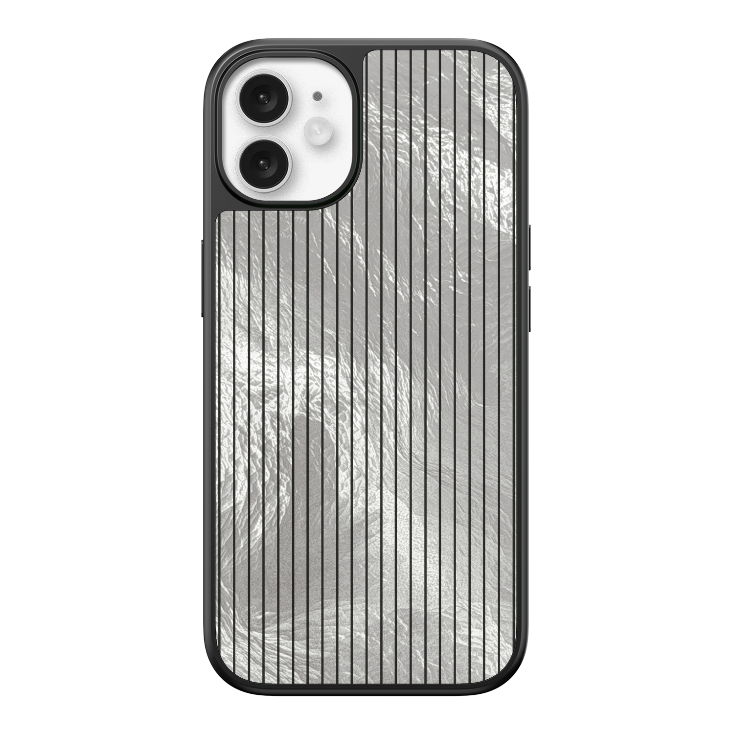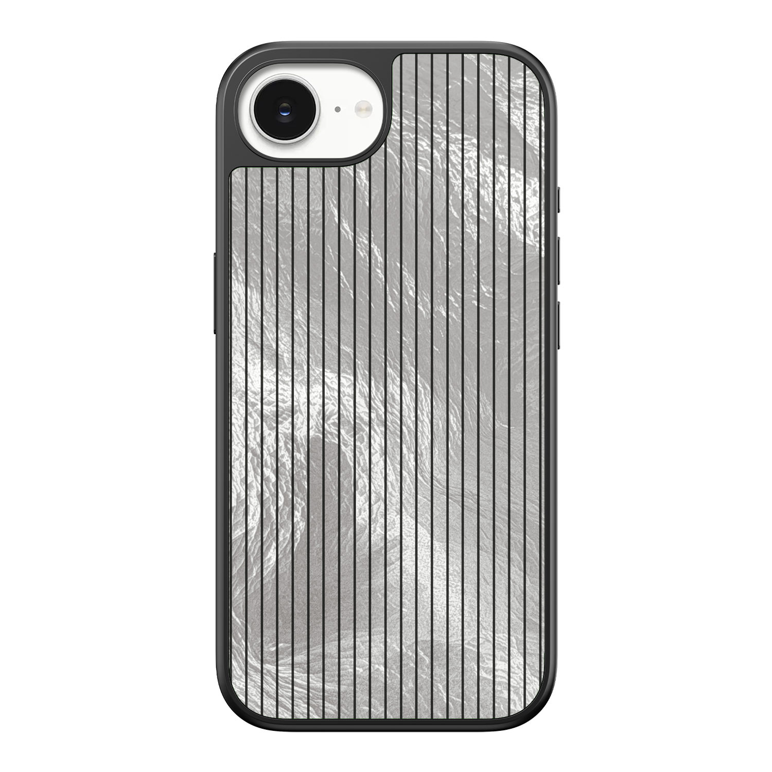Make a futuristic and elegant statement with the Liquid Chrome iPhone Case. This striking design features sharp, black vertical lines contrasting against a brightly textured, light silver holographic background that shimmers like fluid metal. This modern aesthetic is perfect for those who favour sophisticated, high-contrast style. The case's structural integrity is delivered via a premium 3-layer back panel: featuring a base holographic layer with texture, an ultra HD gallery print layer, and a velvet smooth anti-scratch and anti-fingerprint top coating.
