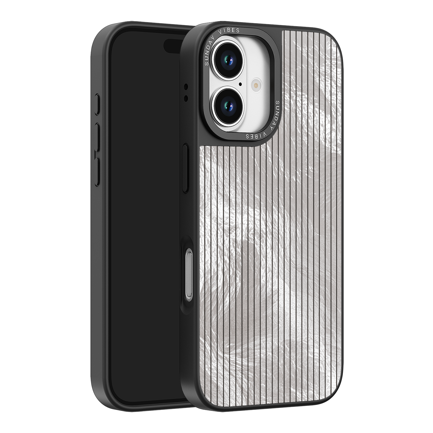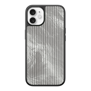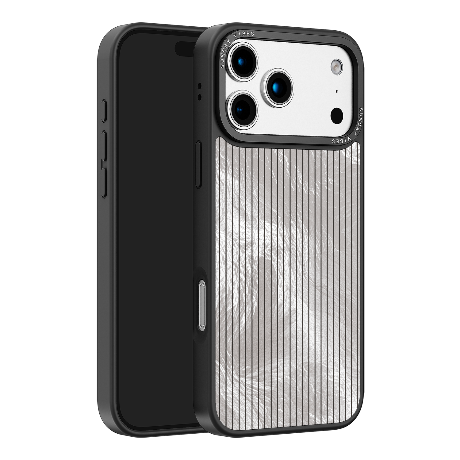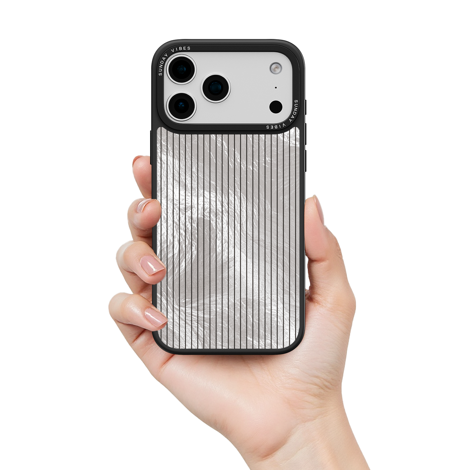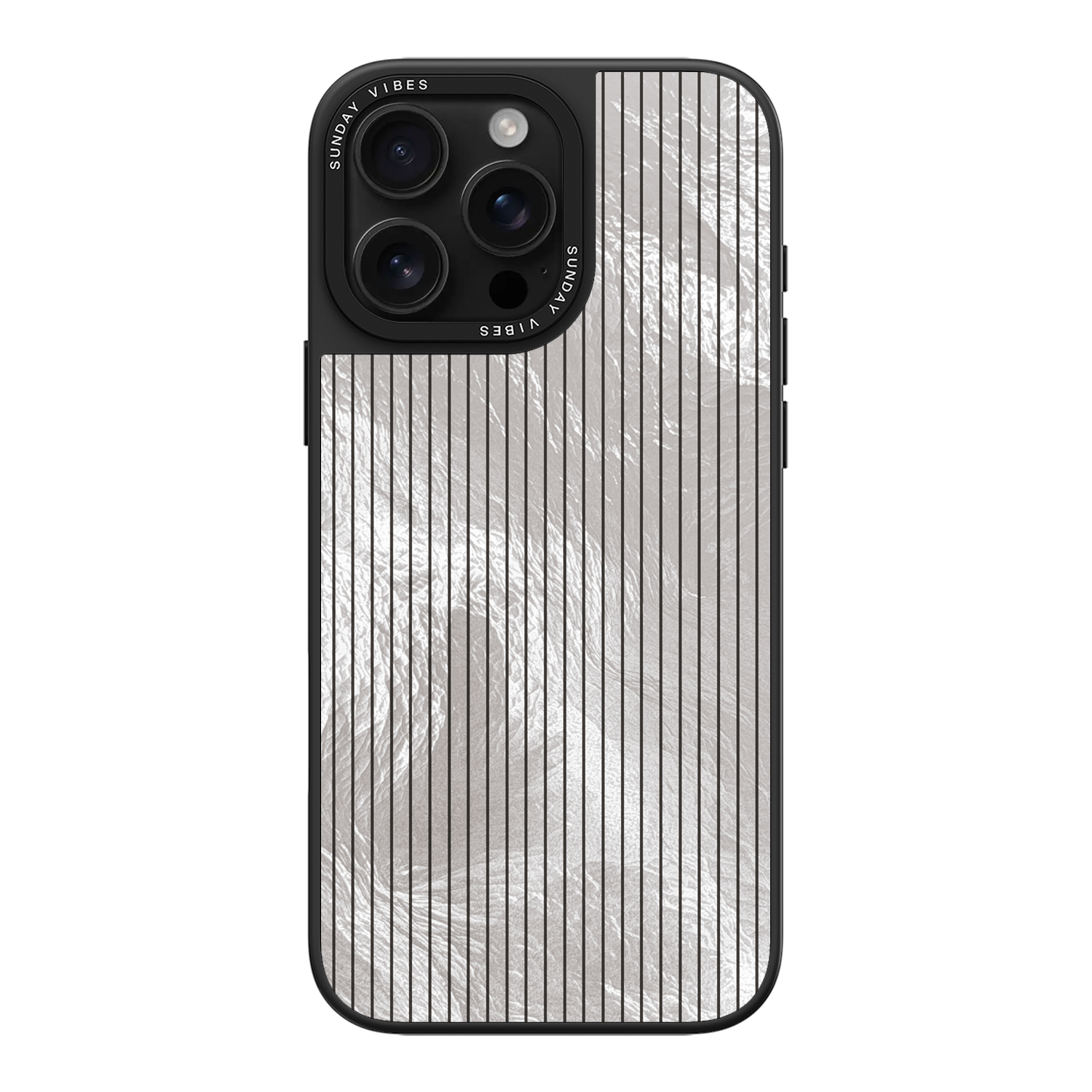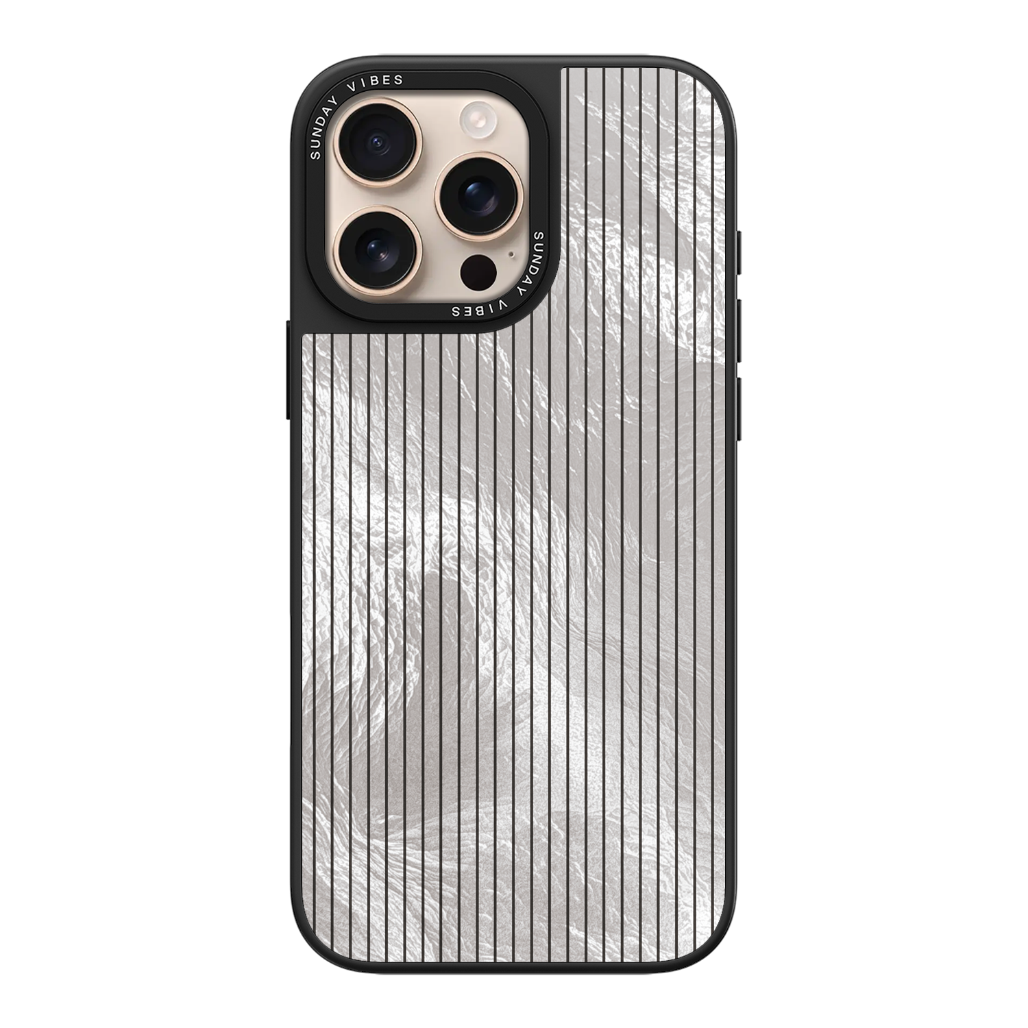 Make a futuristic and elegant statement with the Liquid Chrome iPhone Case. This striking design features sharp, black vertical lines contrasting against a brightly textured, light silver holographic background that shimmers like fluid metal. This modern aesthetic is perfect for those who favour sophisticated, high-contrast style. The case's structural integrity is delivered via a premium 3-layer back panel: featuring a base holographic layer with texture, an ultra HD gallery print layer, and a velvet smooth anti-scratch and anti-fingerprint top coating.