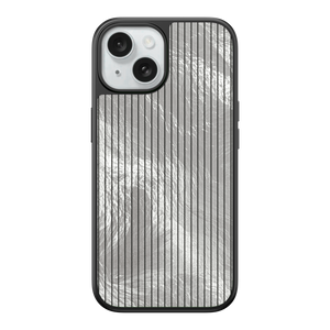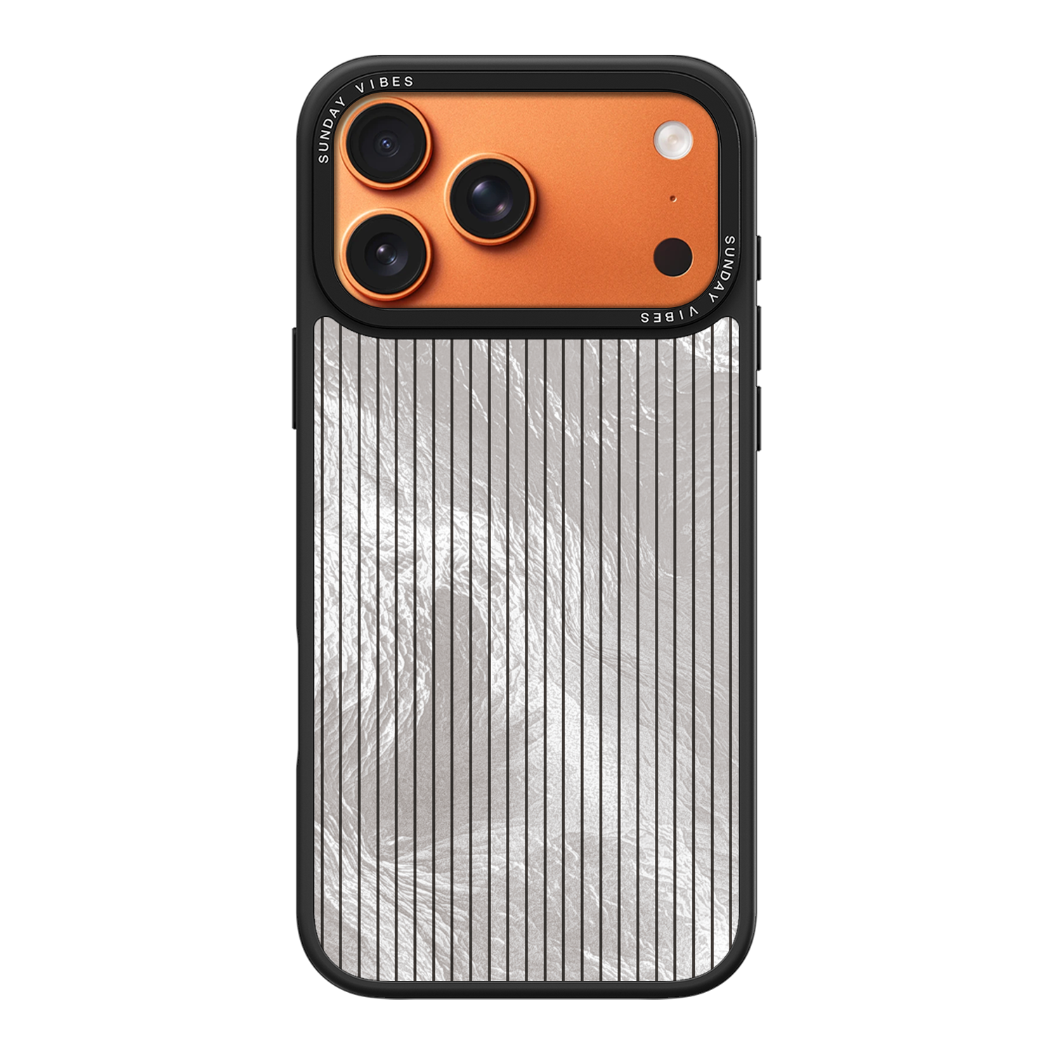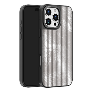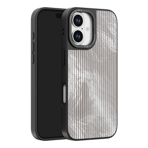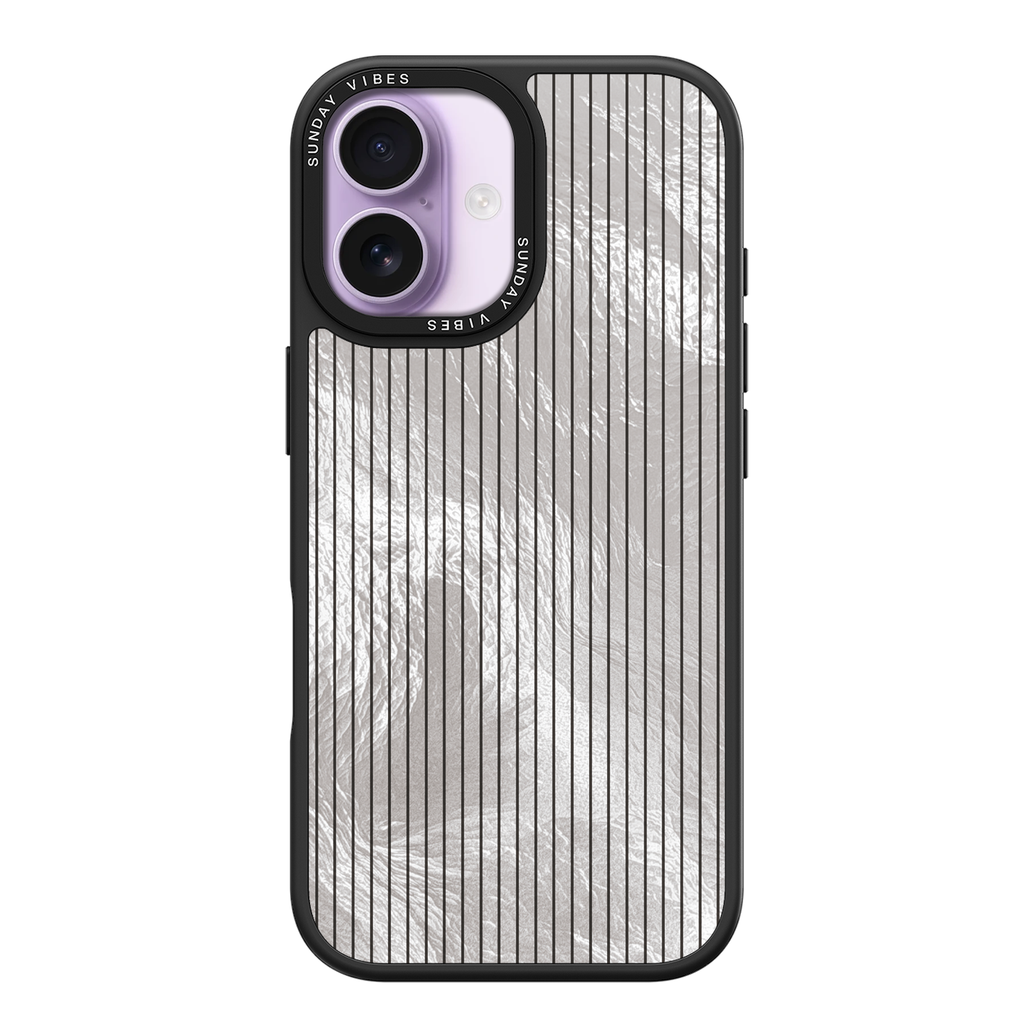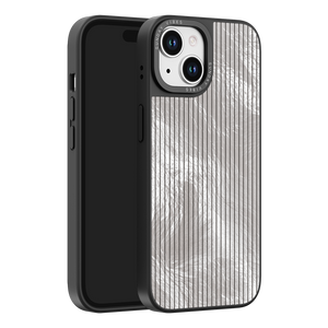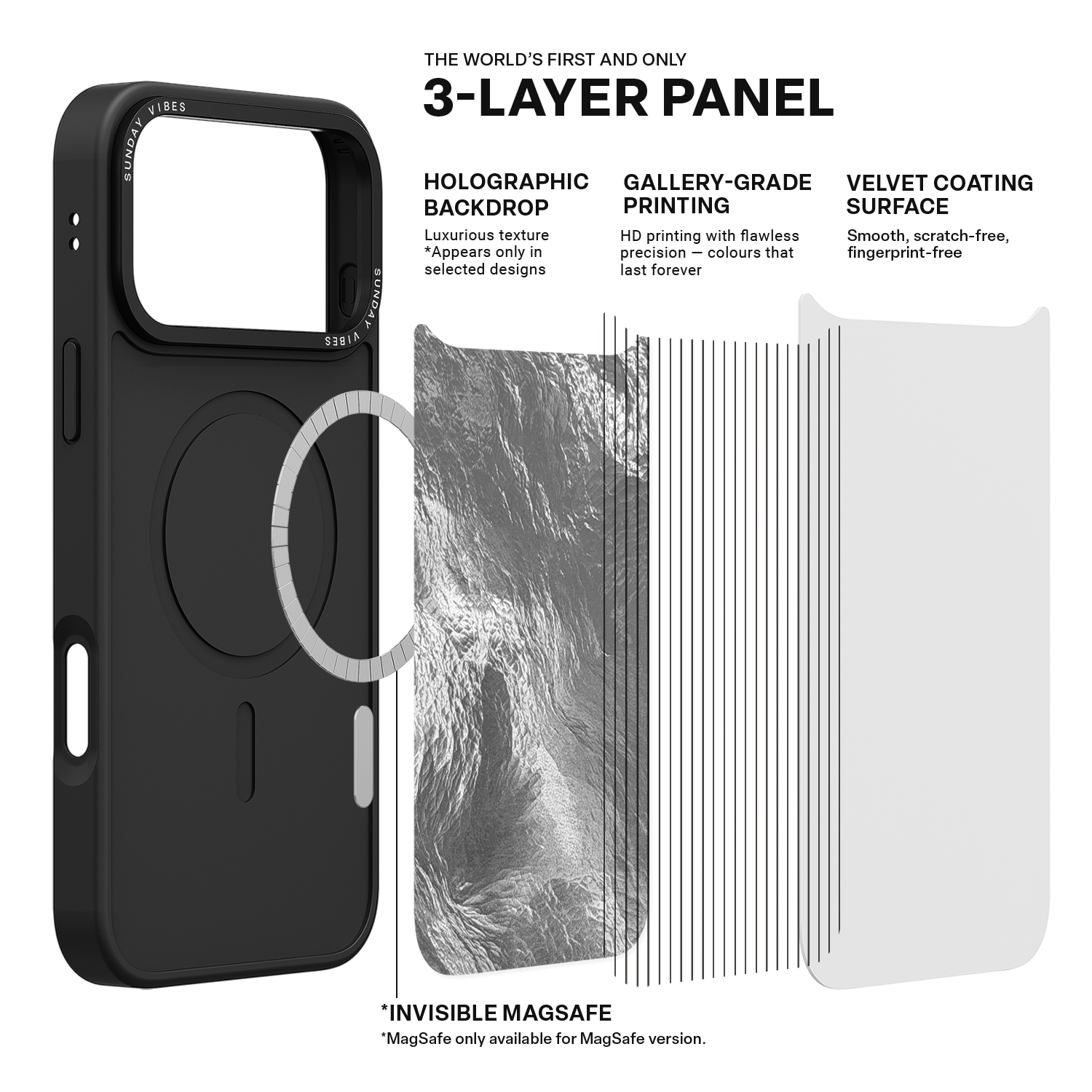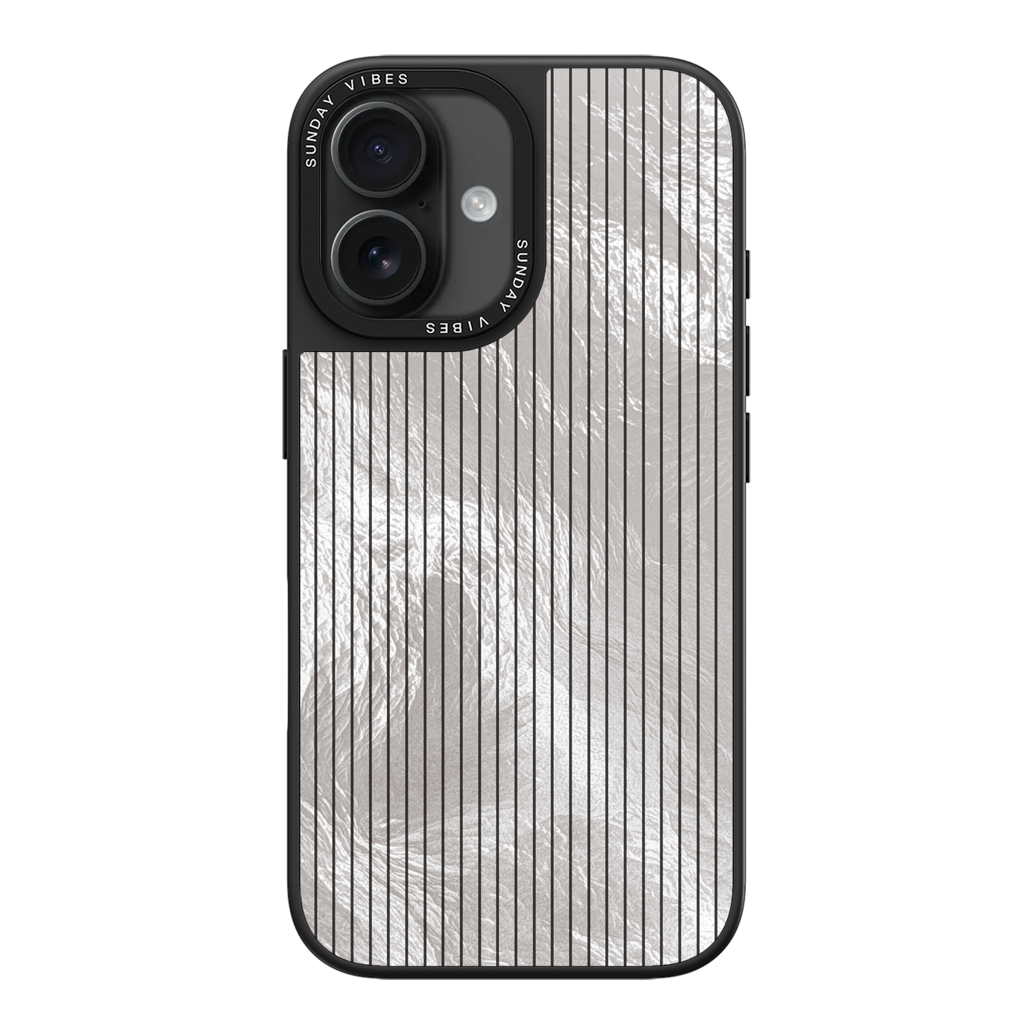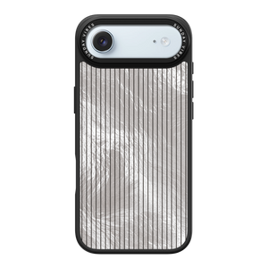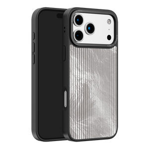 Make a futuristic and elegant statement with the Liquid Chrome iPhone Case. This striking design features sharp, black vertical lines contrasting against a brightly textured, light silver holographic background that shimmers like fluid metal. This modern aesthetic is perfect for those who favour sophisticated, high-contrast style. The case's structural integrity is delivered via a premium 3-layer back panel: featuring a base holographic layer with texture, an ultra HD gallery print layer, and a velvet smooth anti-scratch and anti-fingerprint top coating.