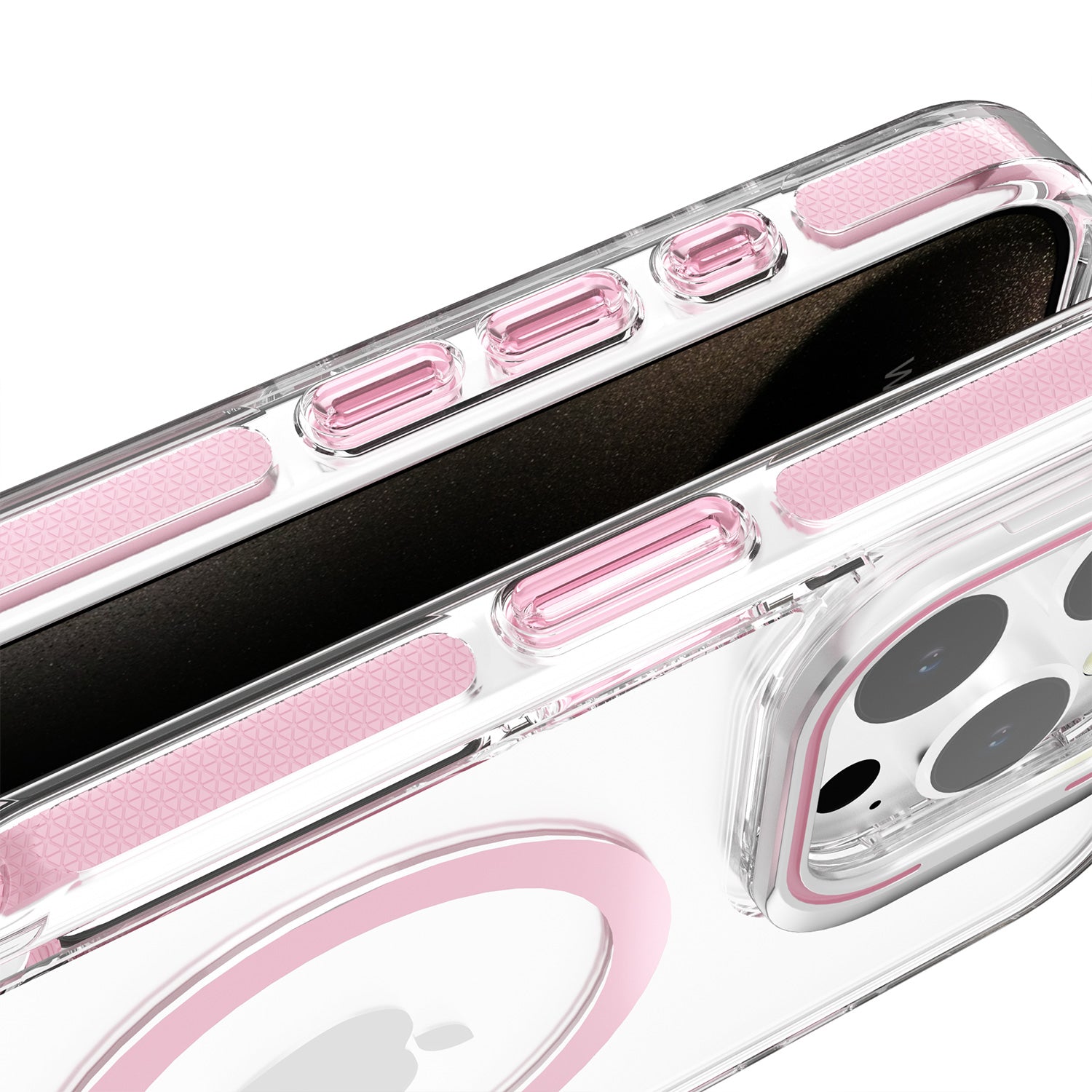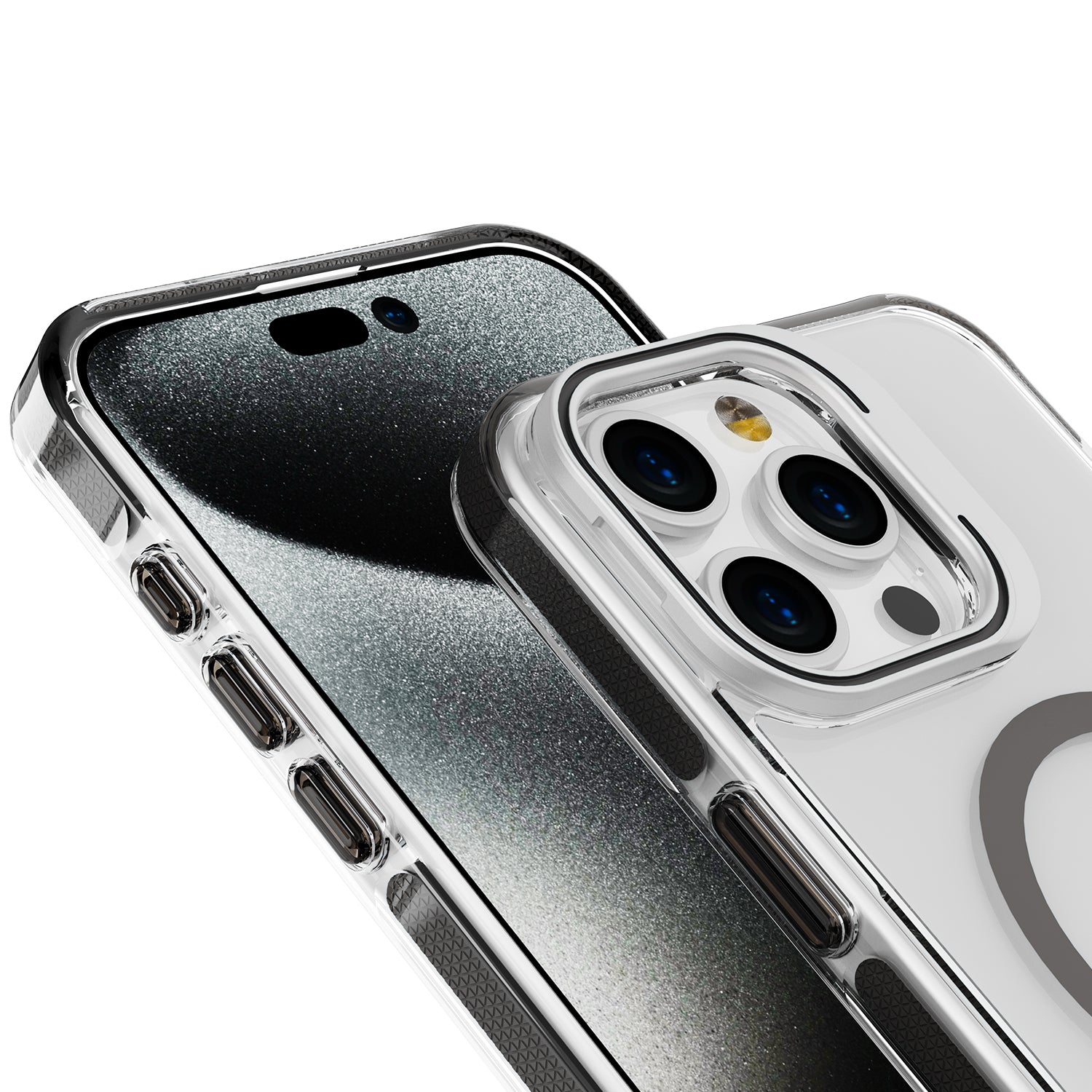 • Crystal Clear Tough Back Panel: Showcases your iPhone’s beauty with a coloured MagSafe ring for added flair.