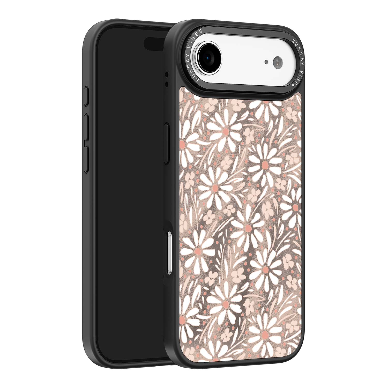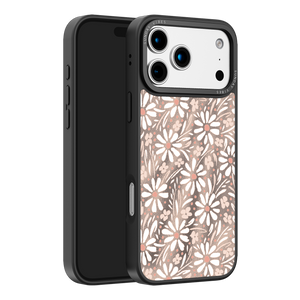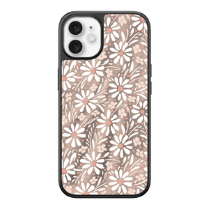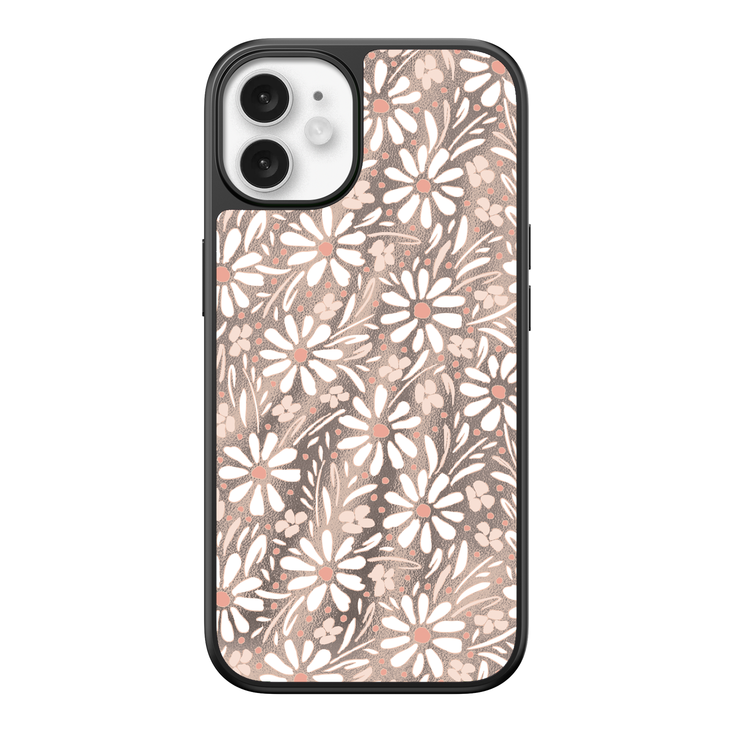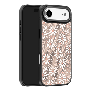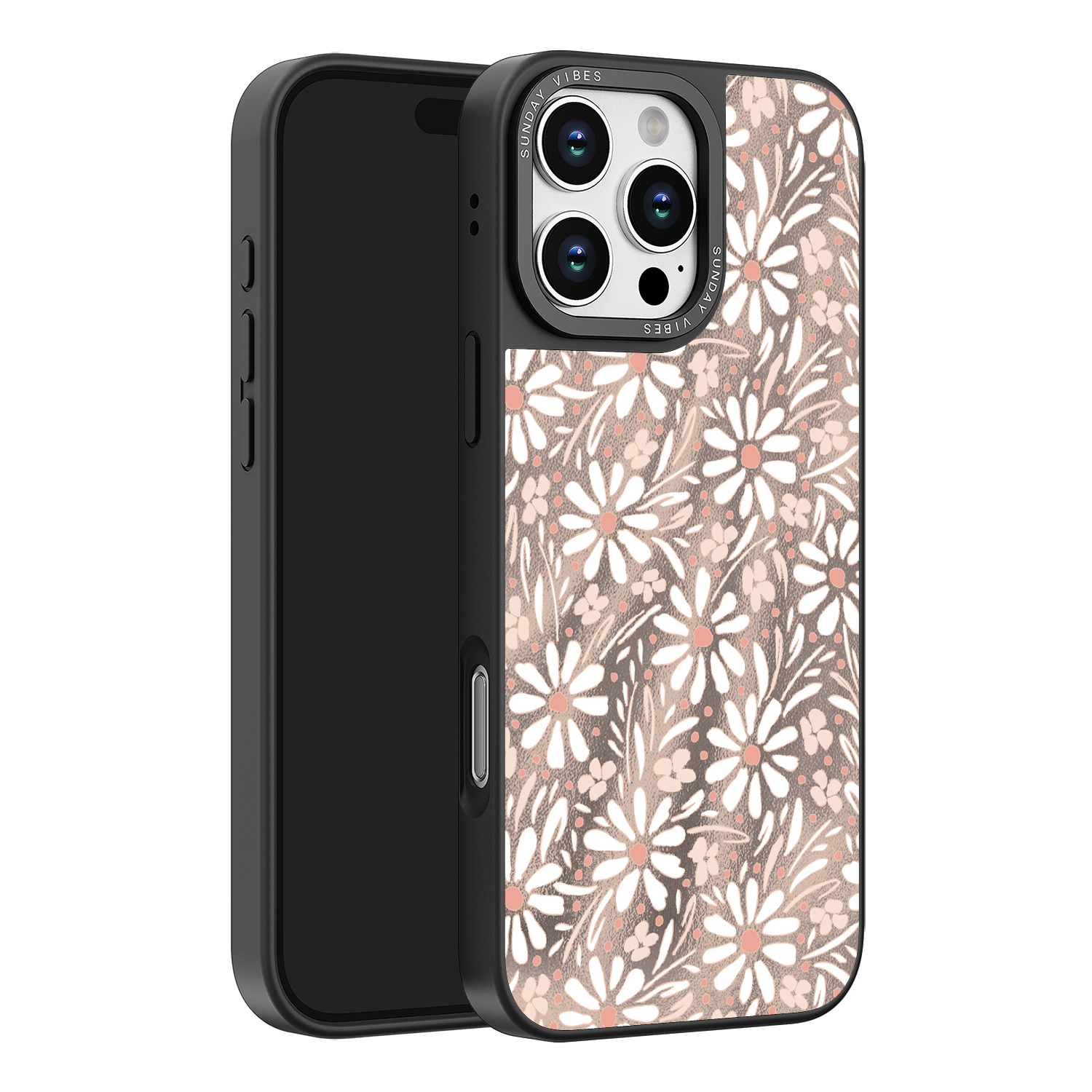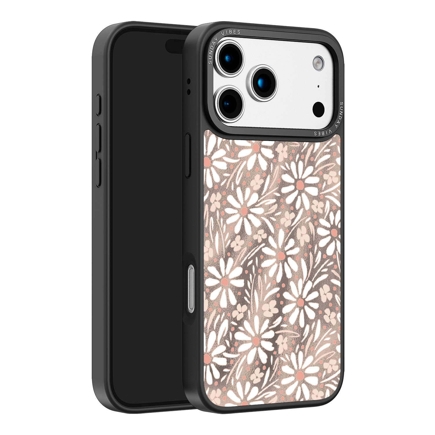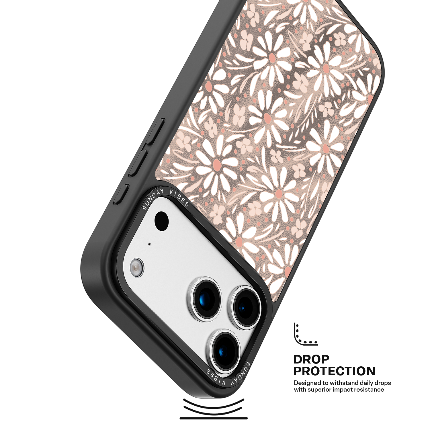 Discover the soft beauty of the Meadow Shimmer iPhone Case. This intricate design features a dense, vintage-style floral pattern of white daisies and delicate foliage, set against a warm, muted background that glows with a subtle holographic shimmer. This unique blend of cozy aesthetic and light-shifting texture creates a truly enchanting style. The case is built with a premium 3-layer back panel: a base holographic layer with texture, a middle ultra HD gallery print layer, and a velvet smooth anti-scratch and anti-fingerprint top coating.