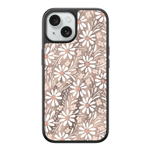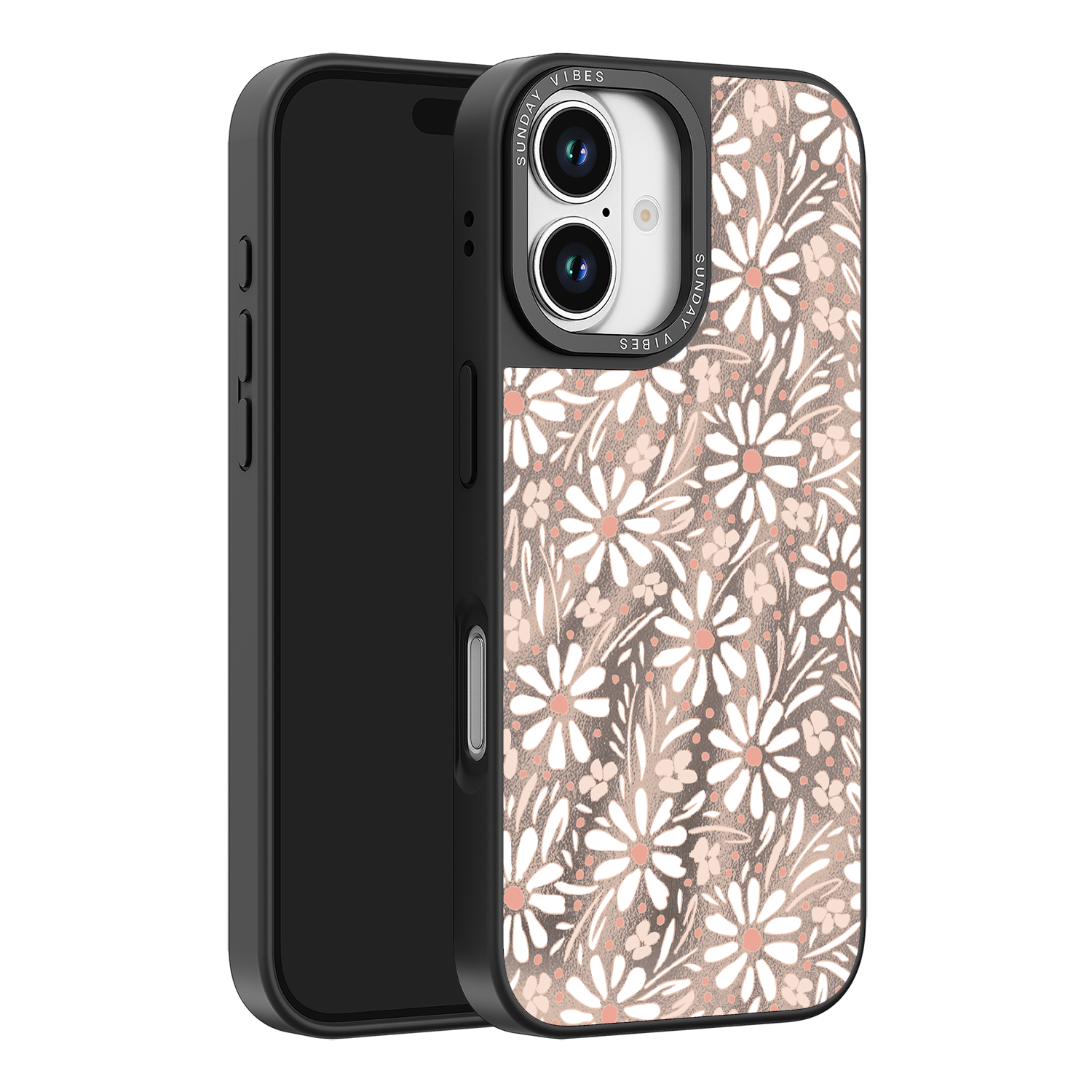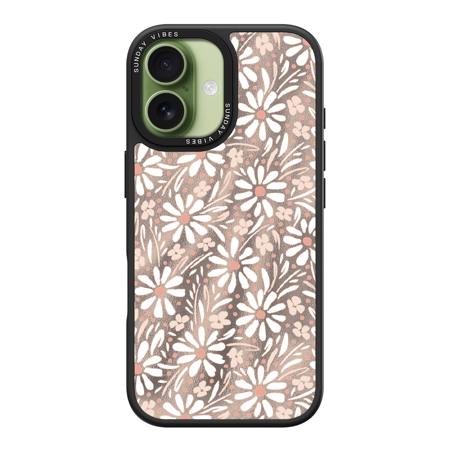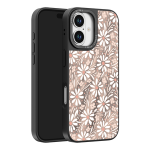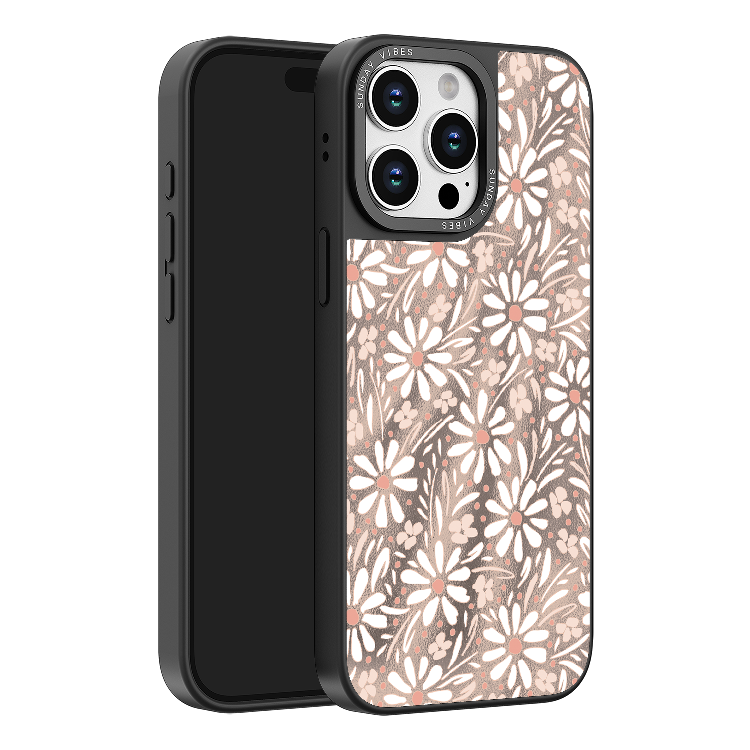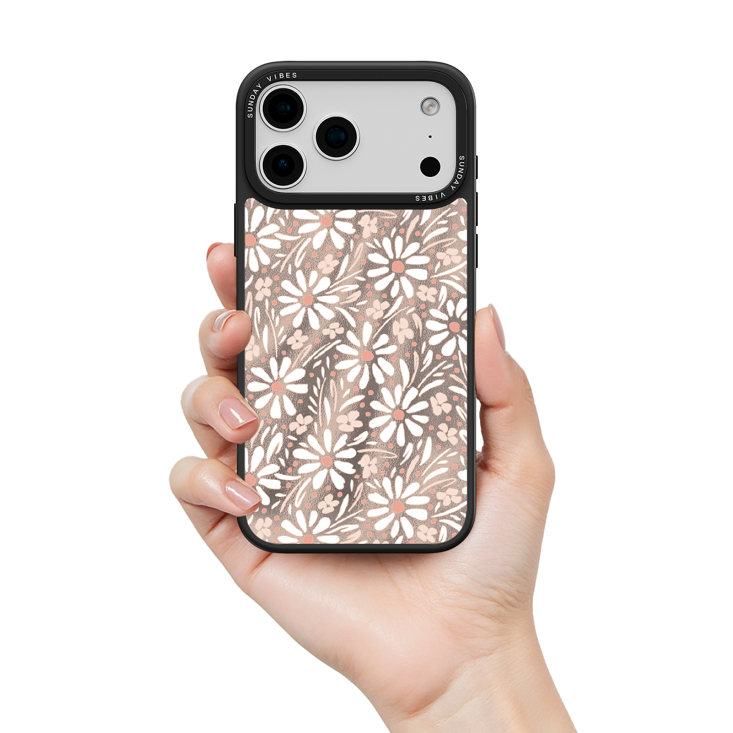 Discover the soft beauty of the Meadow Shimmer iPhone Case. This intricate design features a dense, vintage-style floral pattern of white daisies and delicate foliage, set against a warm, muted background that glows with a subtle holographic shimmer. This unique blend of cozy aesthetic and light-shifting texture creates a truly enchanting style. The case is built with a premium 3-layer back panel: a base holographic layer with texture, a middle ultra HD gallery print layer, and a velvet smooth anti-scratch and anti-fingerprint top coating.