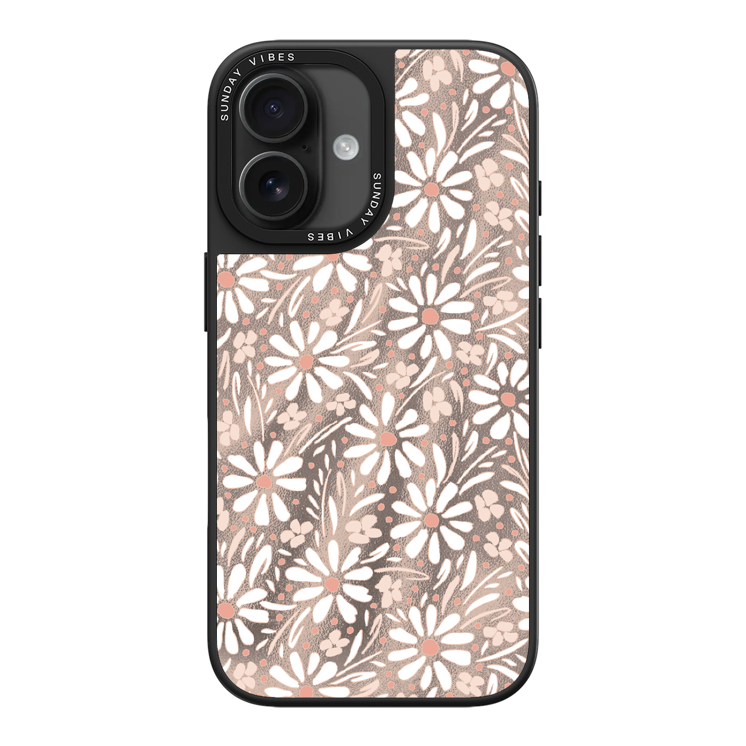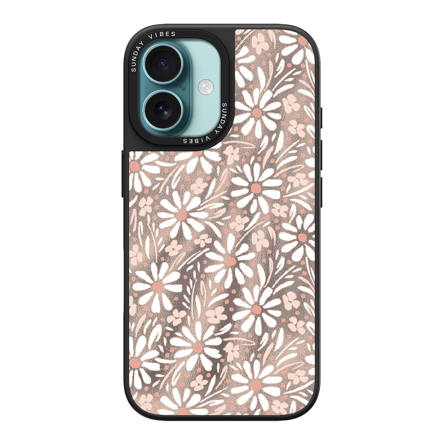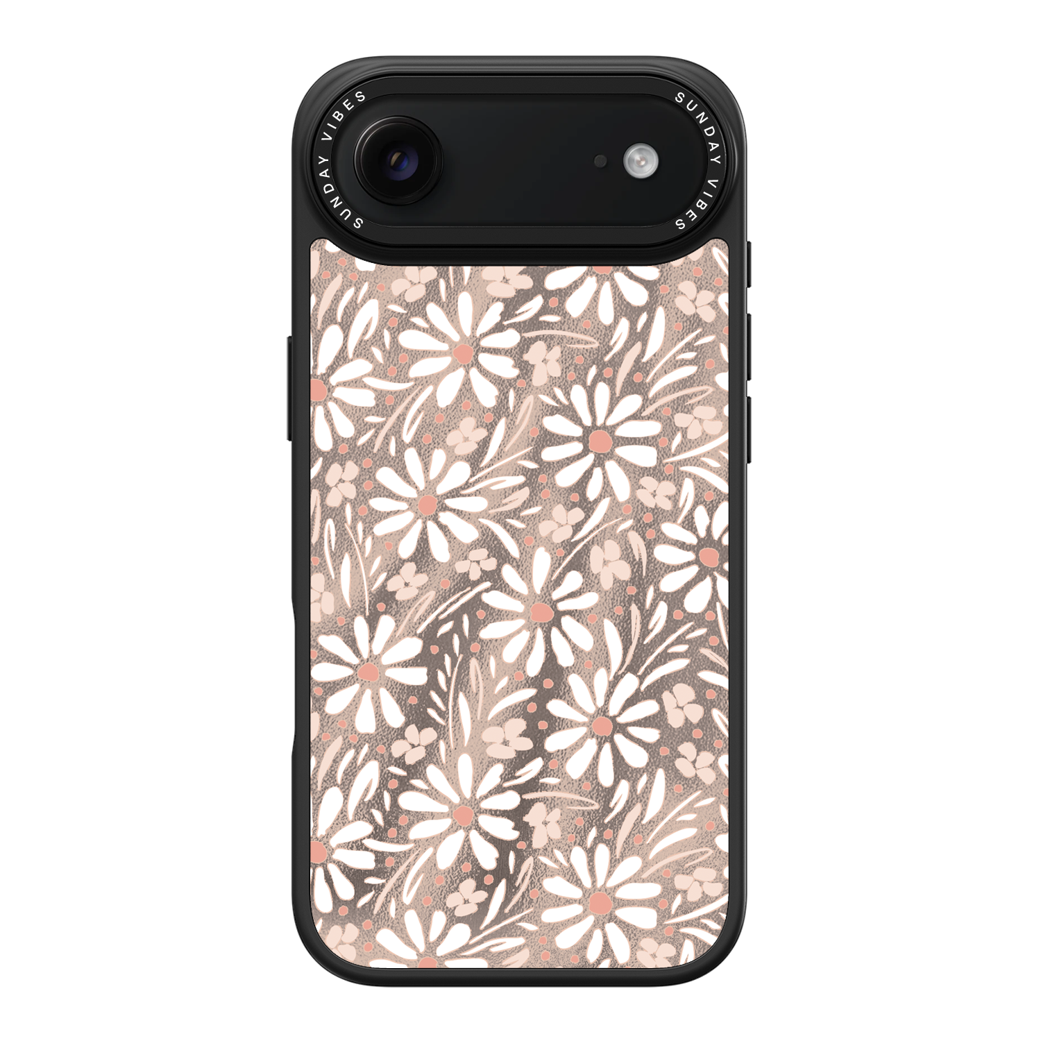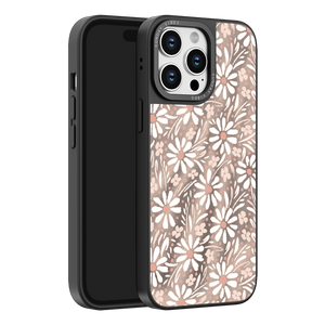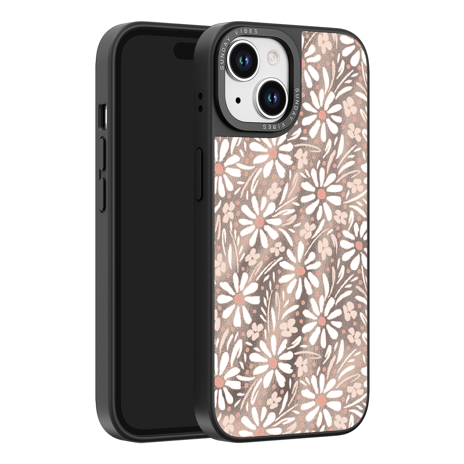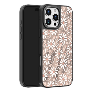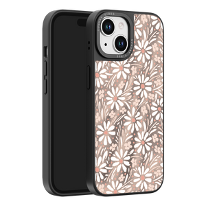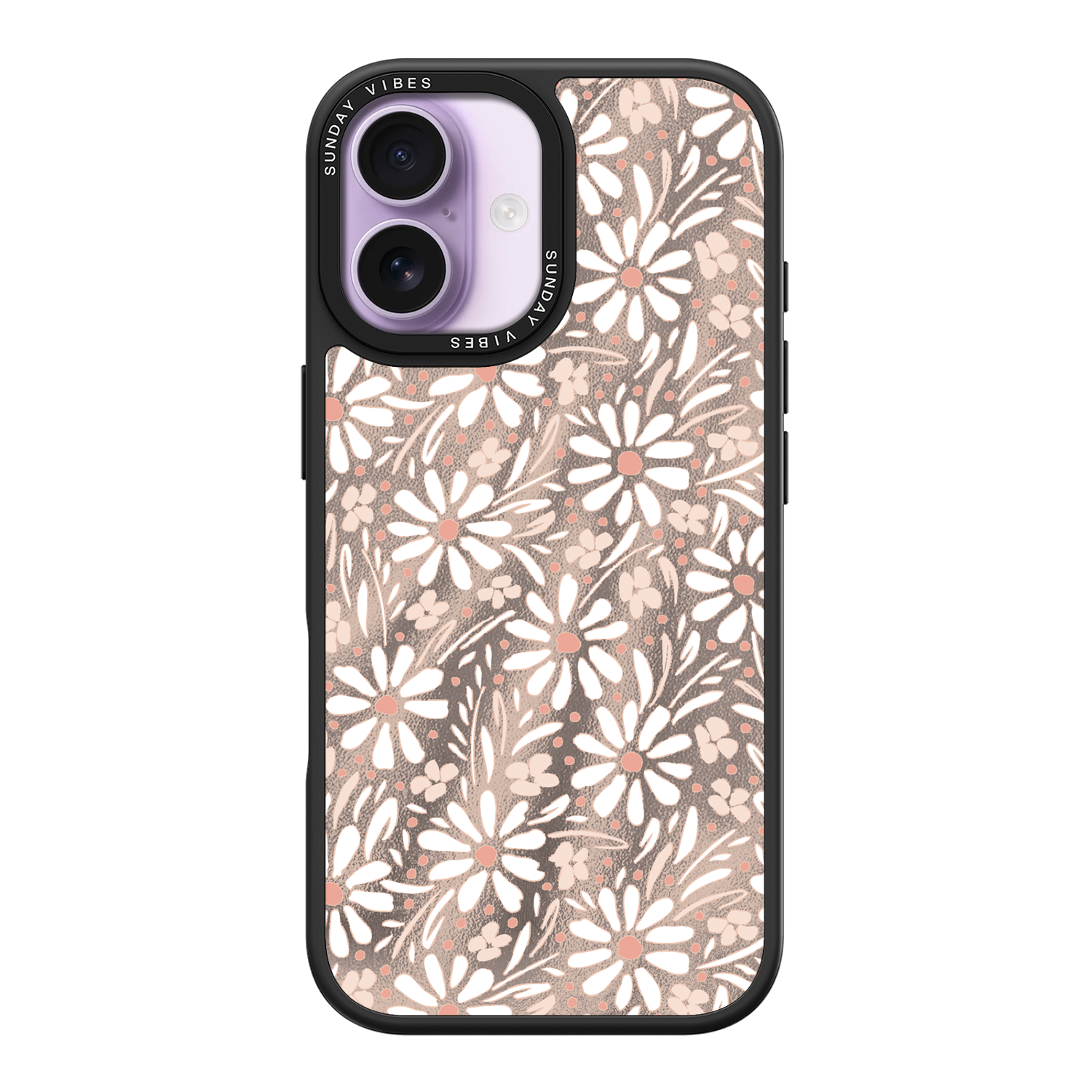 Discover the soft beauty of the Meadow Shimmer iPhone Case. This intricate design features a dense, vintage-style floral pattern of white daisies and delicate foliage, set against a warm, muted background that glows with a subtle holographic shimmer. This unique blend of cozy aesthetic and light-shifting texture creates a truly enchanting style. The case is built with a premium 3-layer back panel: a base holographic layer with texture, a middle ultra HD gallery print layer, and a velvet smooth anti-scratch and anti-fingerprint top coating.