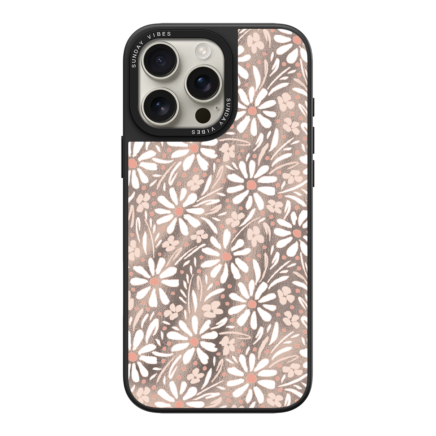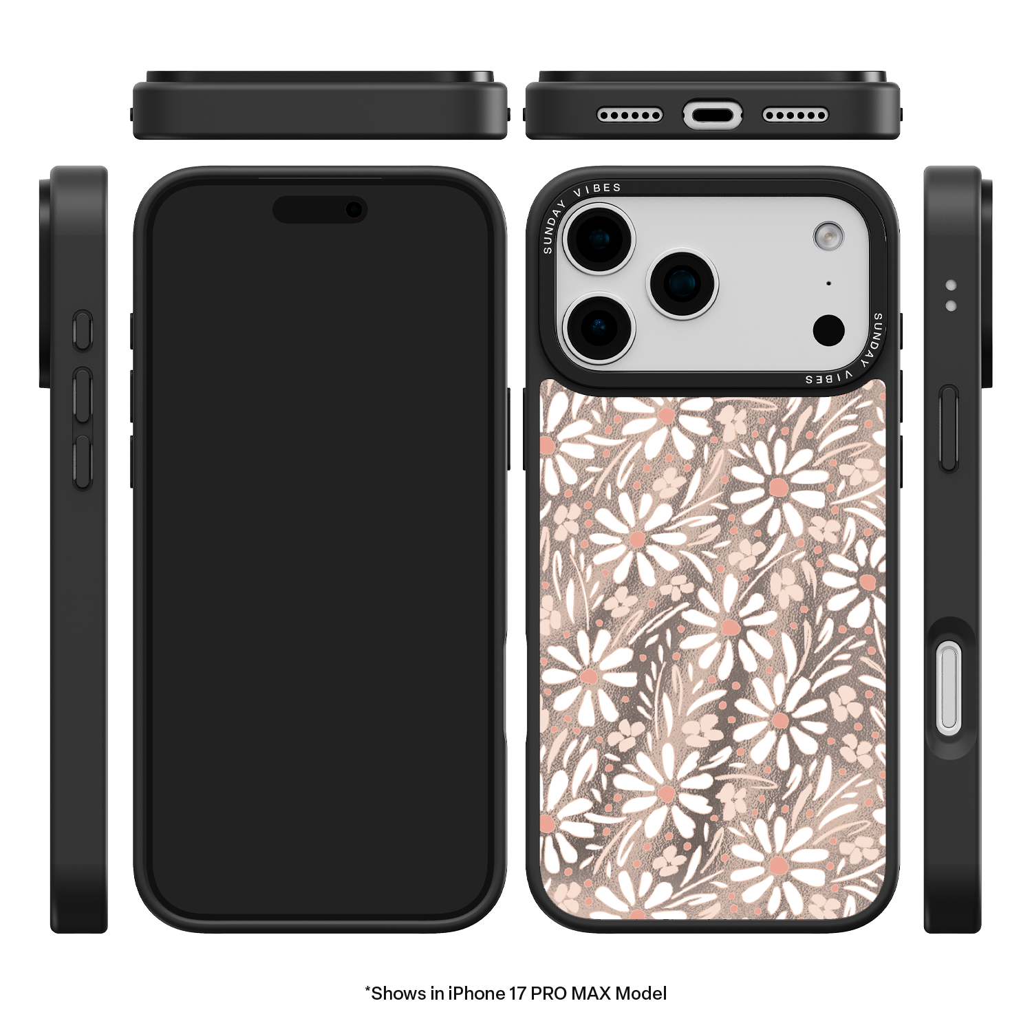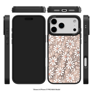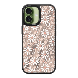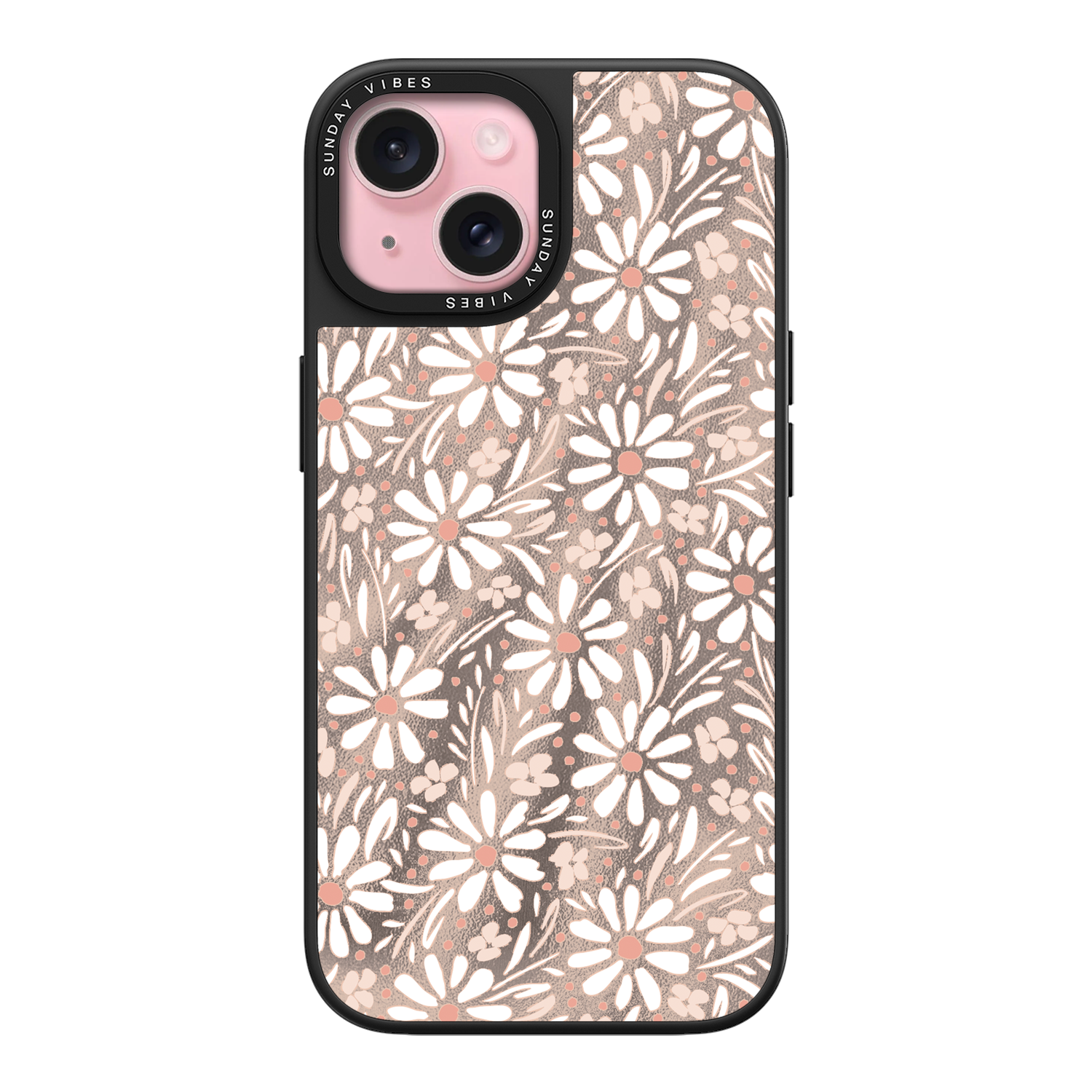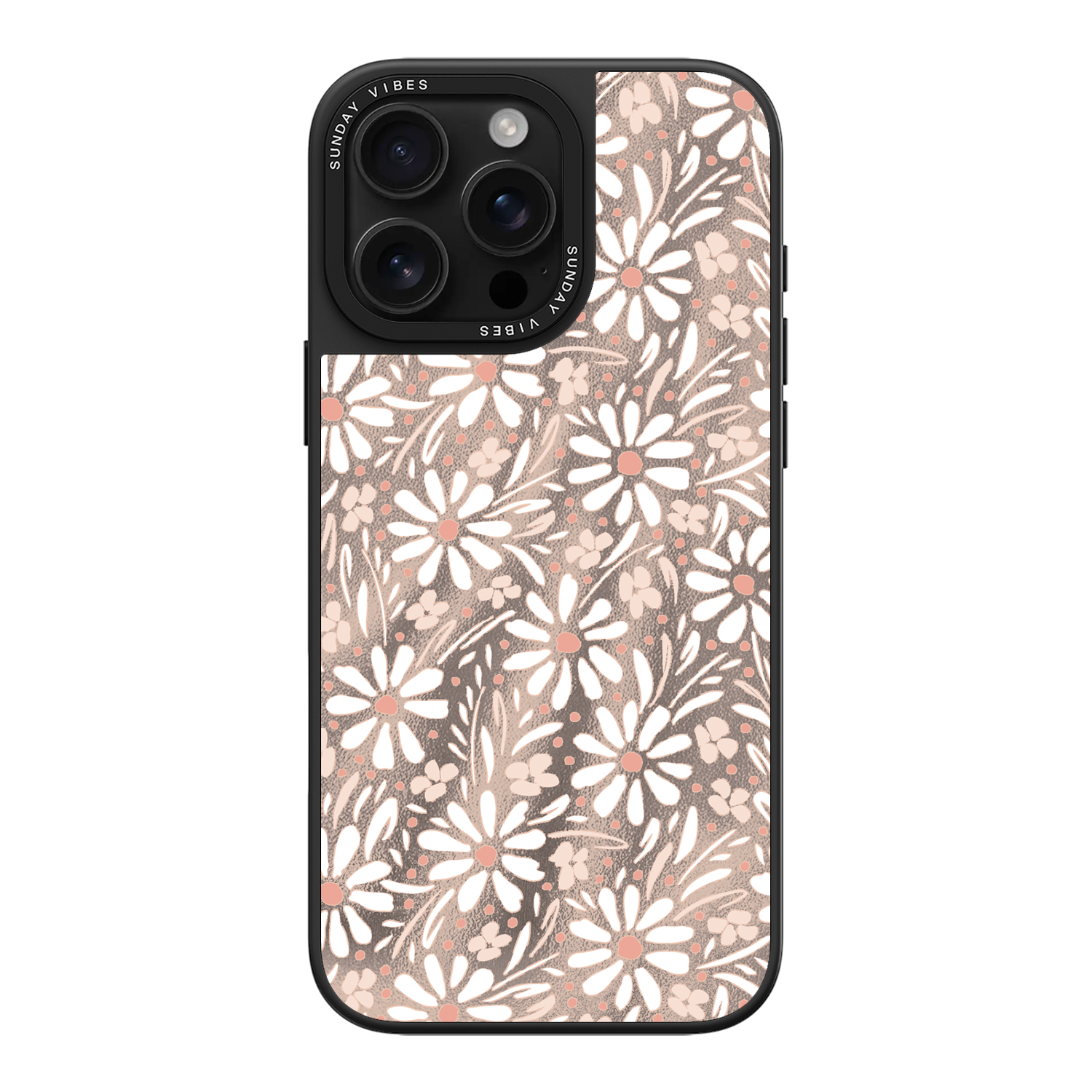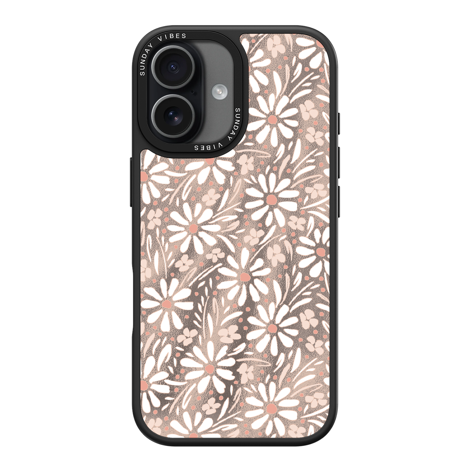 Discover the soft beauty of the Meadow Shimmer iPhone Case. This intricate design features a dense, vintage-style floral pattern of white daisies and delicate foliage, set against a warm, muted background that glows with a subtle holographic shimmer. This unique blend of cozy aesthetic and light-shifting texture creates a truly enchanting style. The case is built with a premium 3-layer back panel: a base holographic layer with texture, a middle ultra HD gallery print layer, and a velvet smooth anti-scratch and anti-fingerprint top coating.