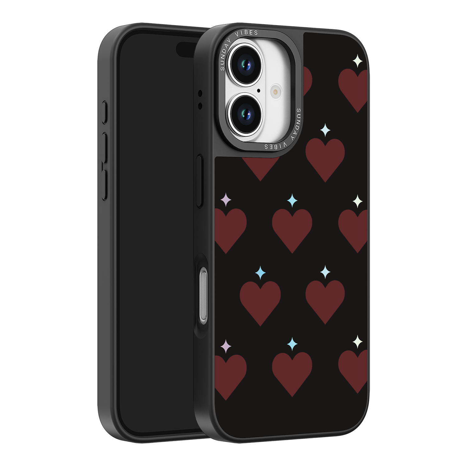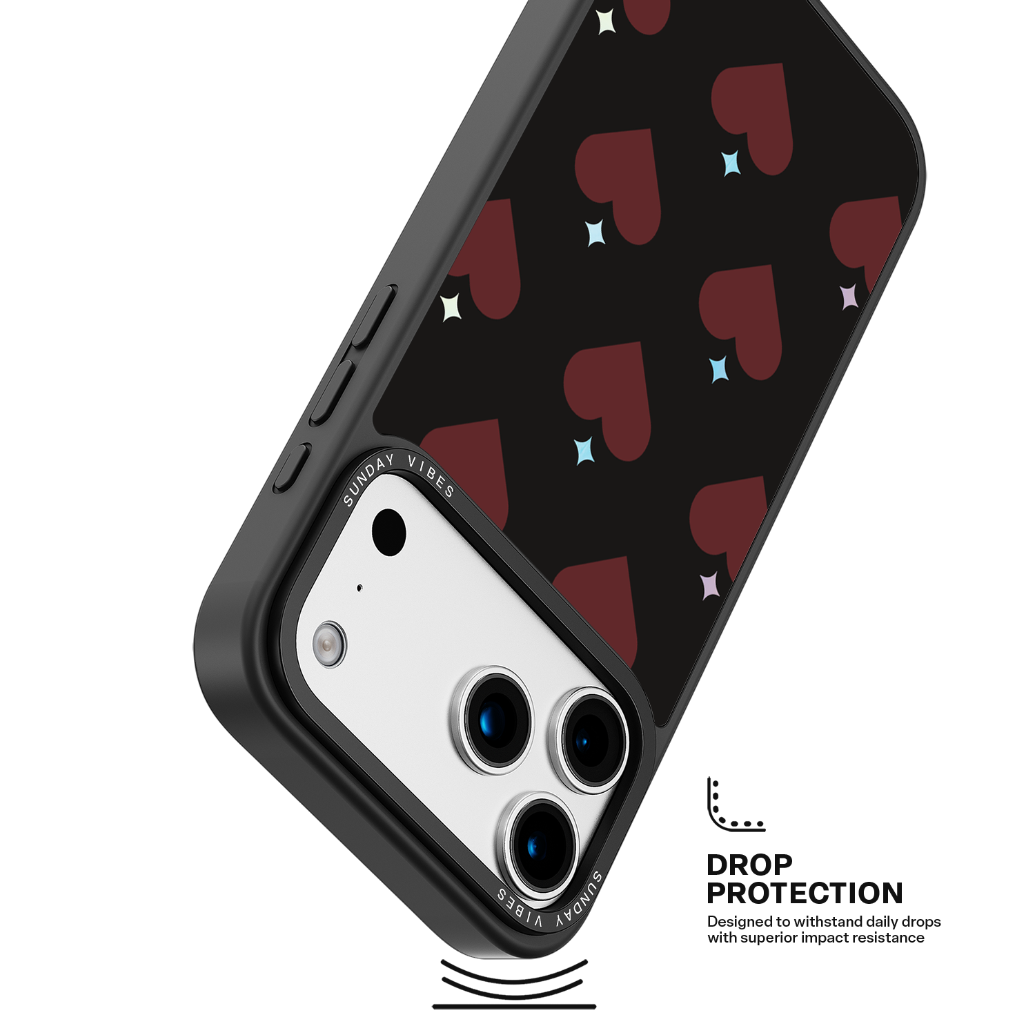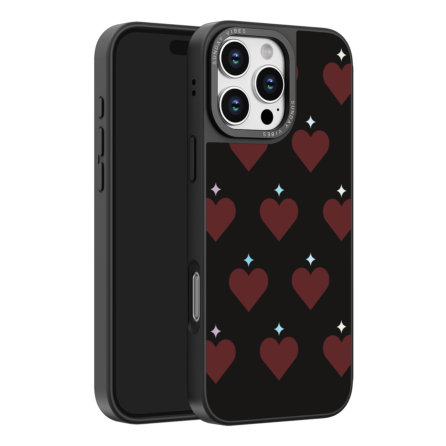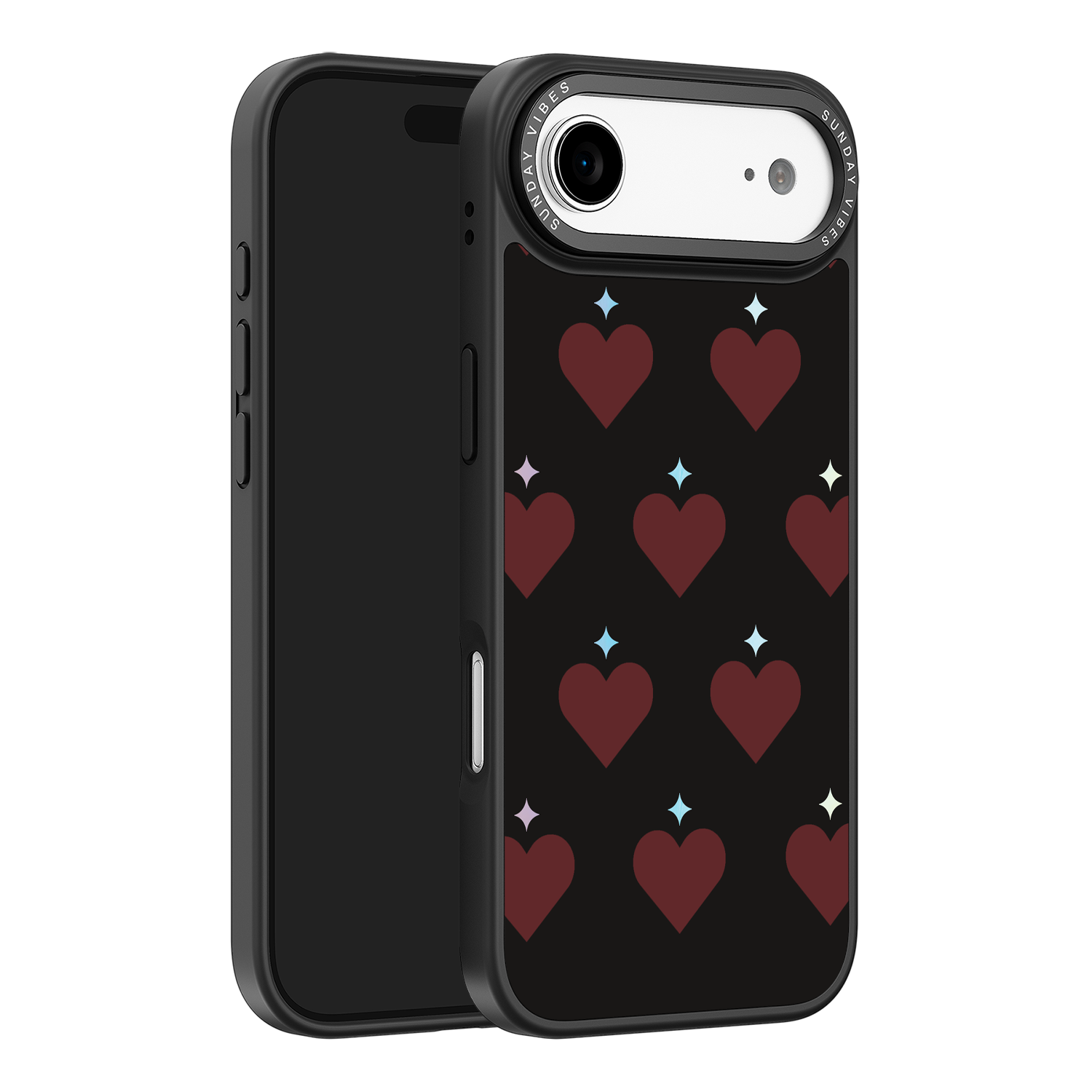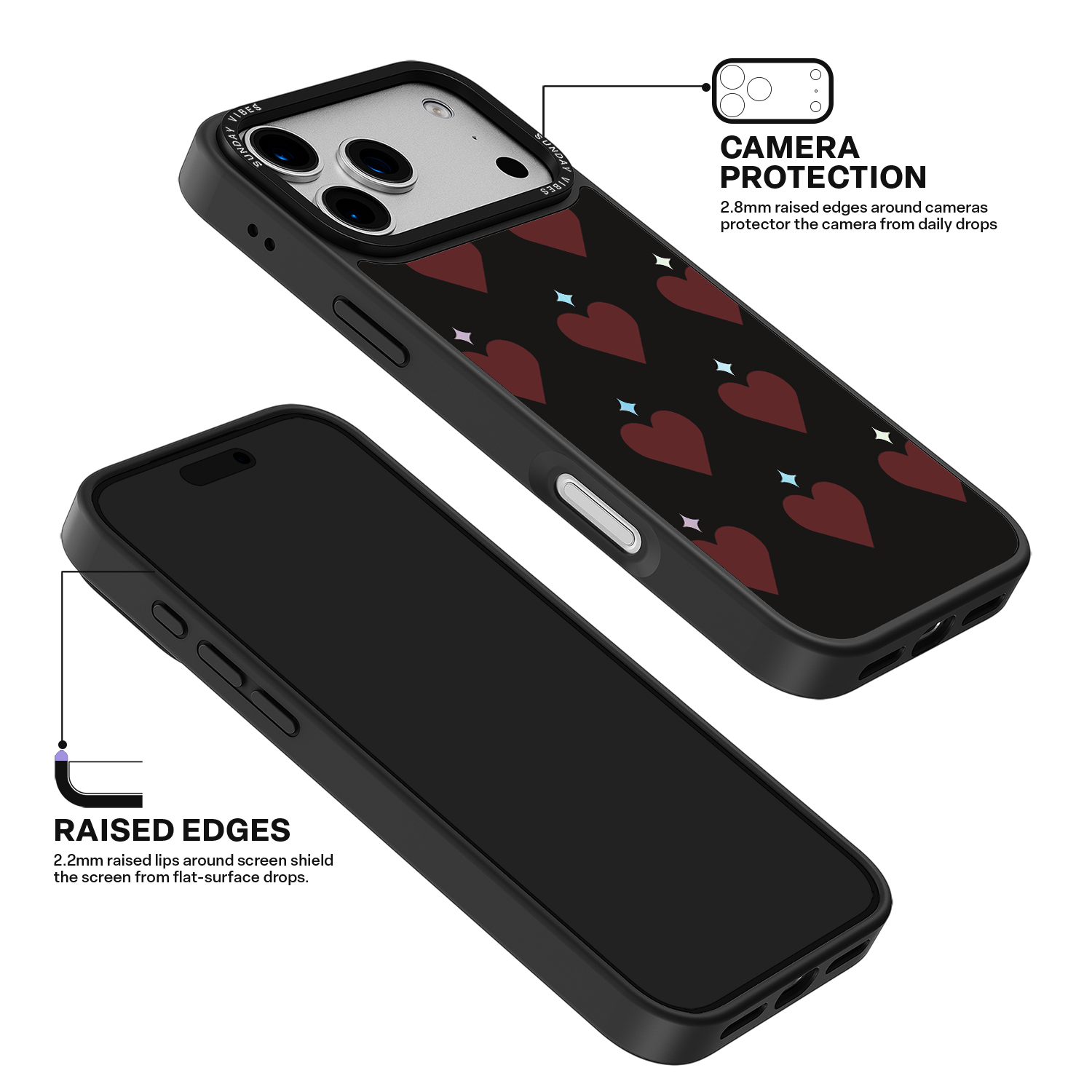Capture the night with the Midnight Wish iPhone Case. This design presents a sleek, dark aesthetic with deep maroon hearts set against a black ground. The key feature is the dynamic holographic star detail, shifting in the light to ensure your device catches every eye. This is a premium protective phone case engineered with a durable, shockproof perimeter to safeguard your gear from daily knocks. It maintains a genuinely slim fit profile and is fully scratch-resistant, ensuring lasting quality and style for your iPhone Case. A perfect blend of aesthetic and substance.