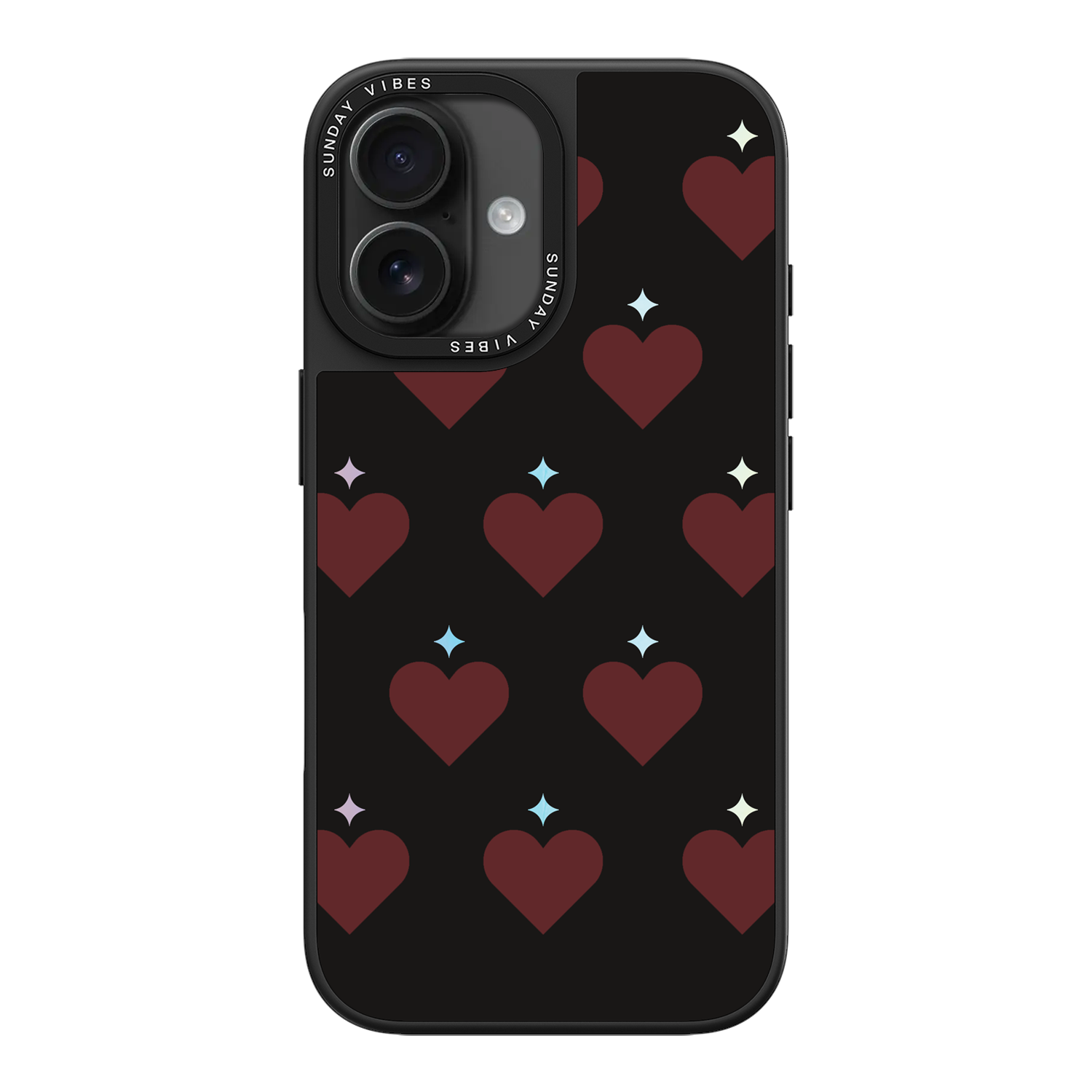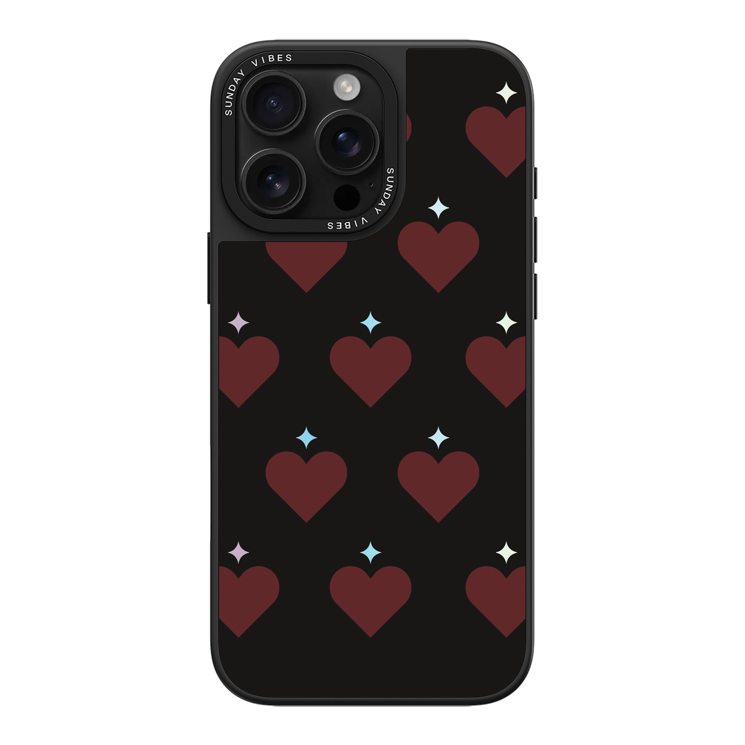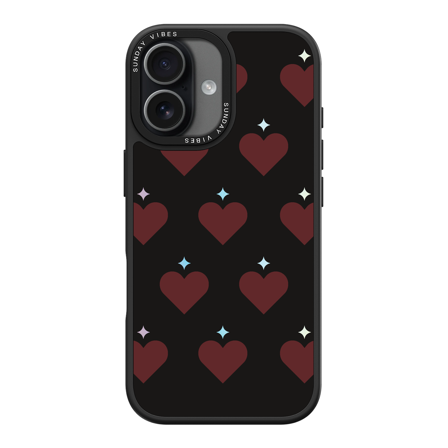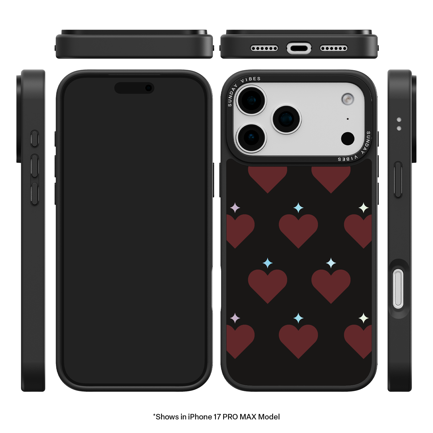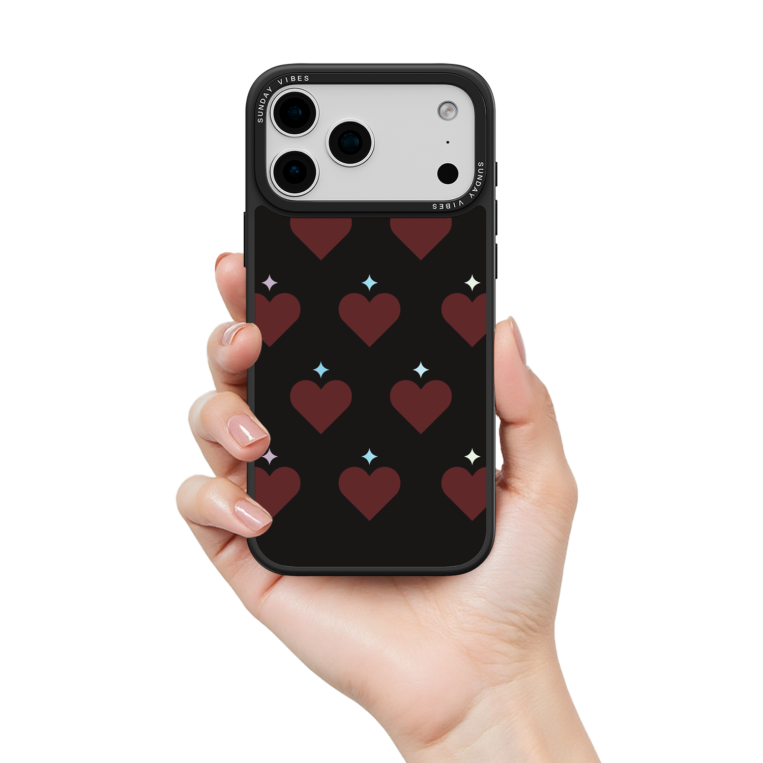 Capture the night with the Midnight Wish iPhone Case. This design presents a sleek, dark aesthetic with deep maroon hearts set against a black ground. The key feature is the dynamic holographic star detail, shifting in the light to ensure your device catches every eye. This is a premium protective phone case engineered with a durable, shockproof perimeter to safeguard your gear from daily knocks. It maintains a genuinely slim fit profile and is fully scratch-resistant, ensuring lasting quality and style for your iPhone Case. A perfect blend of aesthetic and substance.
