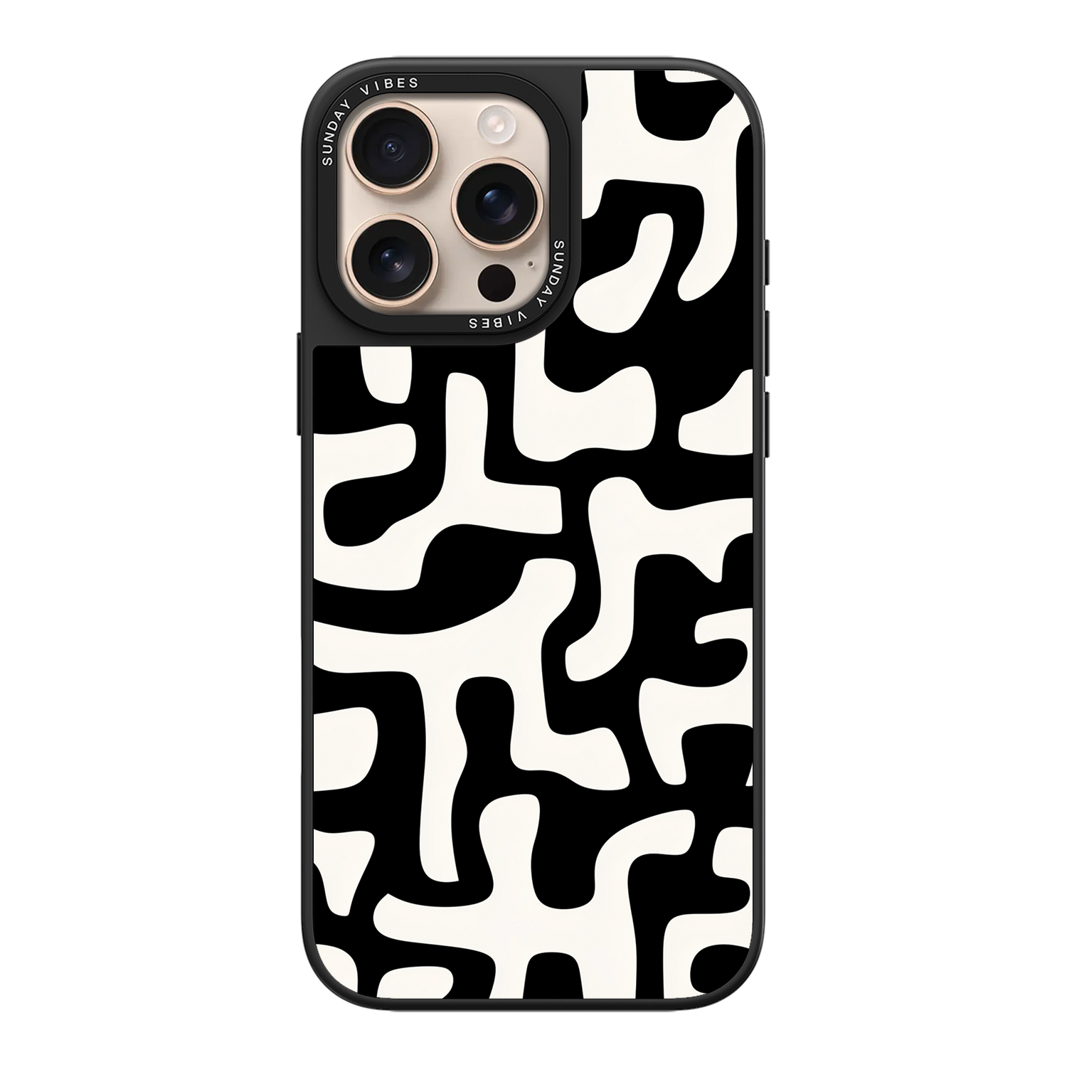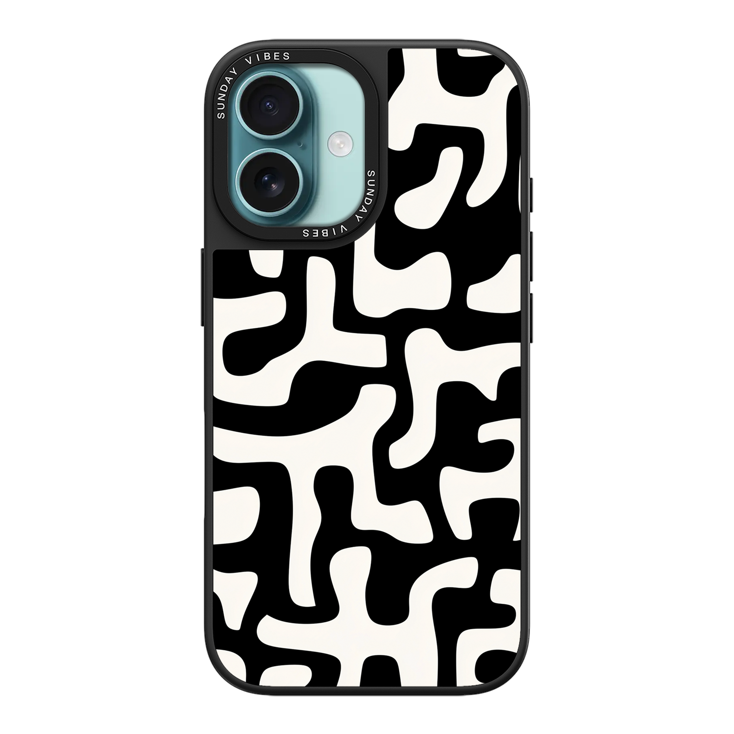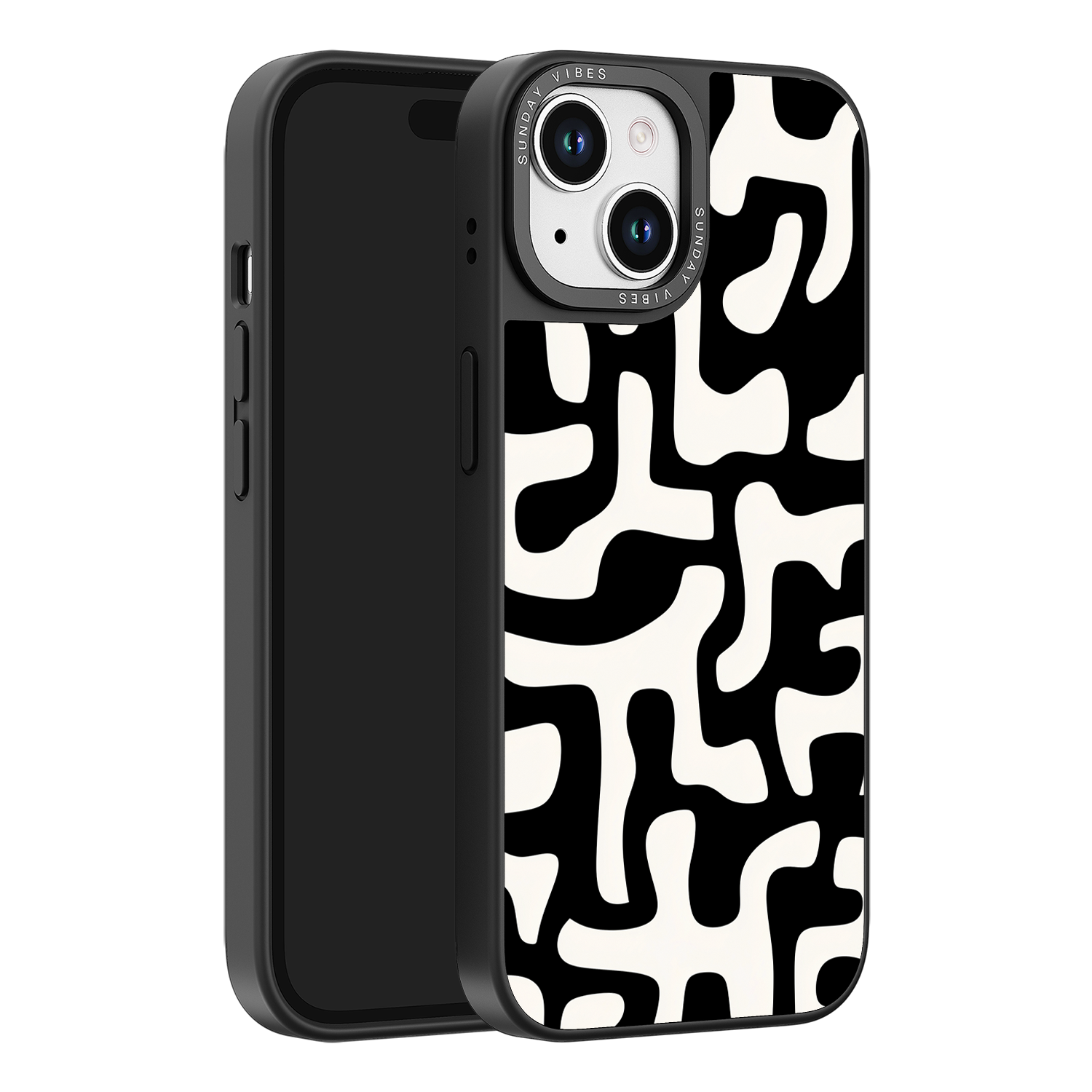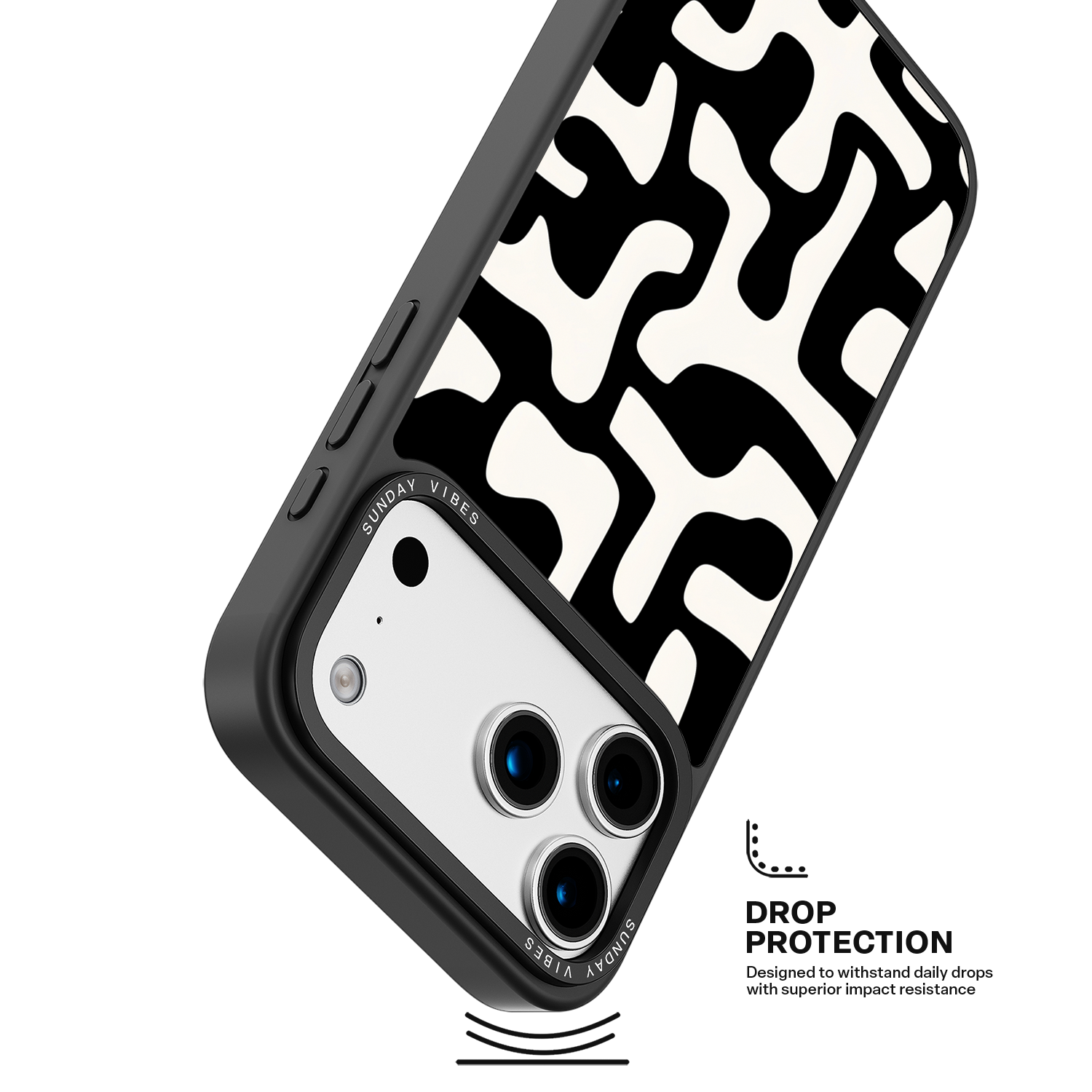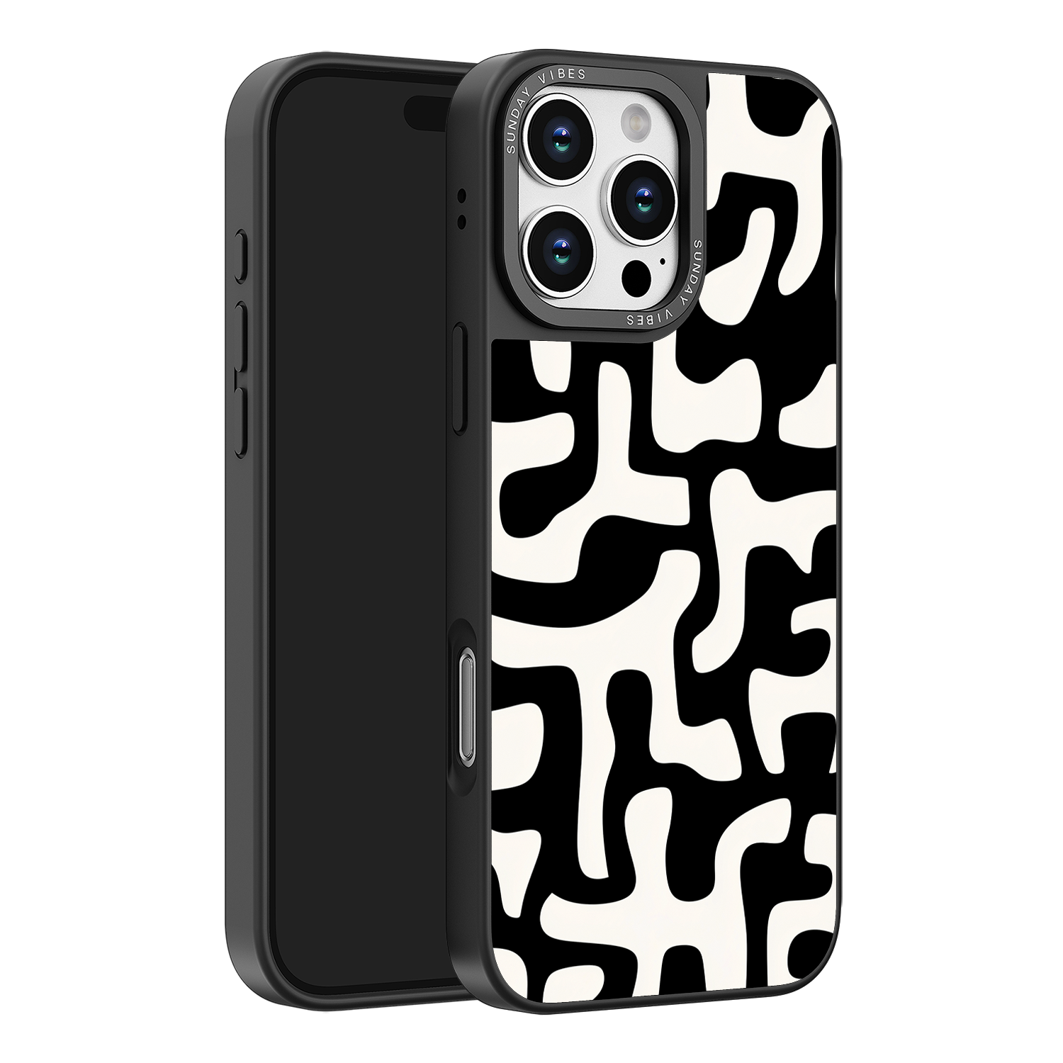 Adorn your device with the bold, graphic style of the Monochrome Moo iPhone Case. This striking design showcases an abstract, high-contrast pattern of intertwining black and cream shapes, nodding cleverly to a modern cow print aesthetic. The clean lines and strong contrast transform your phone into an instantly quirky and stylish accessory. The core aesthetic integrity is preserved by the case's premium 3-layer back panel: a base layer for protection, a middle ultra HD gallery print layer for precise detail, and a velvet smooth anti-scratch and anti-fingerprint top coating.