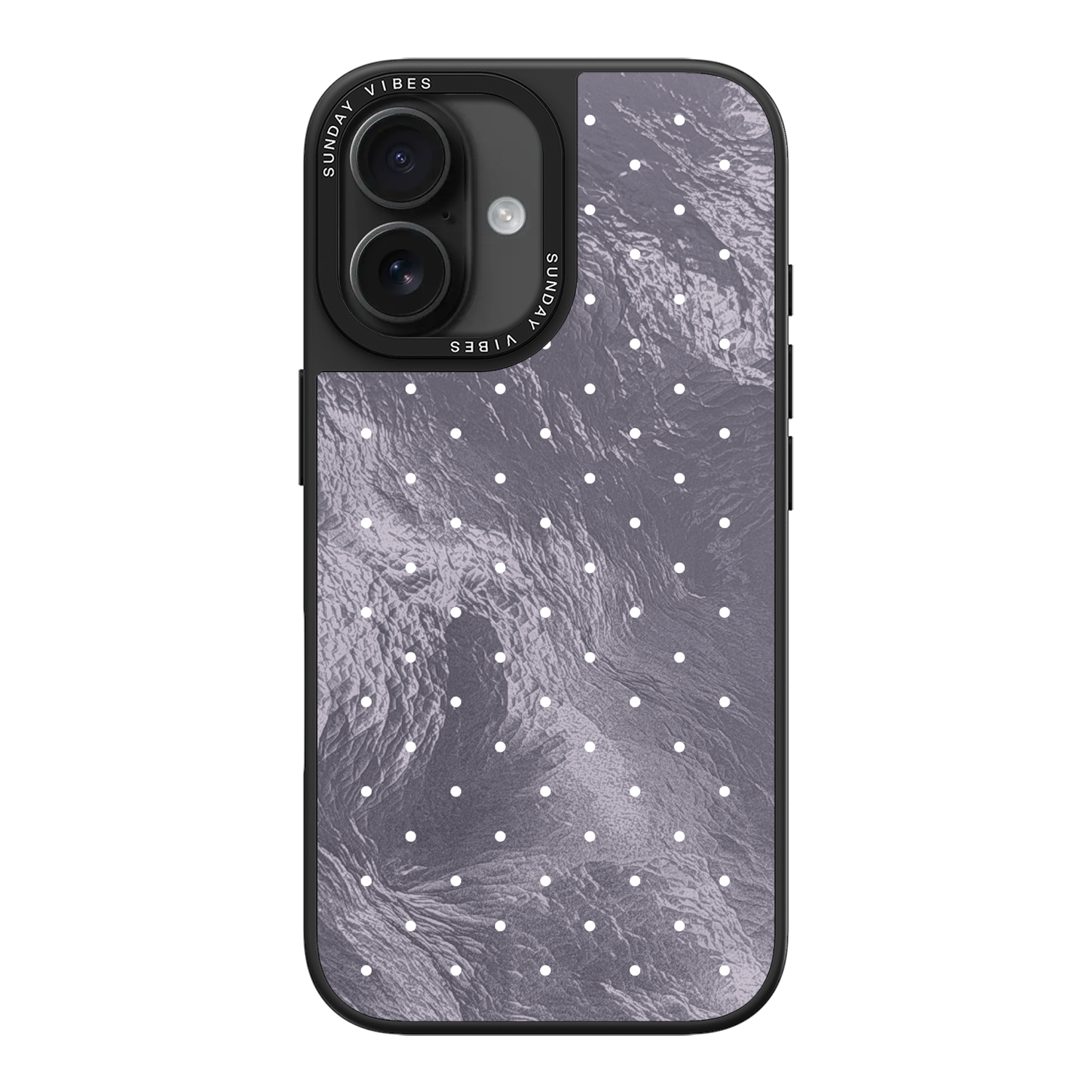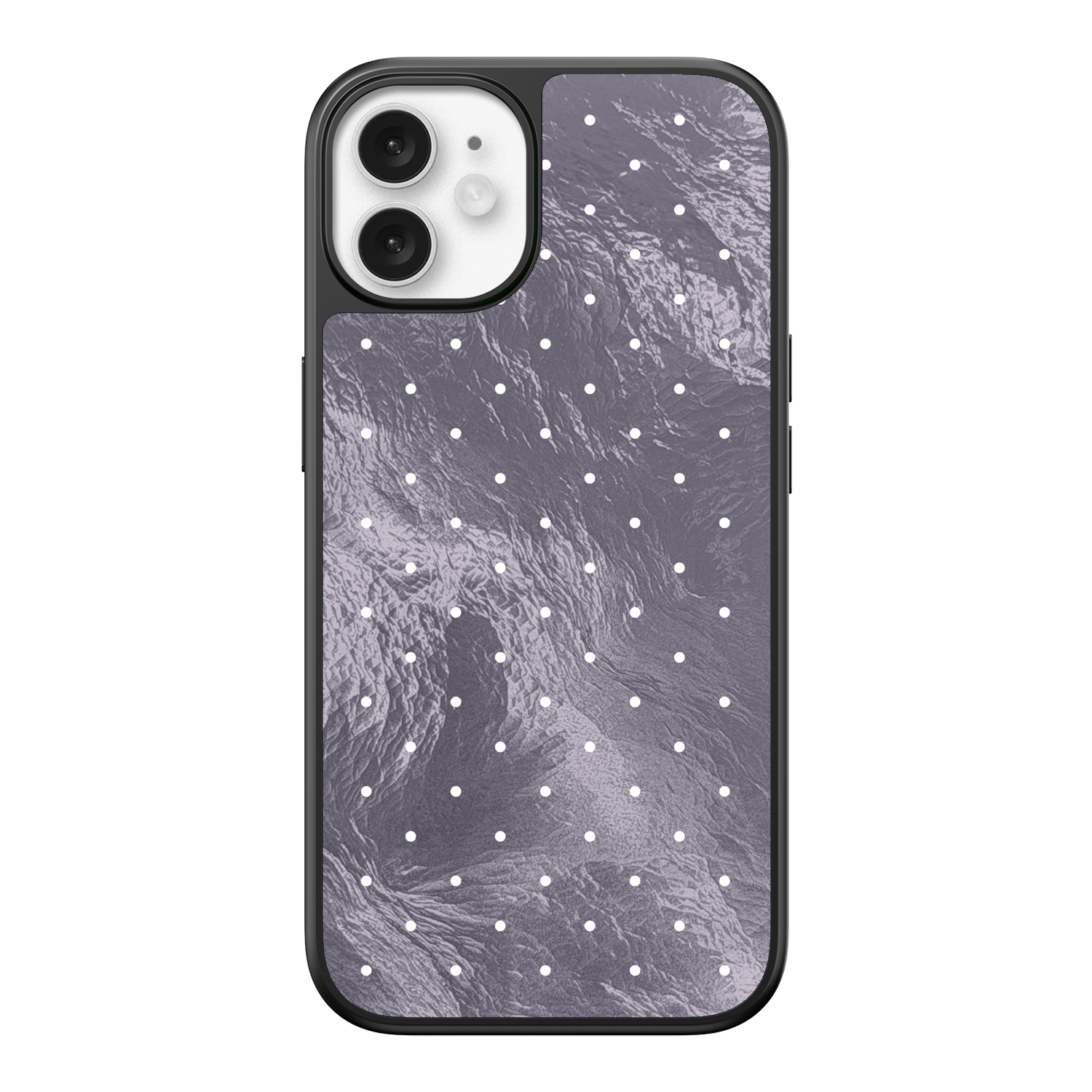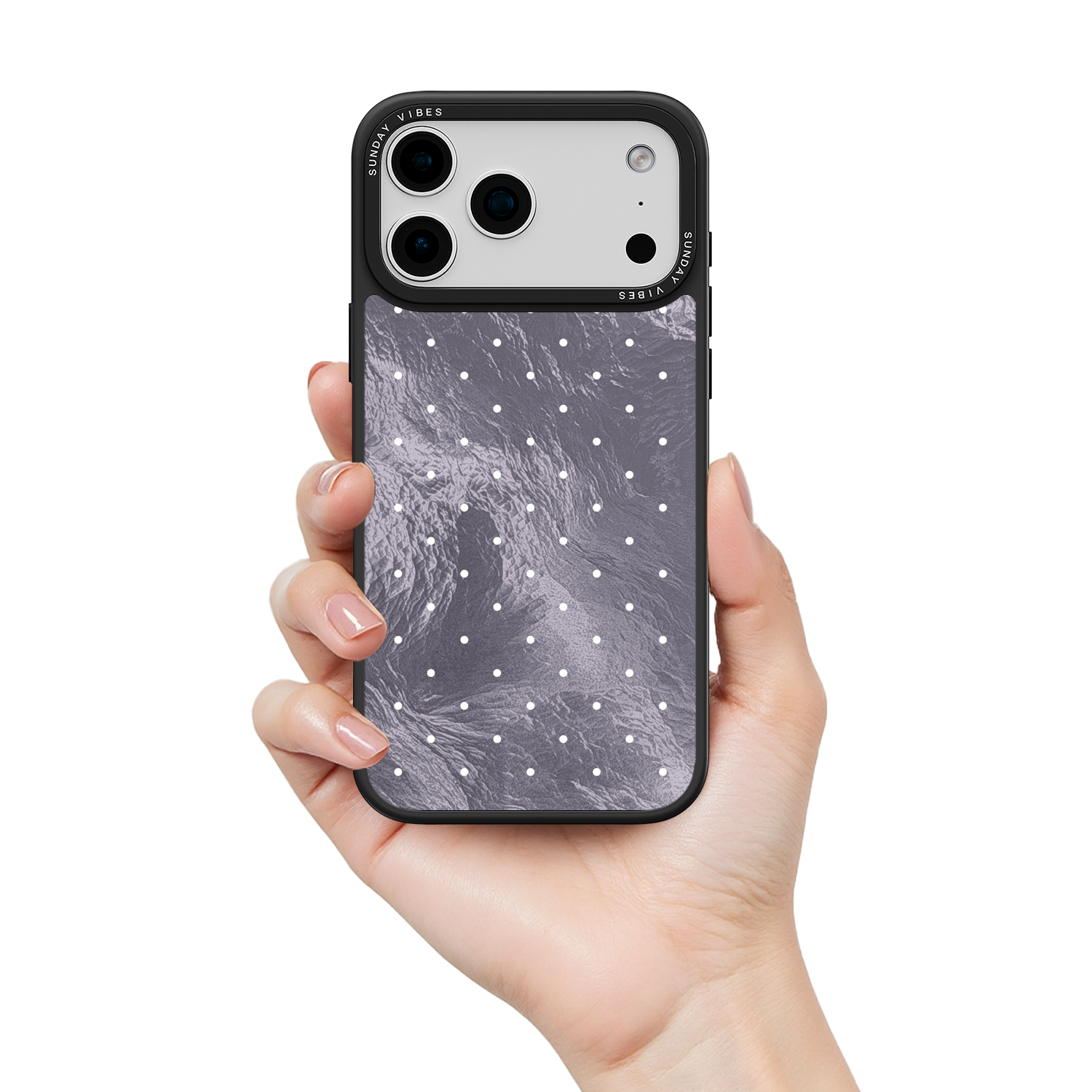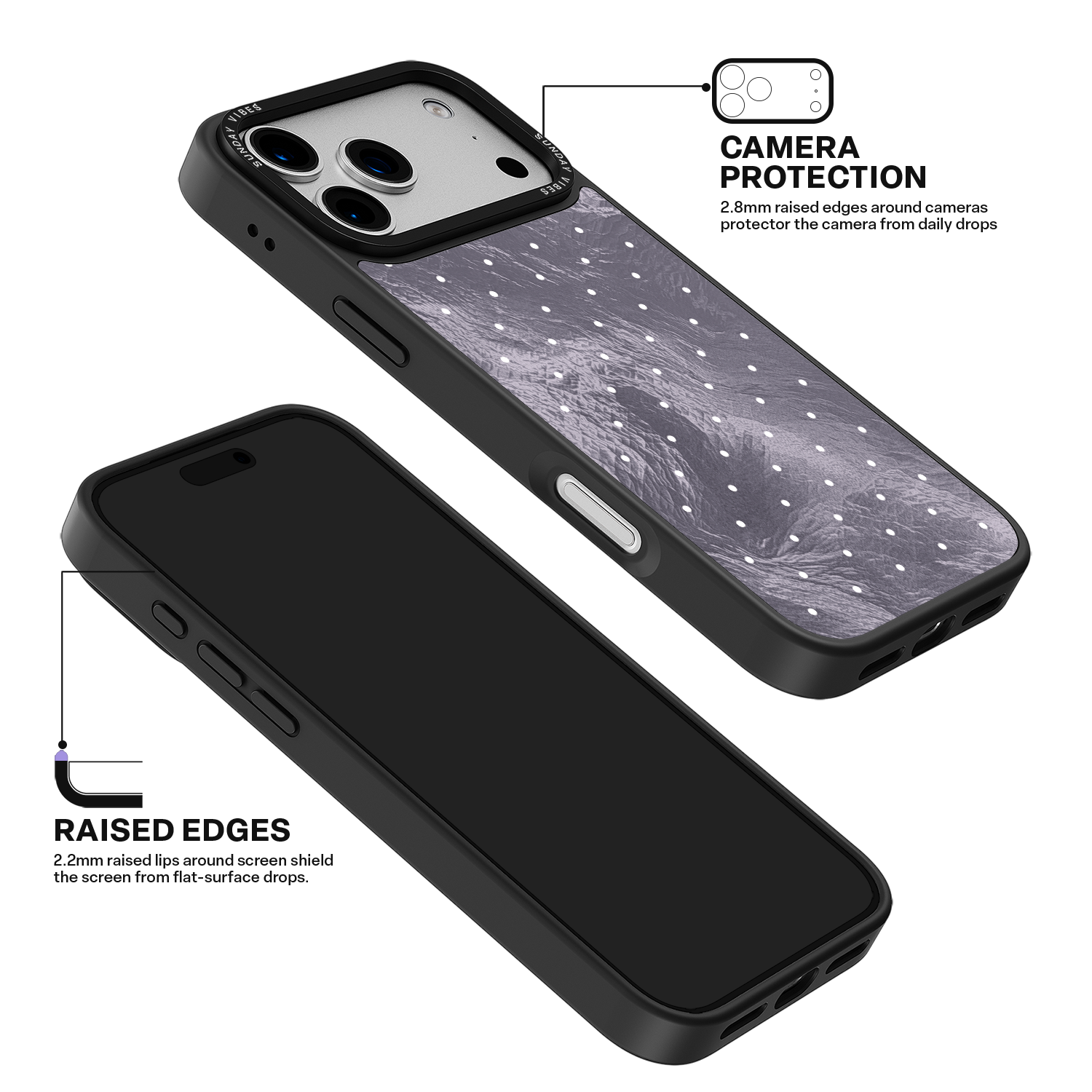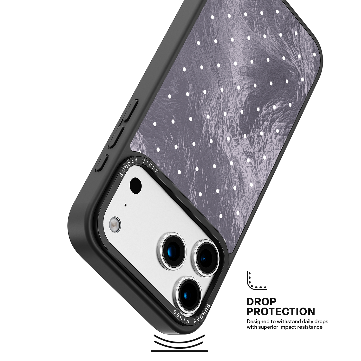 Adorn your device with the ethereal charm of the Silver Moon Dots iPhone Case, silver addon a bit purpleish. This dreamy design features crisp white dots scattered across a pale very light purple/blue holographic background that shimmers and shifts, evoking a serene sky or sparkling water. This gentle yet glamorous aesthetic ensures your phone is a truly captivating accessory. The structural integrity is delivered via a premium 3-layer back panel: featuring a base holographic layer with texture, an ultra HD gallery print layer, and a velvet smooth anti-scratch and anti-fingerprint top coating.