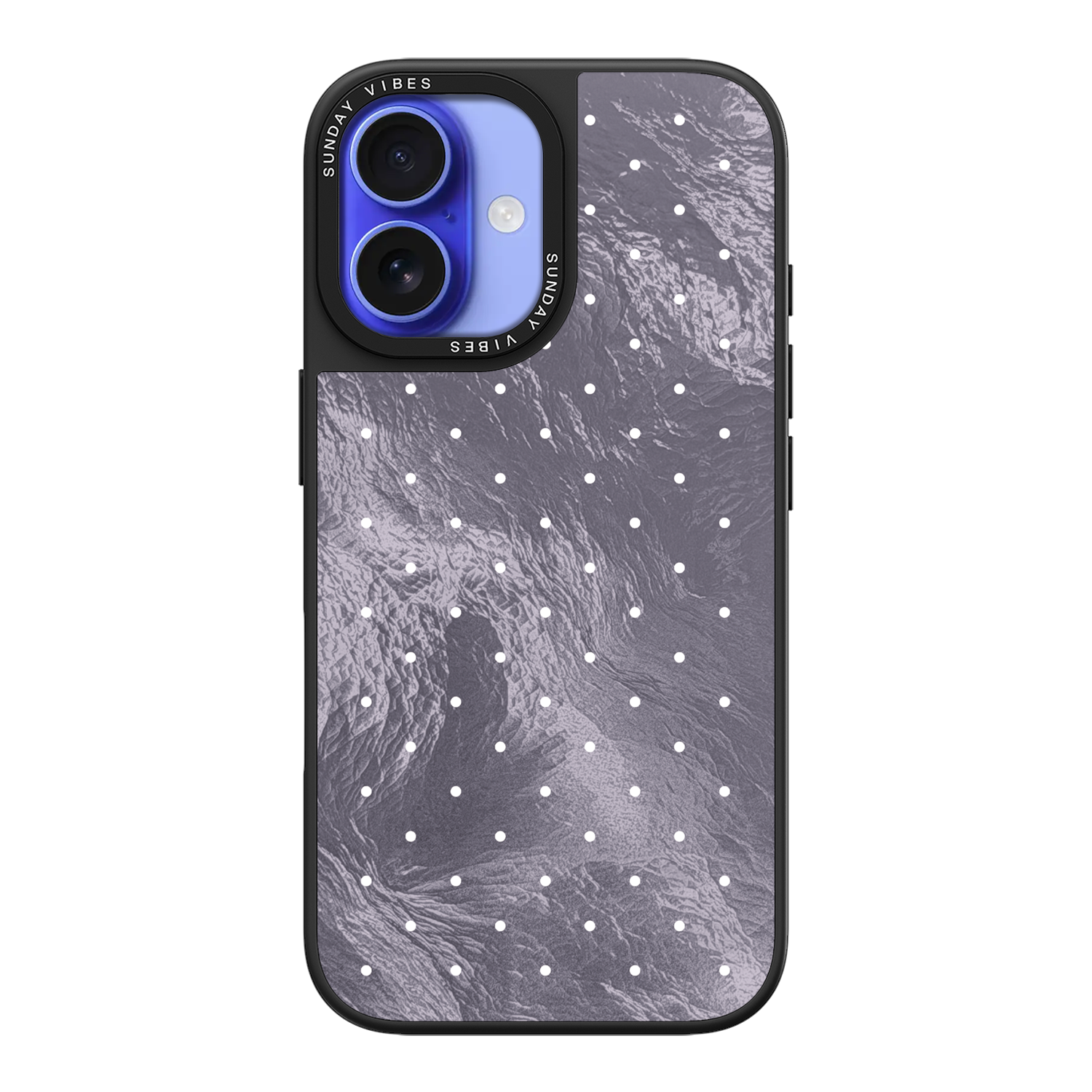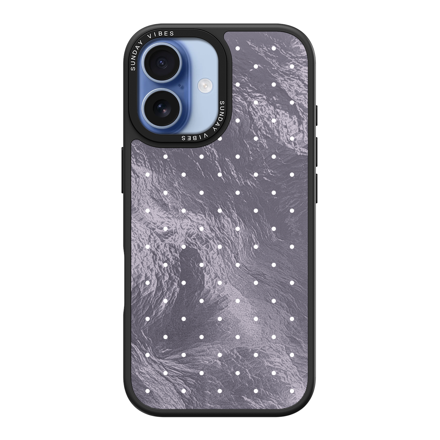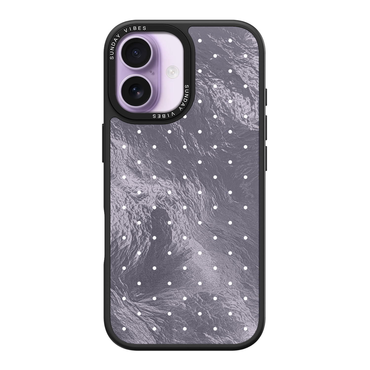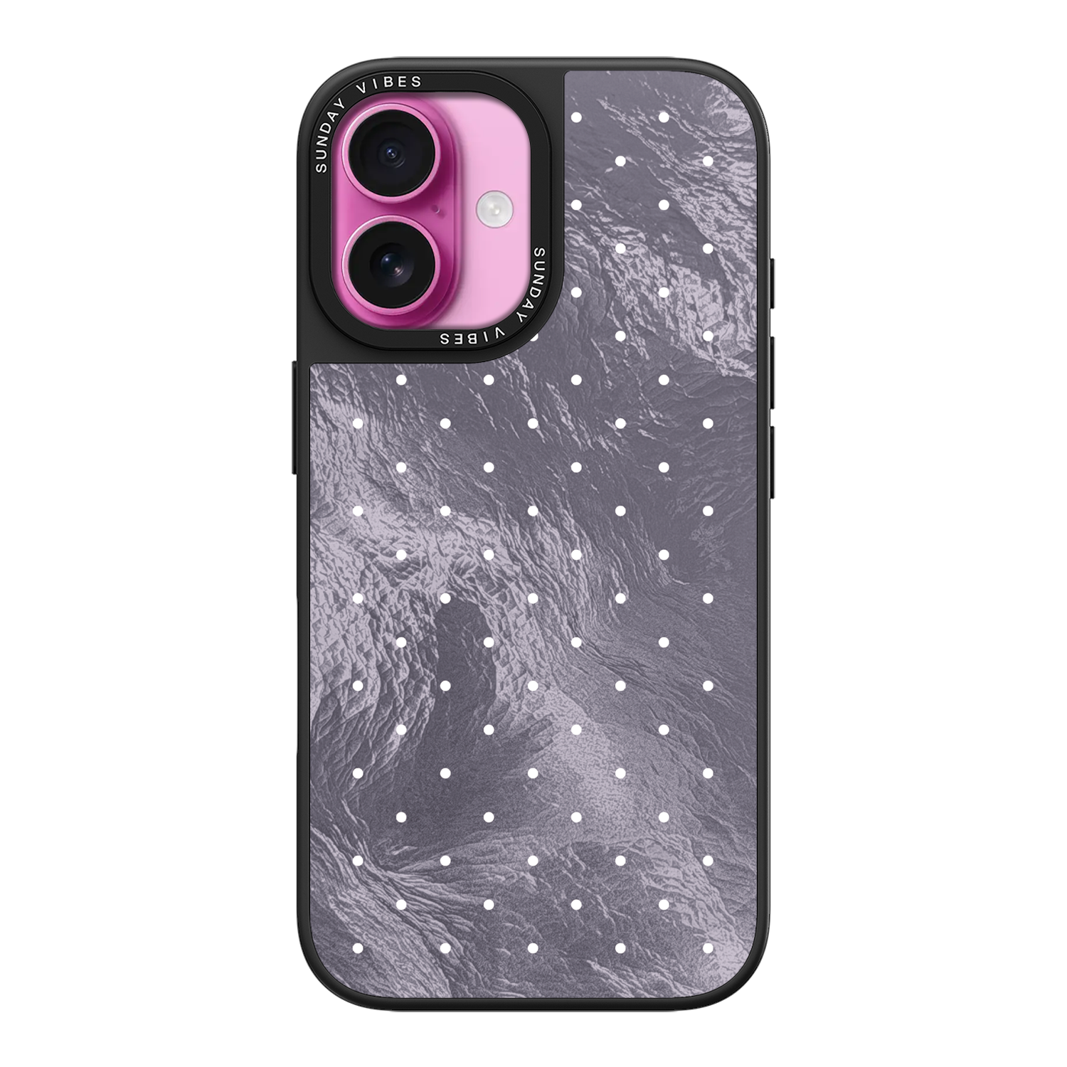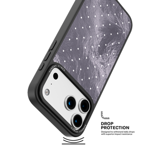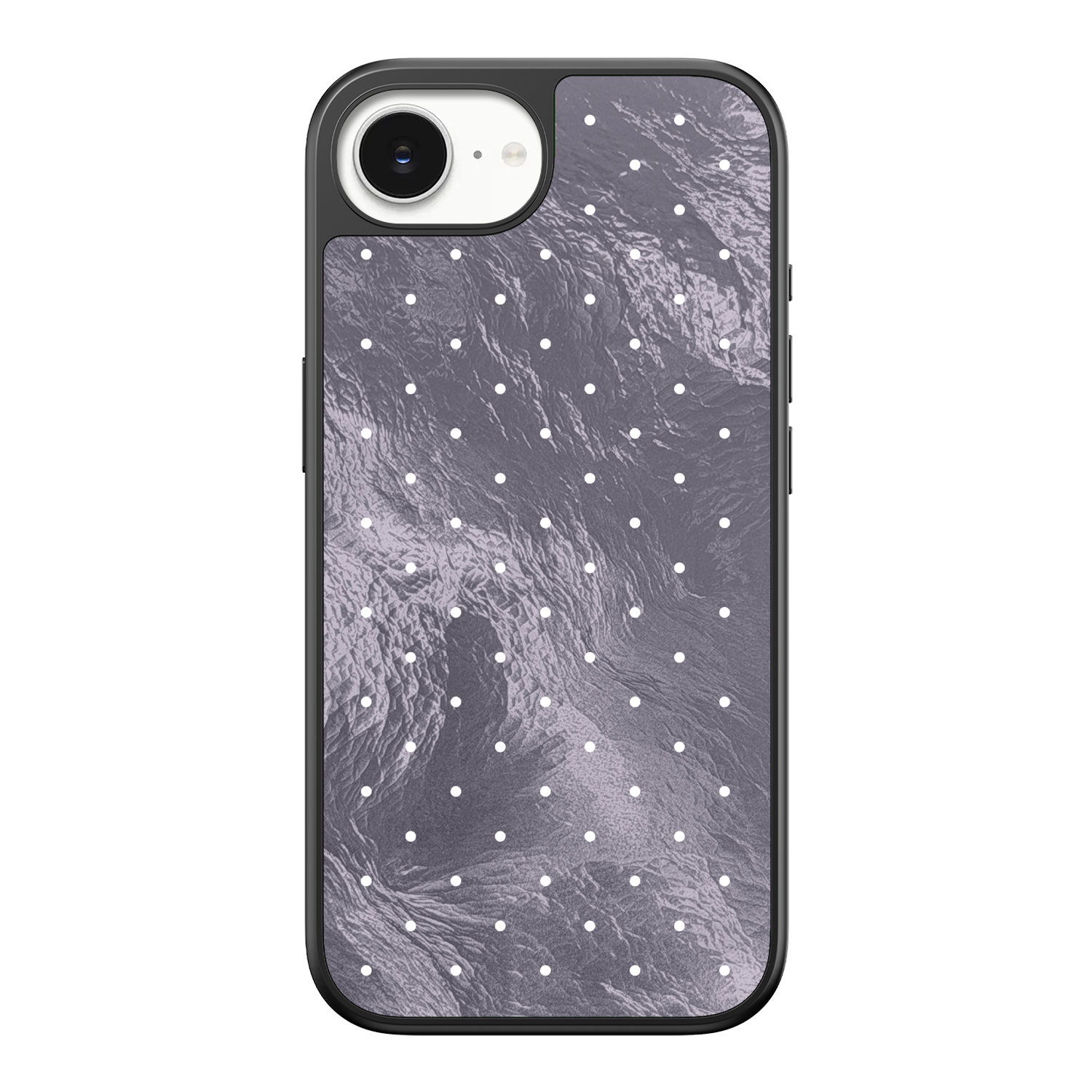 Adorn your device with the ethereal charm of the Silver Moon Dots iPhone Case, silver addon a bit purpleish. This dreamy design features crisp white dots scattered across a pale very light purple/blue holographic background that shimmers and shifts, evoking a serene sky or sparkling water. This gentle yet glamorous aesthetic ensures your phone is a truly captivating accessory. The structural integrity is delivered via a premium 3-layer back panel: featuring a base holographic layer with texture, an ultra HD gallery print layer, and a velvet smooth anti-scratch and anti-fingerprint top coating.