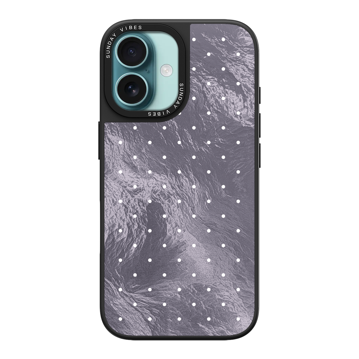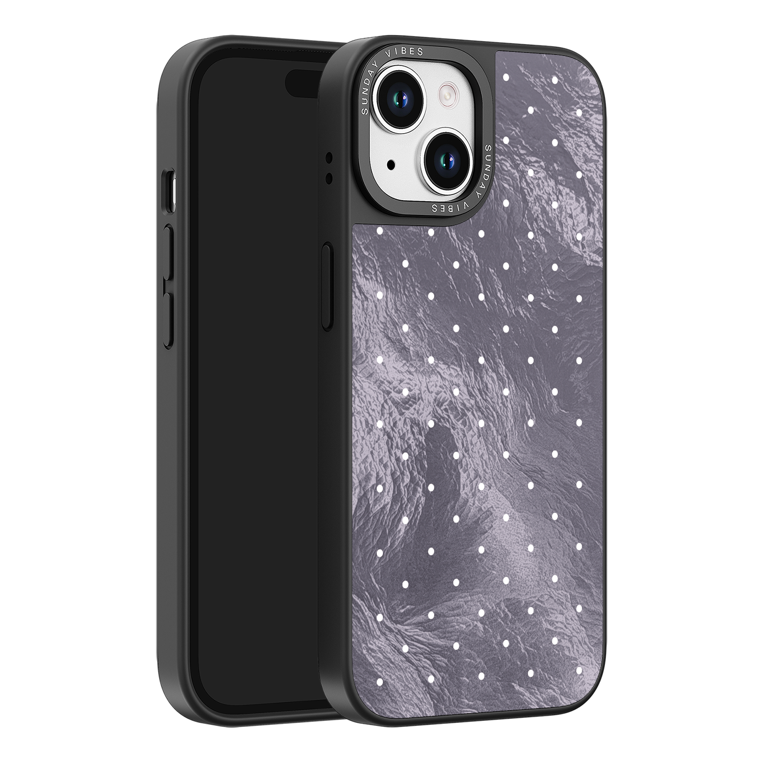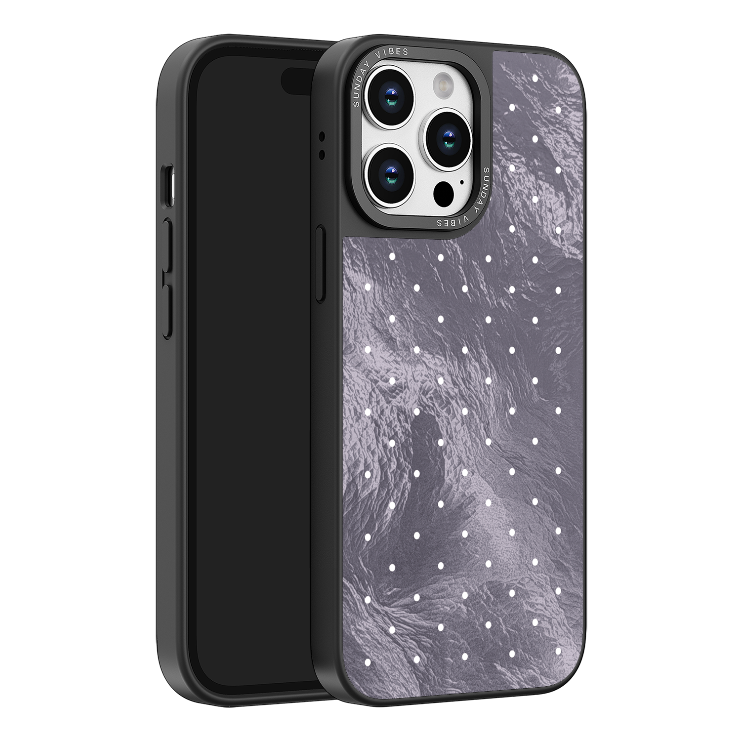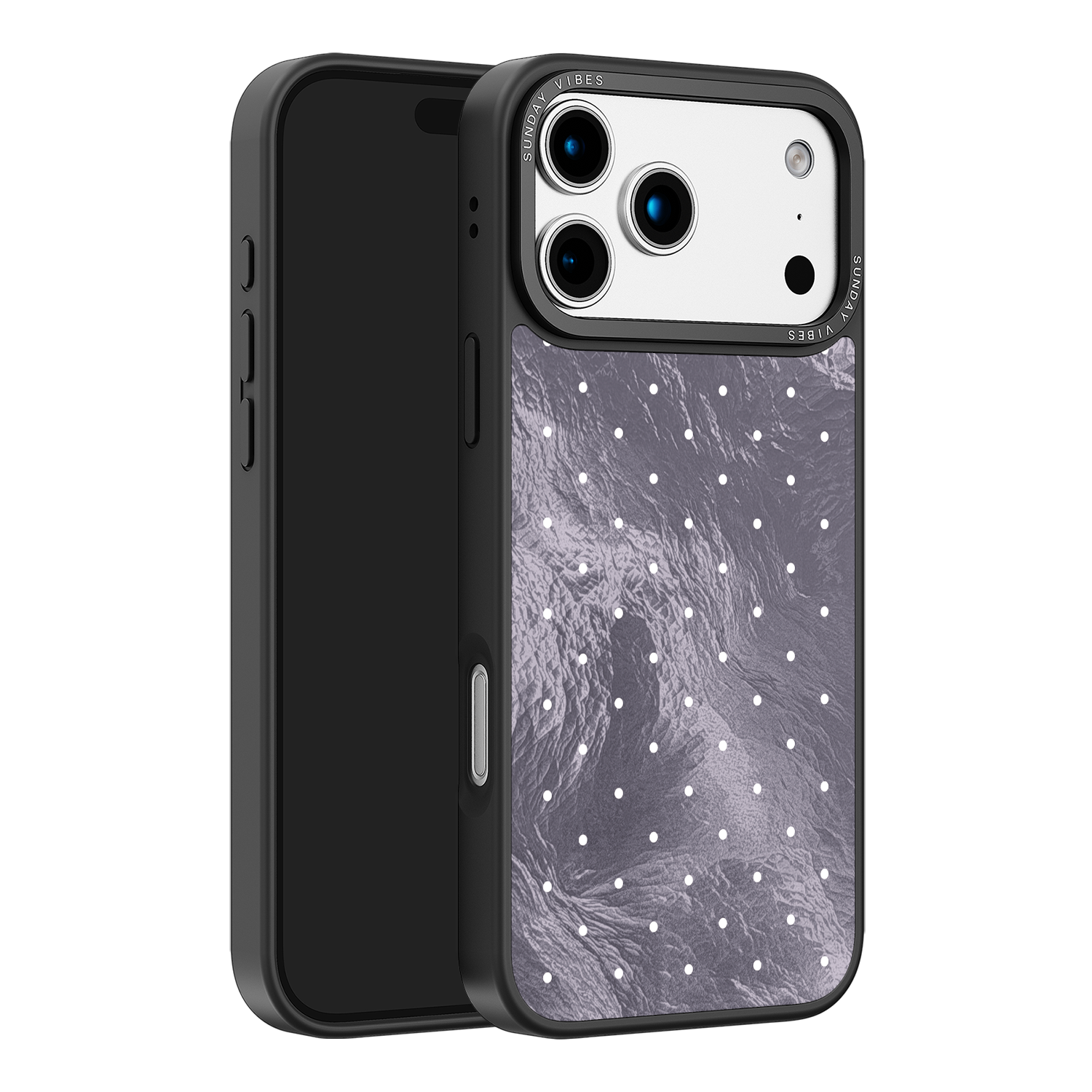 Adorn your device with the ethereal charm of the Silver Moon Dots iPhone Case, silver addon a bit purpleish. This dreamy design features crisp white dots scattered across a pale very light purple/blue holographic background that shimmers and shifts, evoking a serene sky or sparkling water. This gentle yet glamorous aesthetic ensures your phone is a truly captivating accessory. The structural integrity is delivered via a premium 3-layer back panel: featuring a base holographic layer with texture, an ultra HD gallery print layer, and a velvet smooth anti-scratch and anti-fingerprint top coating.