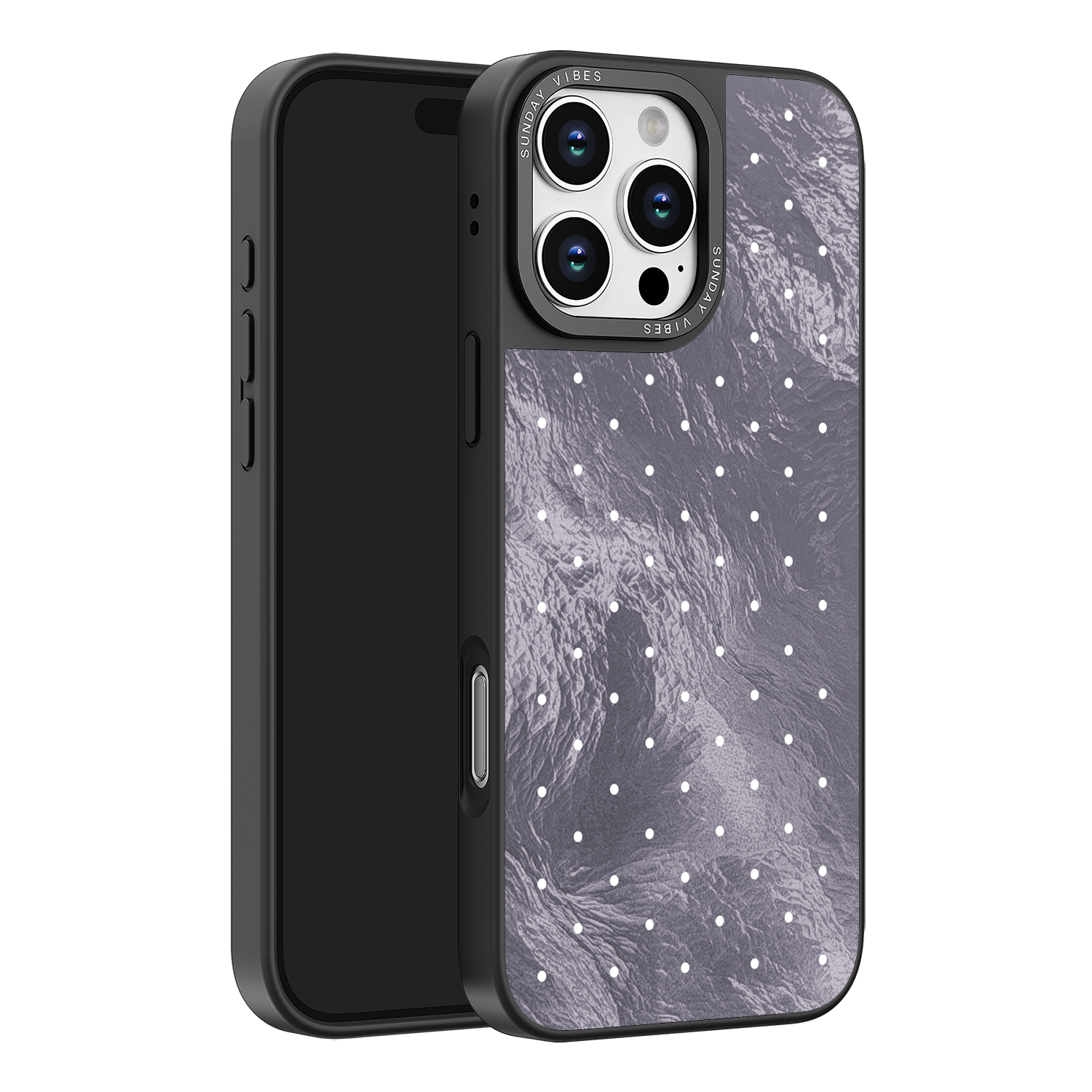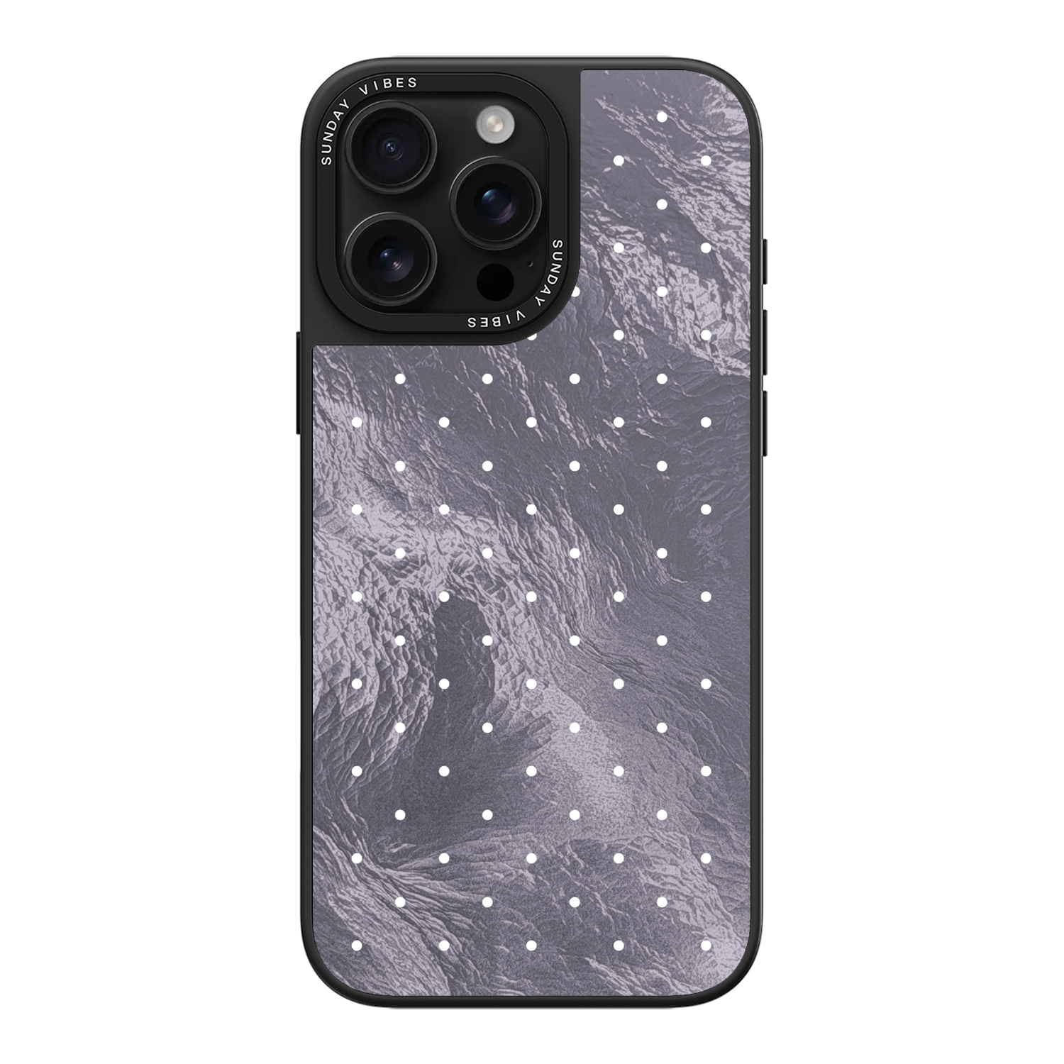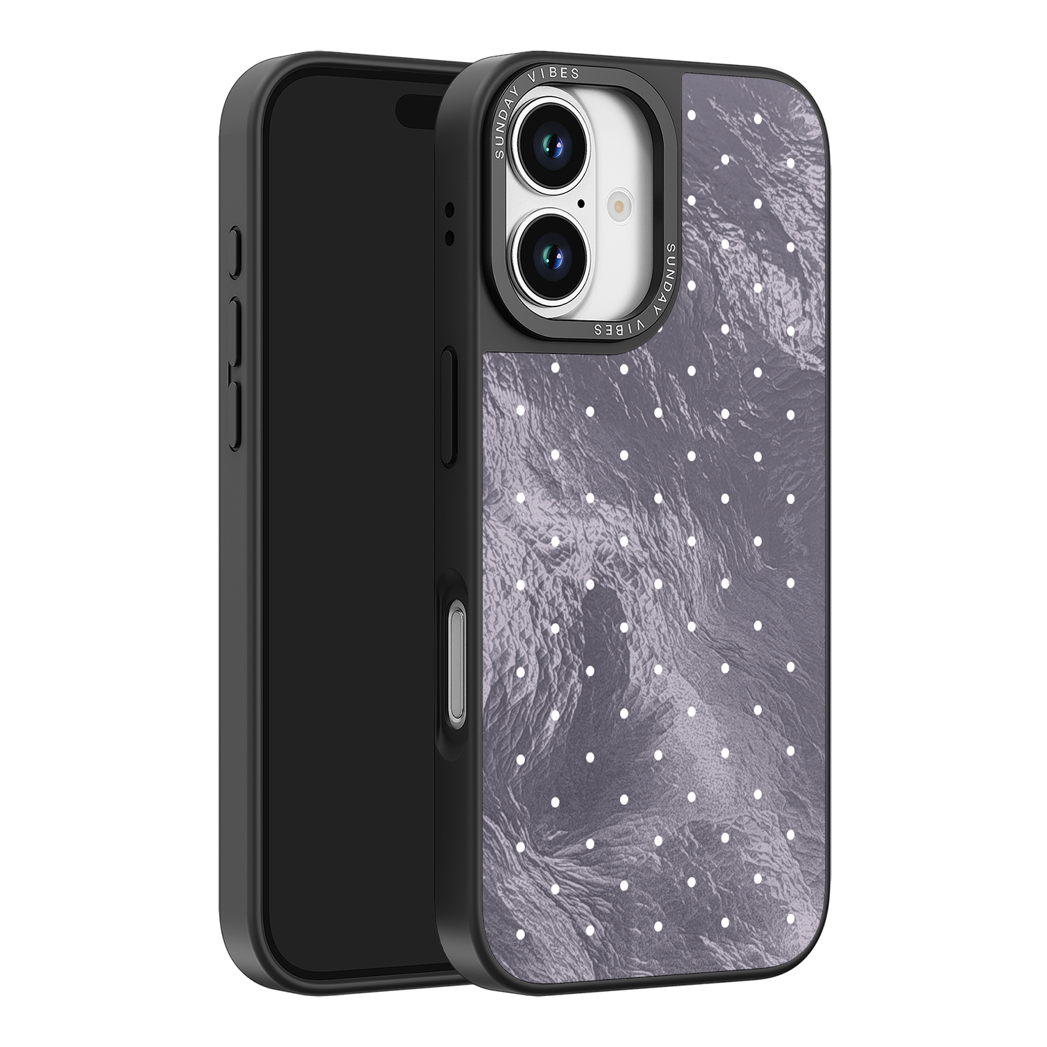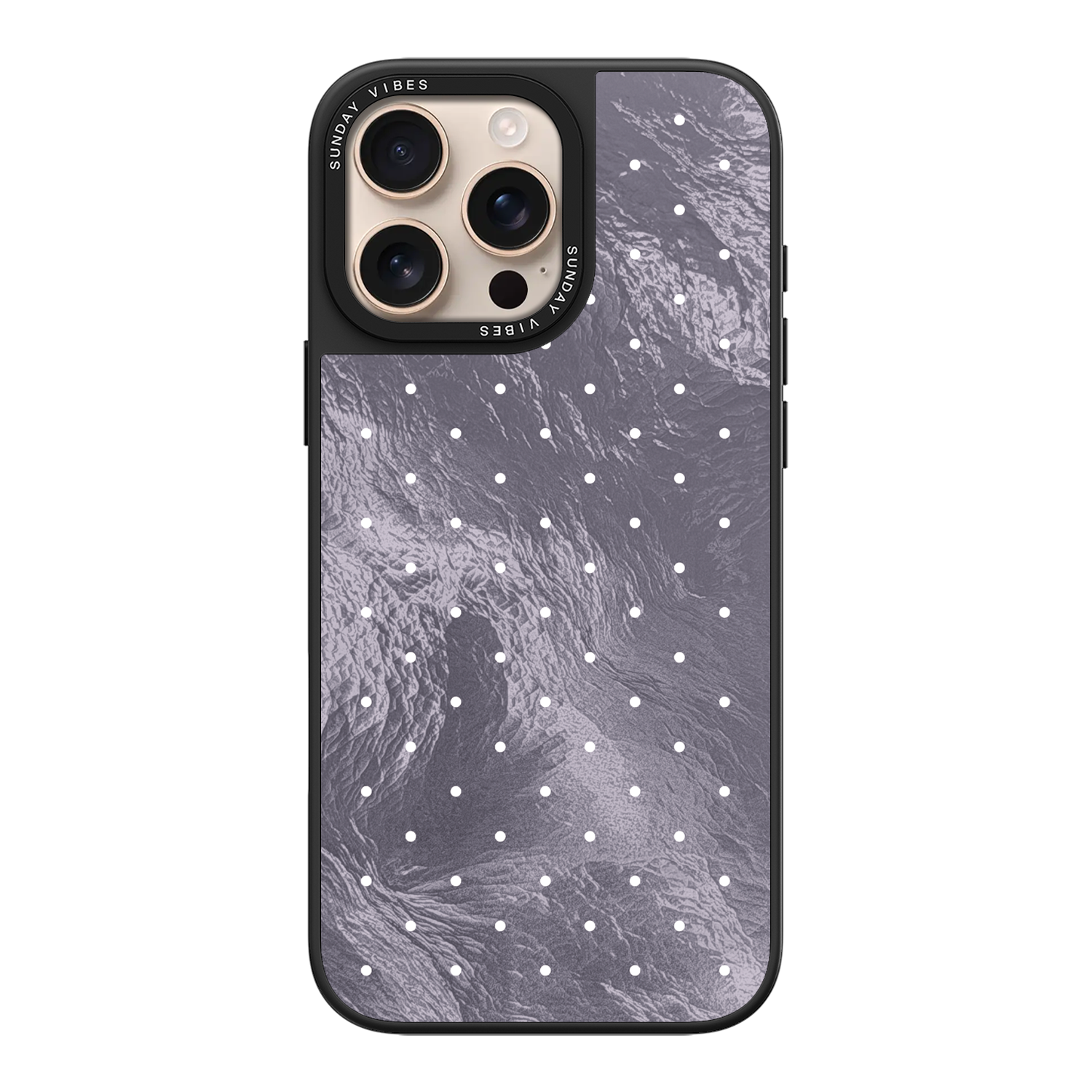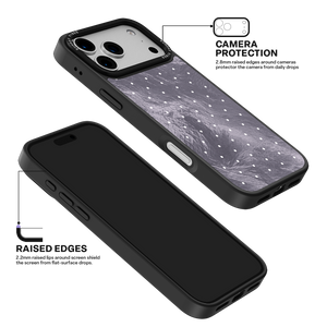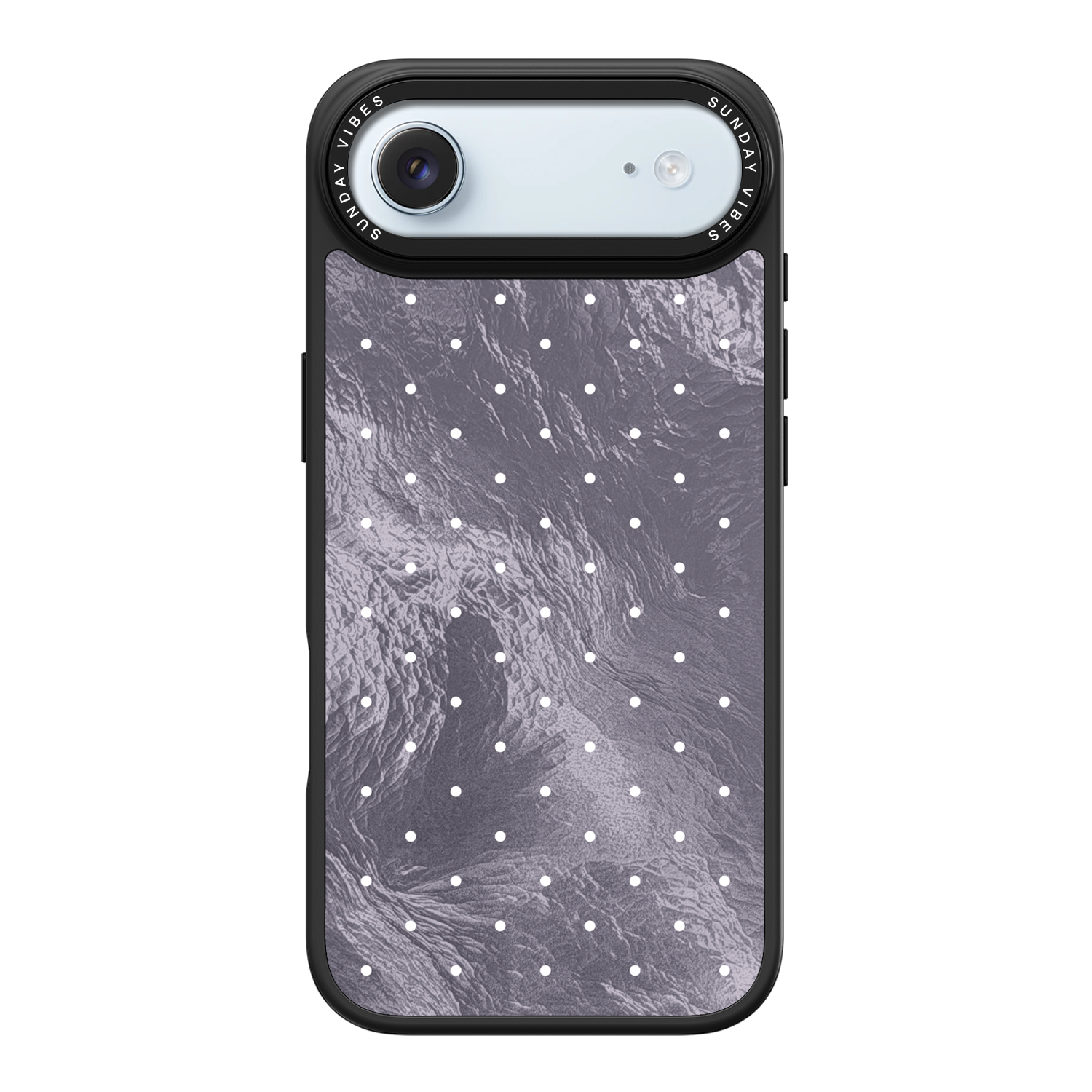 Adorn your device with the ethereal charm of the Silver Moon Dots iPhone Case, silver addon a bit purpleish. This dreamy design features crisp white dots scattered across a pale very light purple/blue holographic background that shimmers and shifts, evoking a serene sky or sparkling water. This gentle yet glamorous aesthetic ensures your phone is a truly captivating accessory. The structural integrity is delivered via a premium 3-layer back panel: featuring a base holographic layer with texture, an ultra HD gallery print layer, and a velvet smooth anti-scratch and anti-fingerprint top coating.