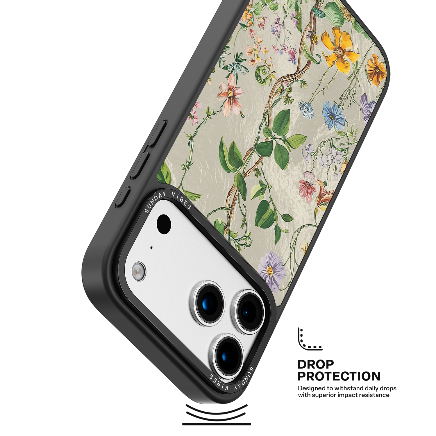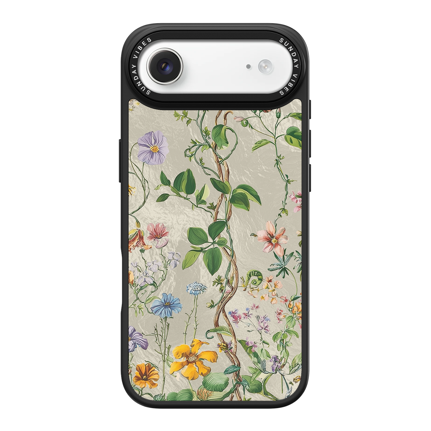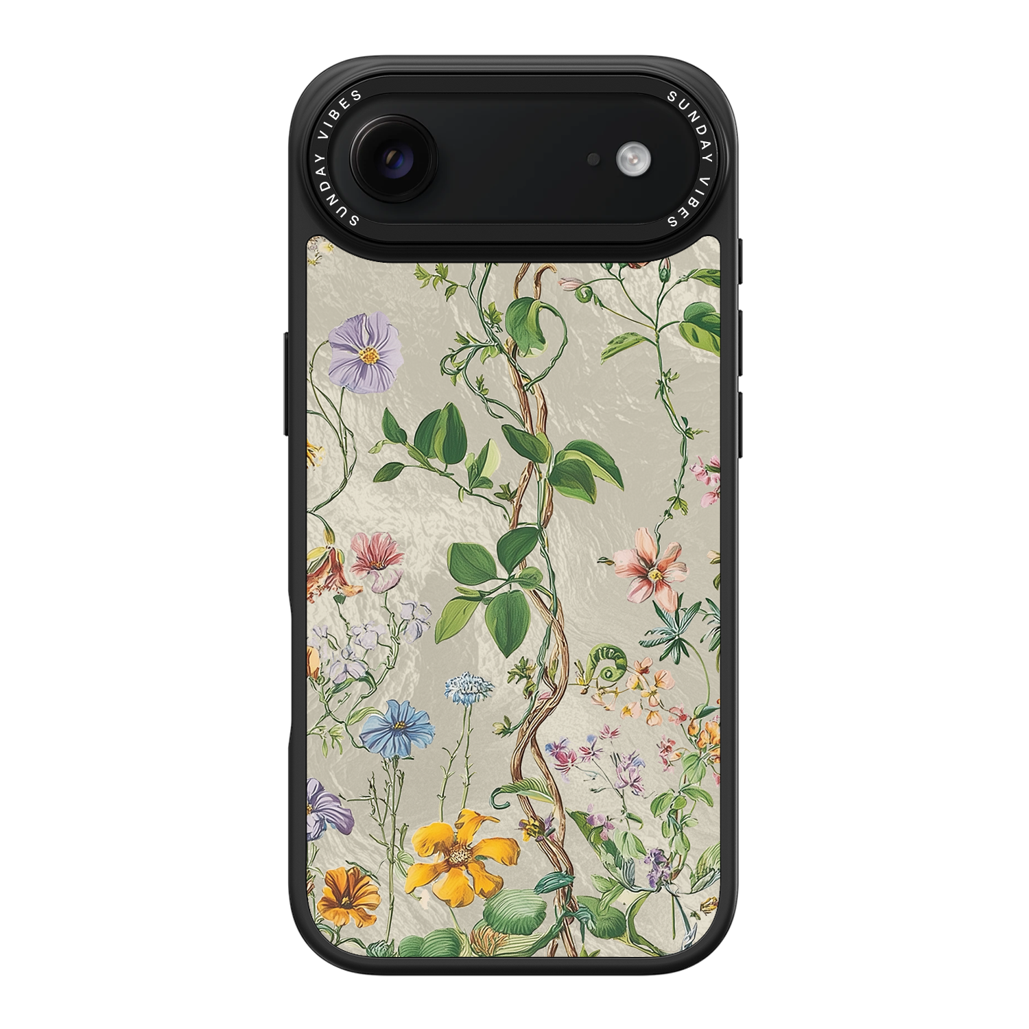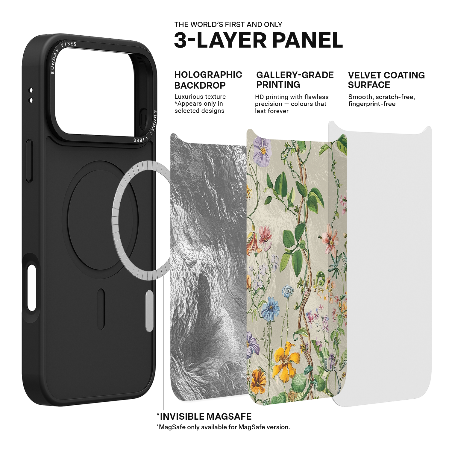 Adorn your device with the elegant artistry of the Silver Vine iPhone Case. This striking design features a detailed botanical illustration of an intricate climbing vine and colourful wild flowers. The beautiful print is set against a dramatically textured, silver holographic background witha little bit gold that shimmers and shifts, merging vintage detail with a sophisticated metallic aesthetic. The case is built with a premium 3-layer back panel: a base holographic layer with texture, a middle ultra HD gallery print layer, and a velvet smooth anti-scratch and anti-fingerprint top coating.