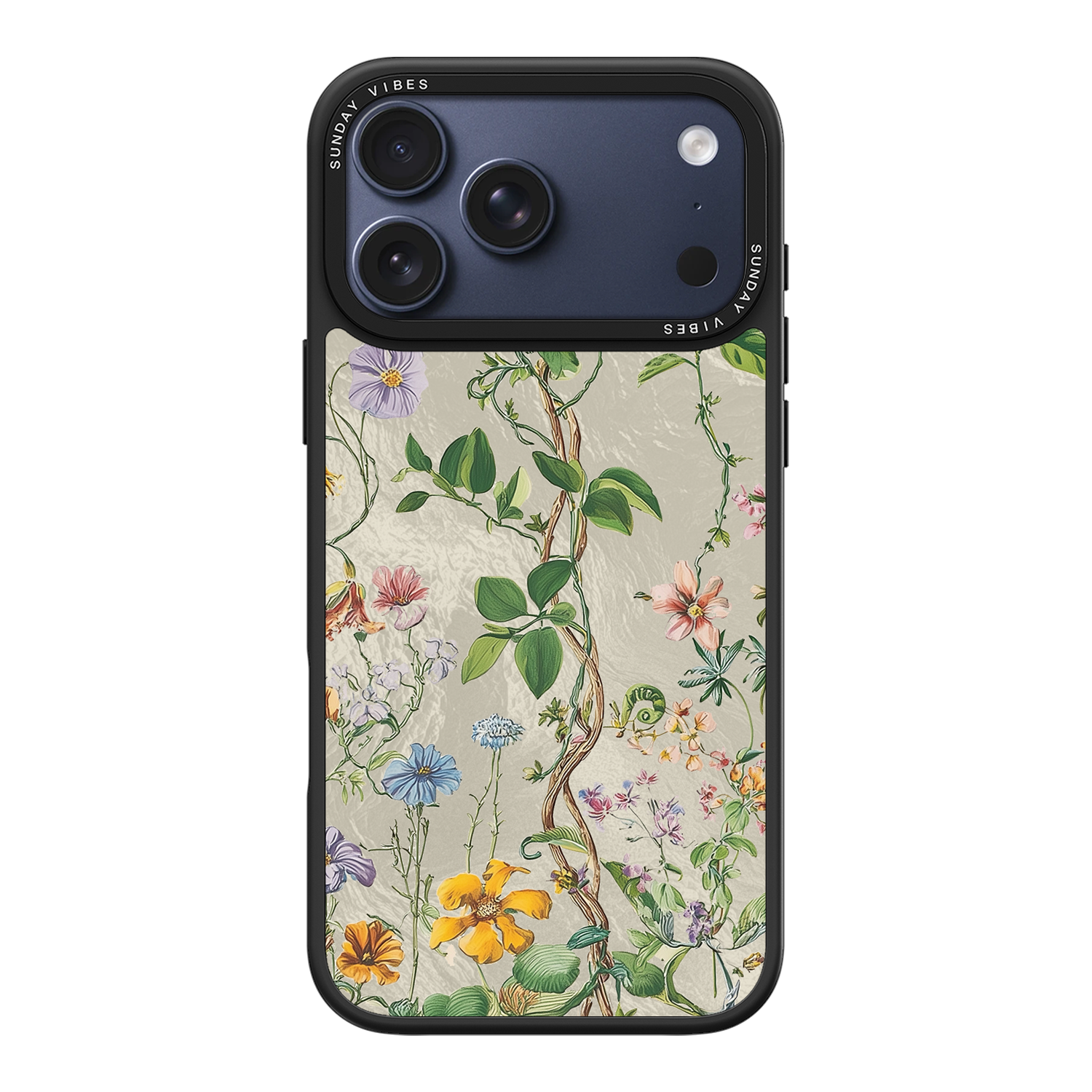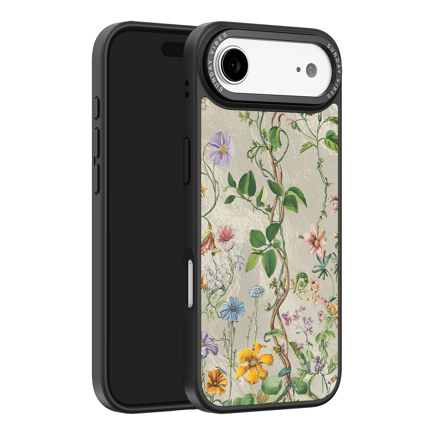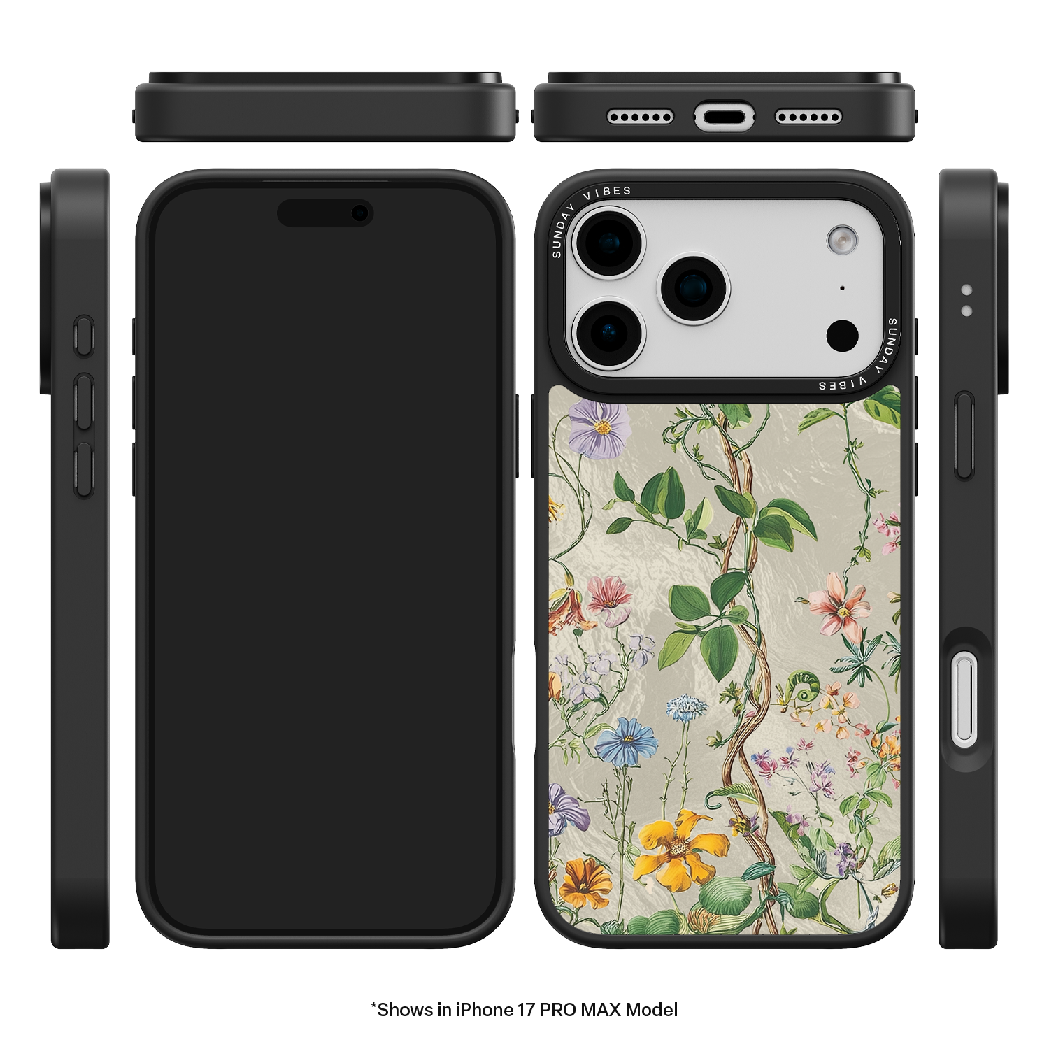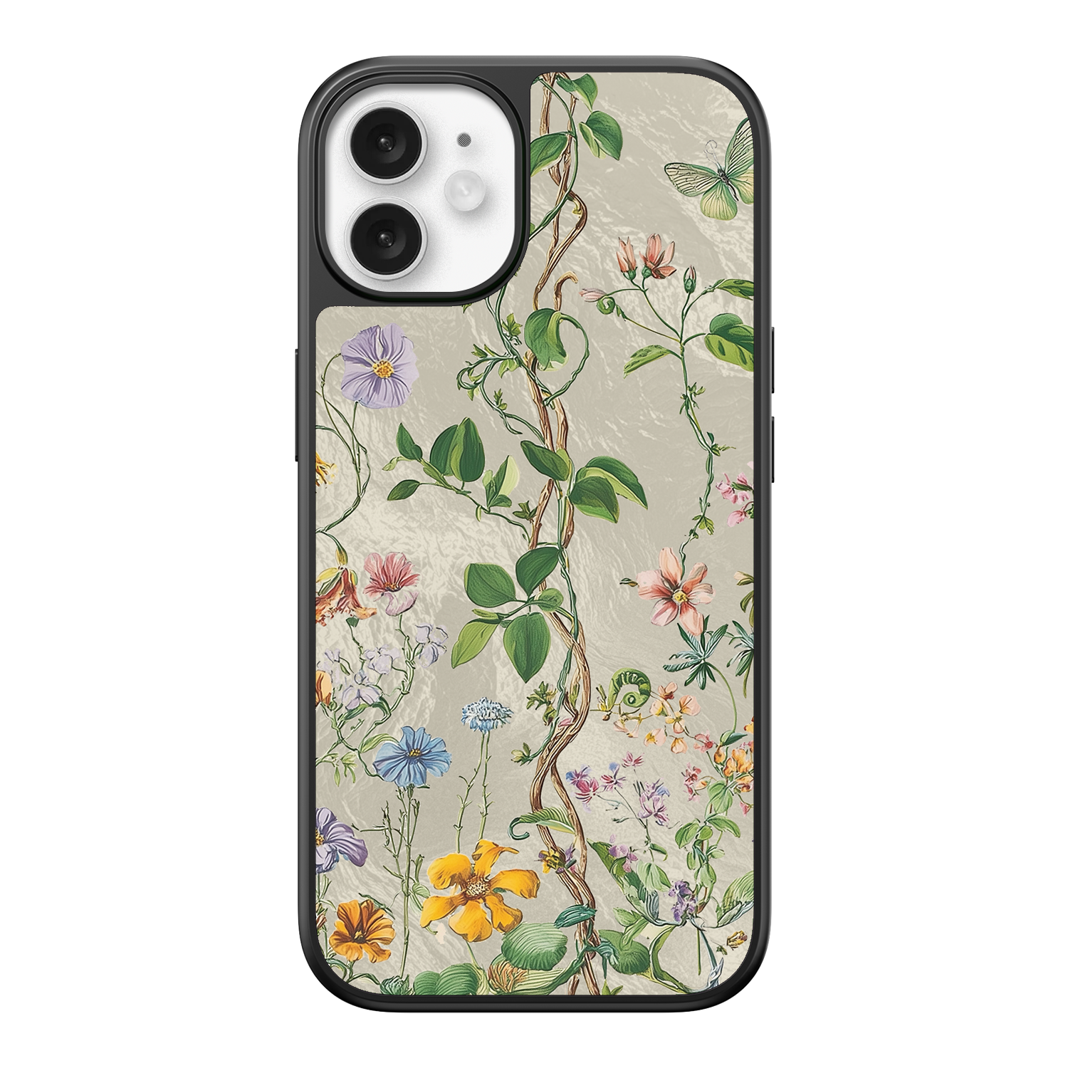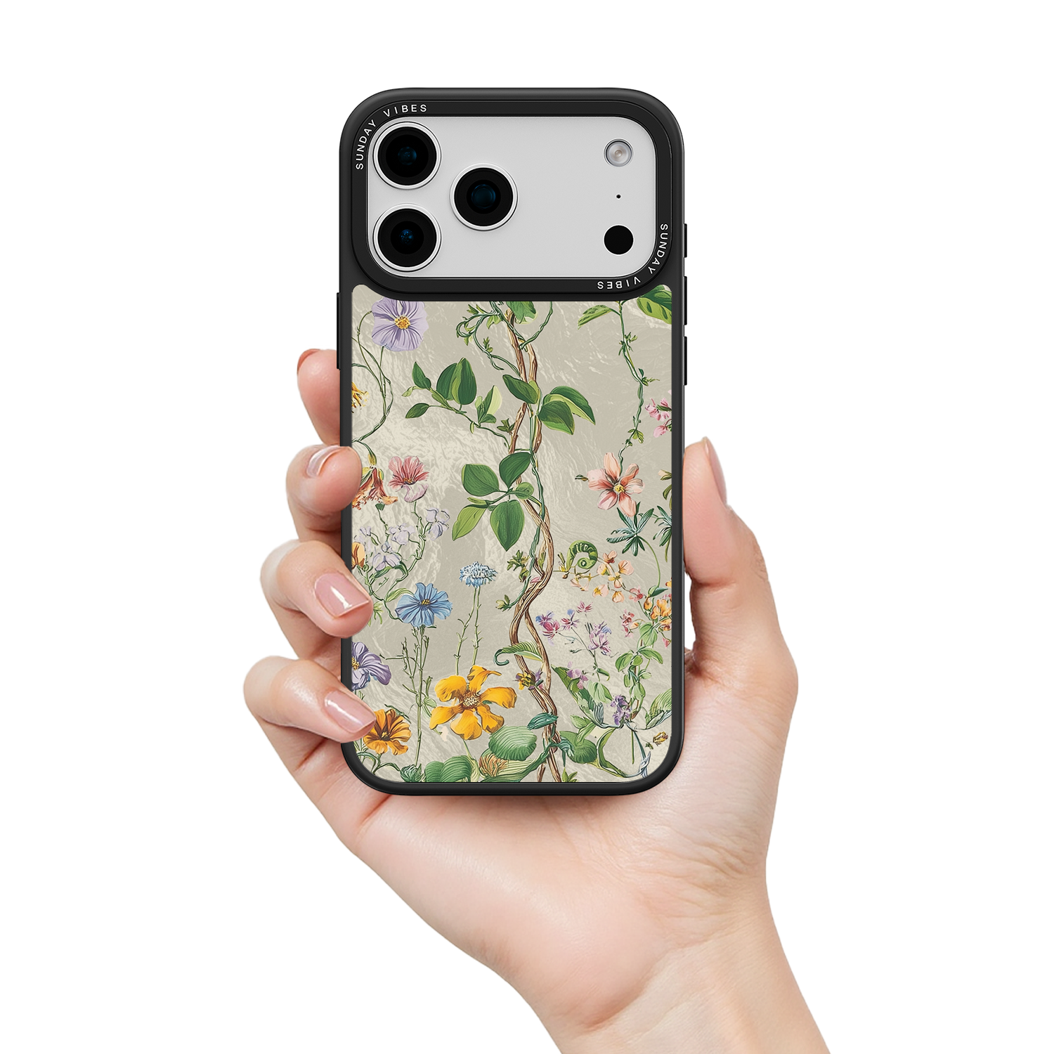 Adorn your device with the elegant artistry of the Silver Vine iPhone Case. This striking design features a detailed botanical illustration of an intricate climbing vine and colourful wild flowers. The beautiful print is set against a dramatically textured, silver holographic background witha little bit gold that shimmers and shifts, merging vintage detail with a sophisticated metallic aesthetic. The case is built with a premium 3-layer back panel: a base holographic layer with texture, a middle ultra HD gallery print layer, and a velvet smooth anti-scratch and anti-fingerprint top coating.