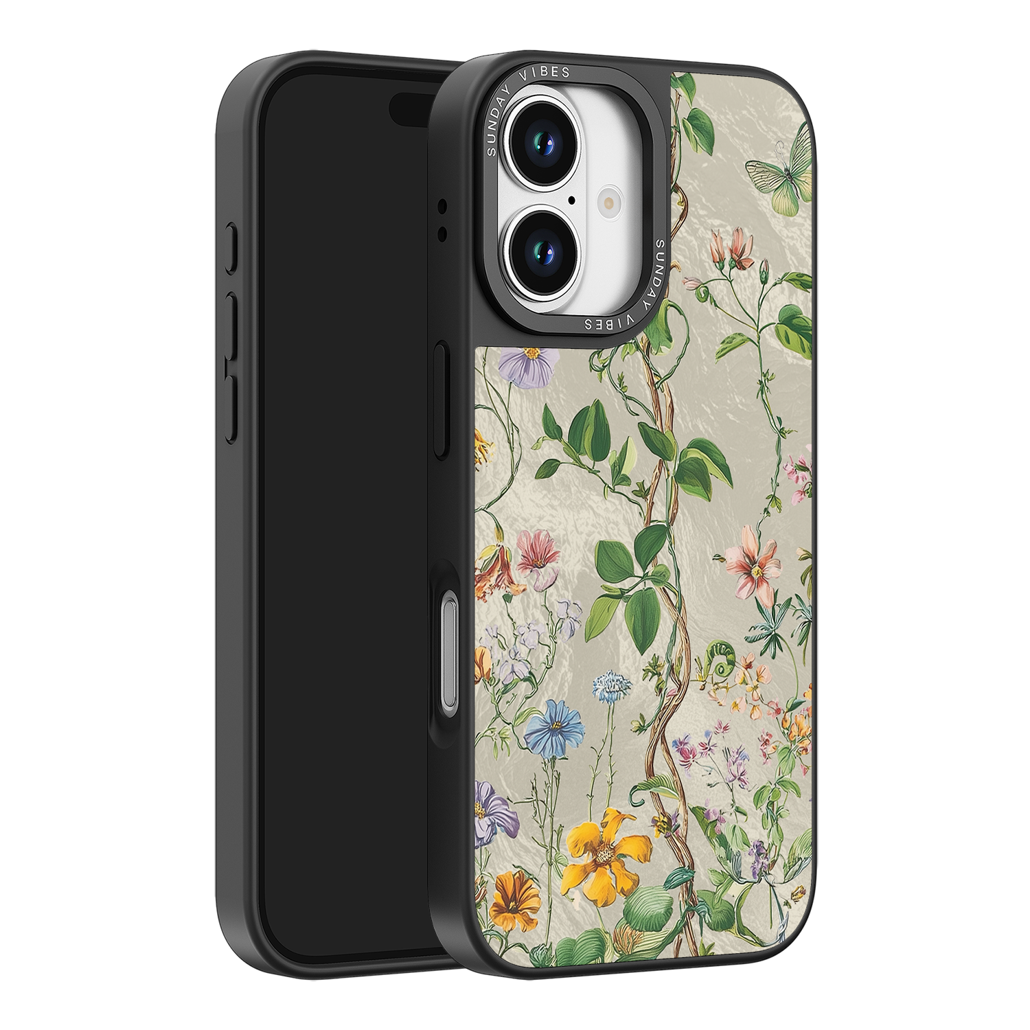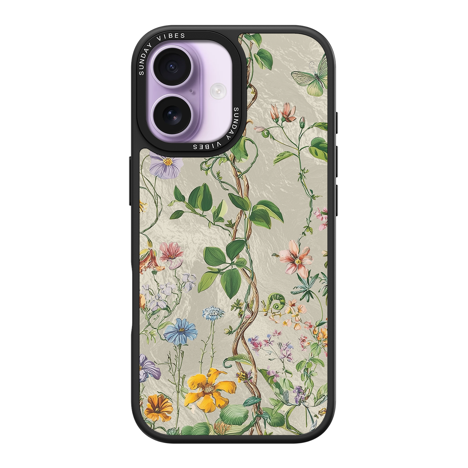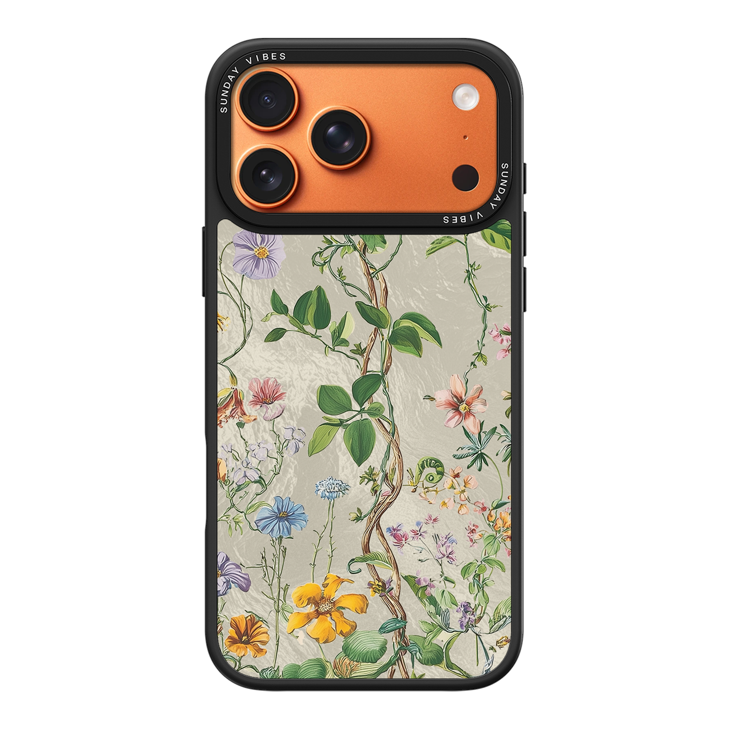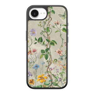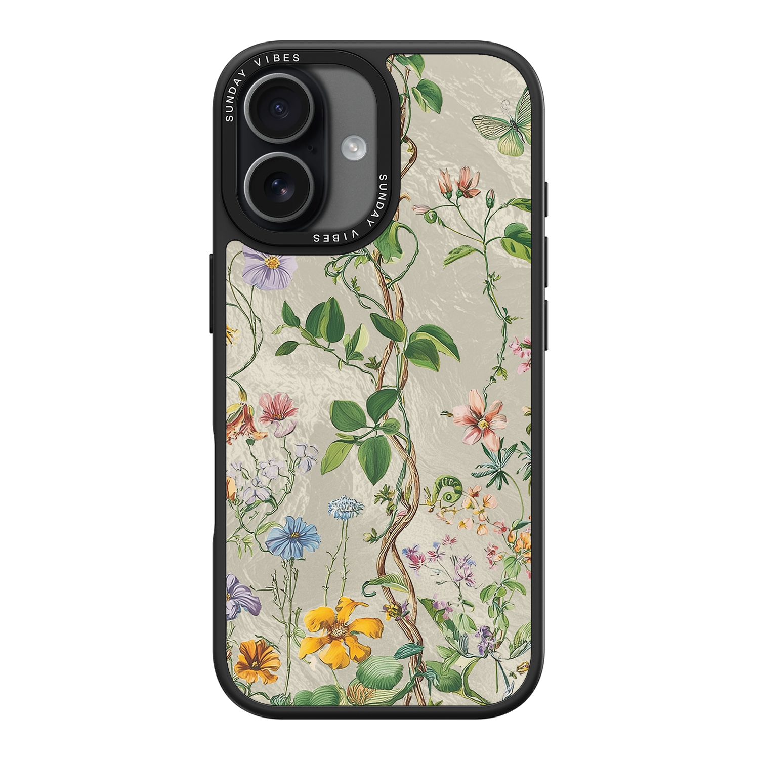 Adorn your device with the elegant artistry of the Silver Vine iPhone Case. This striking design features a detailed botanical illustration of an intricate climbing vine and colourful wild flowers. The beautiful print is set against a dramatically textured, silver holographic background witha little bit gold that shimmers and shifts, merging vintage detail with a sophisticated metallic aesthetic. The case is built with a premium 3-layer back panel: a base holographic layer with texture, a middle ultra HD gallery print layer, and a velvet smooth anti-scratch and anti-fingerprint top coating.