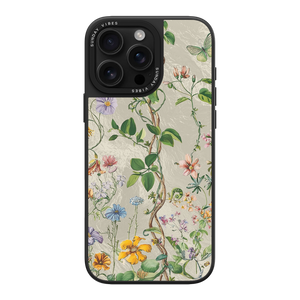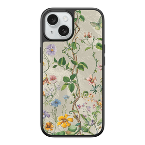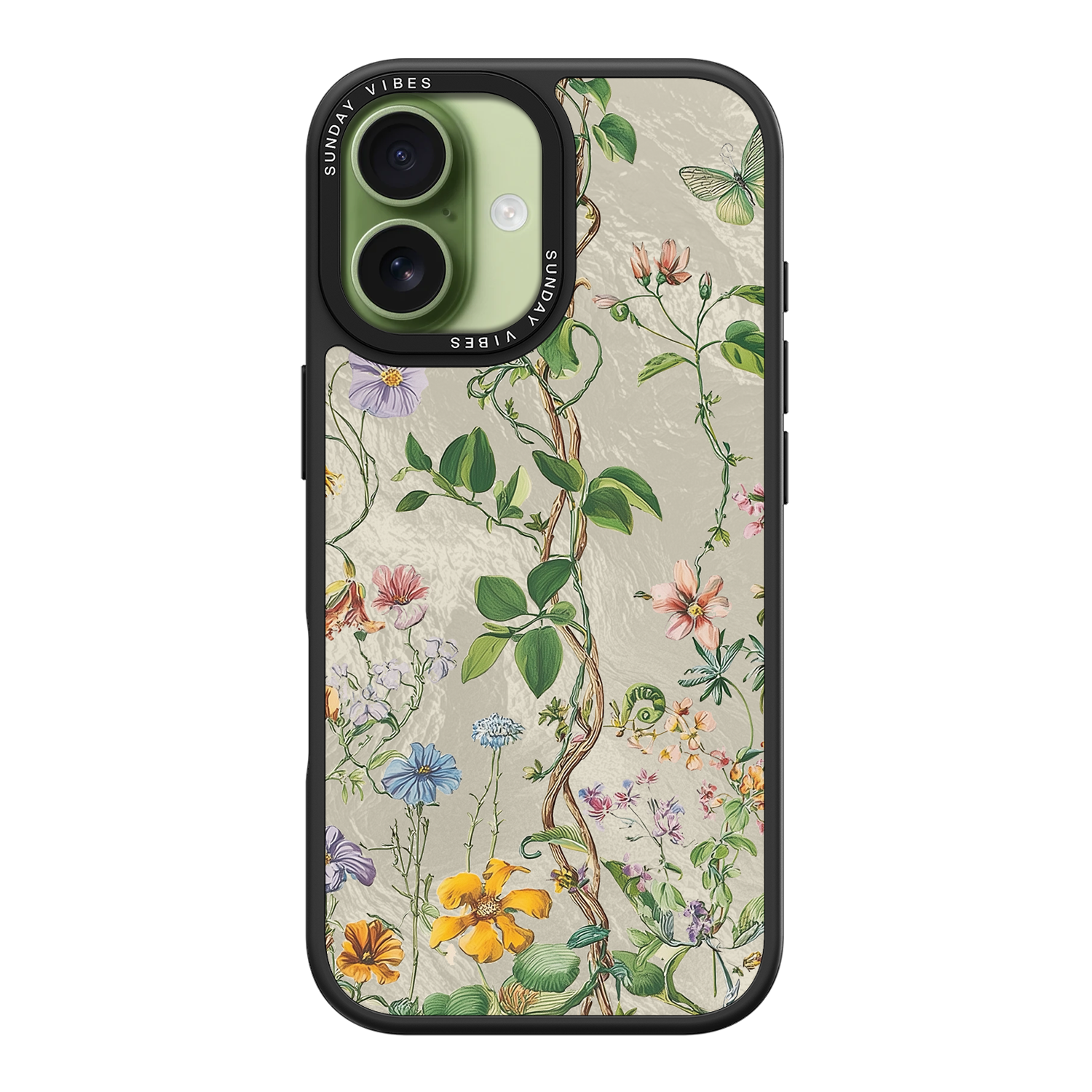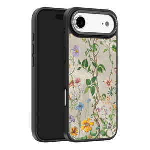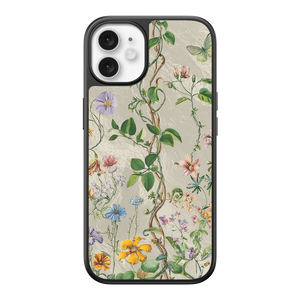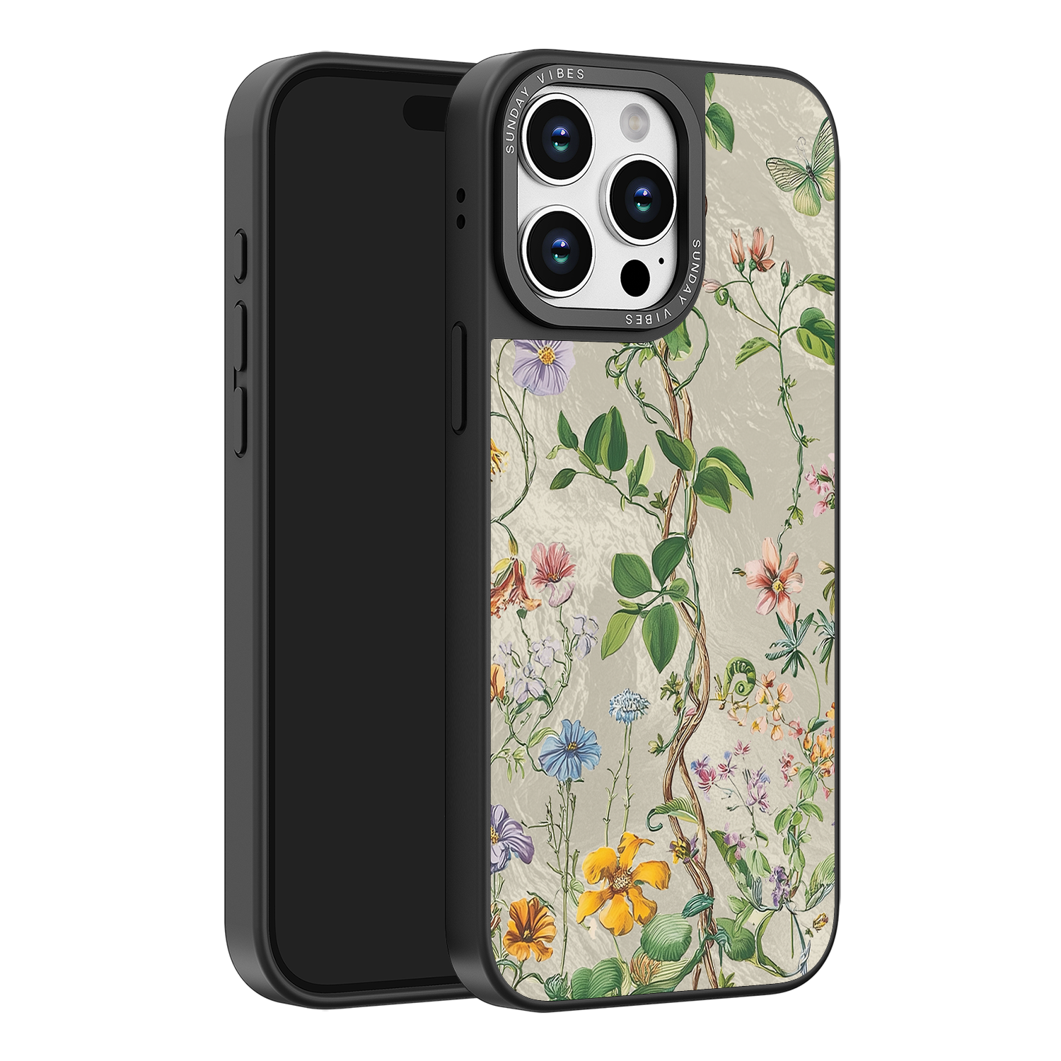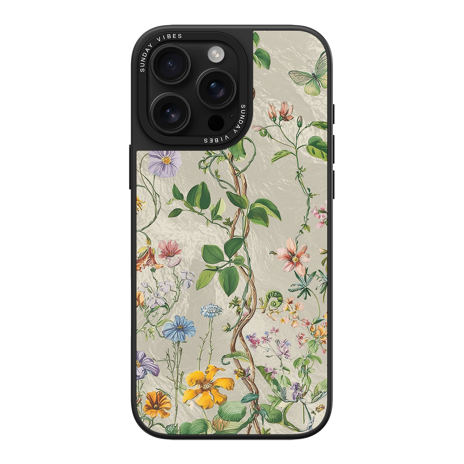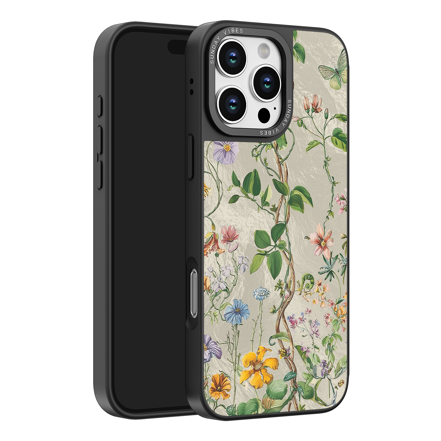 Adorn your device with the elegant artistry of the Silver Vine iPhone Case. This striking design features a detailed botanical illustration of an intricate climbing vine and colourful wild flowers. The beautiful print is set against a dramatically textured, silver holographic background witha little bit gold that shimmers and shifts, merging vintage detail with a sophisticated metallic aesthetic. The case is built with a premium 3-layer back panel: a base holographic layer with texture, a middle ultra HD gallery print layer, and a velvet smooth anti-scratch and anti-fingerprint top coating.
