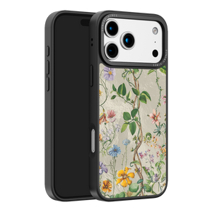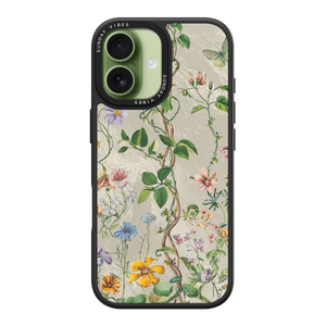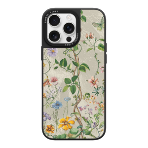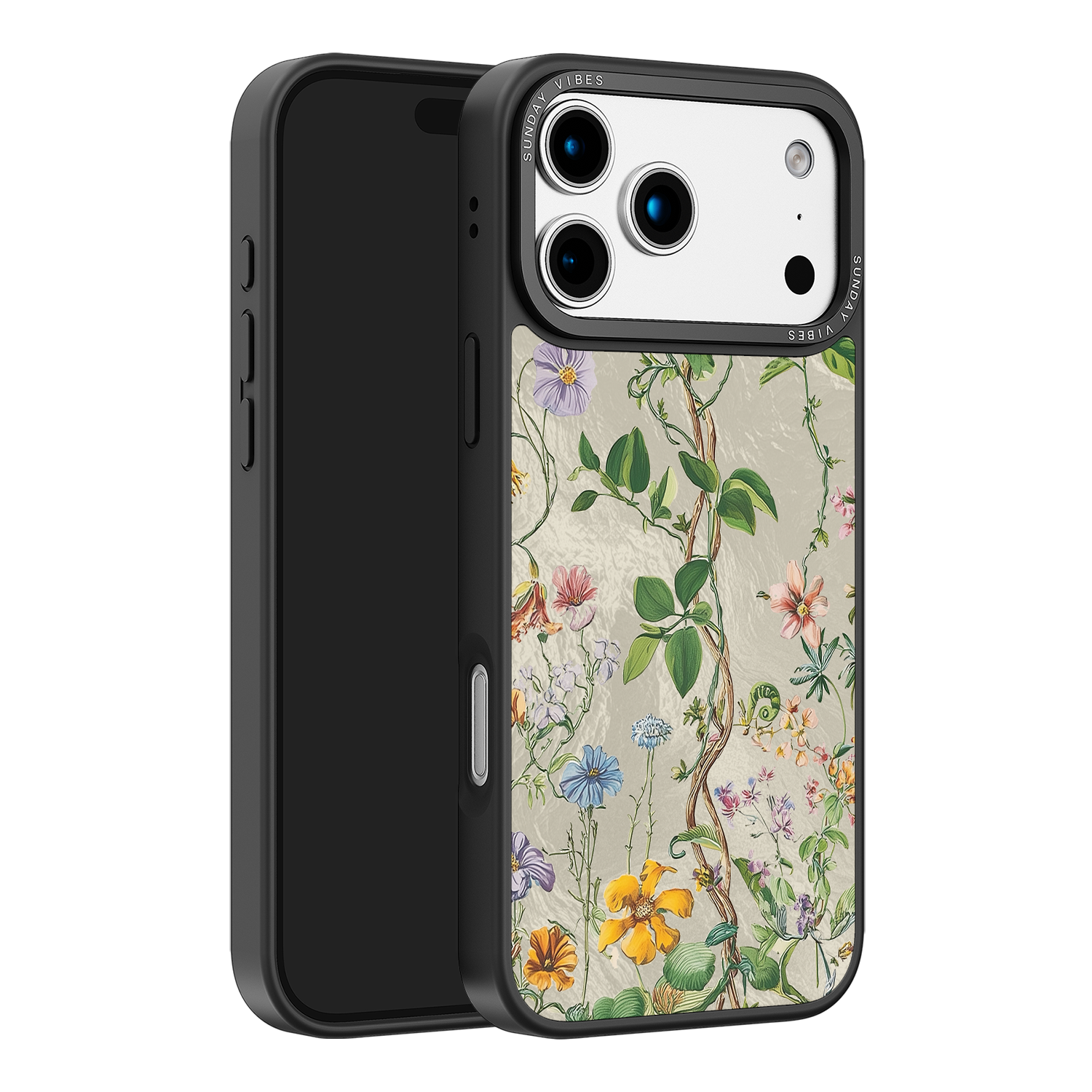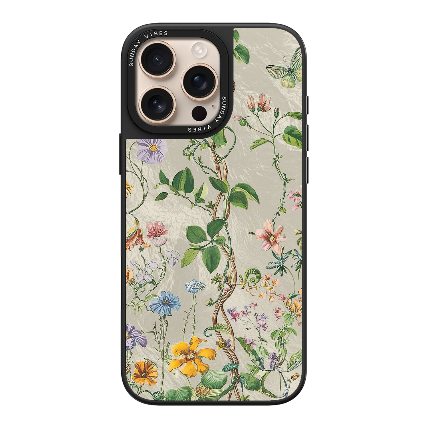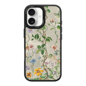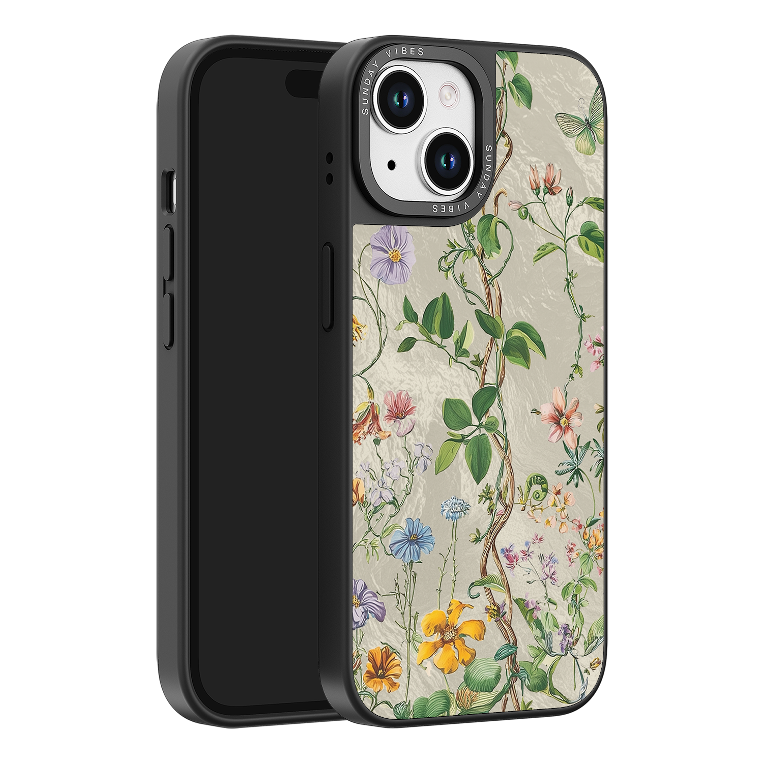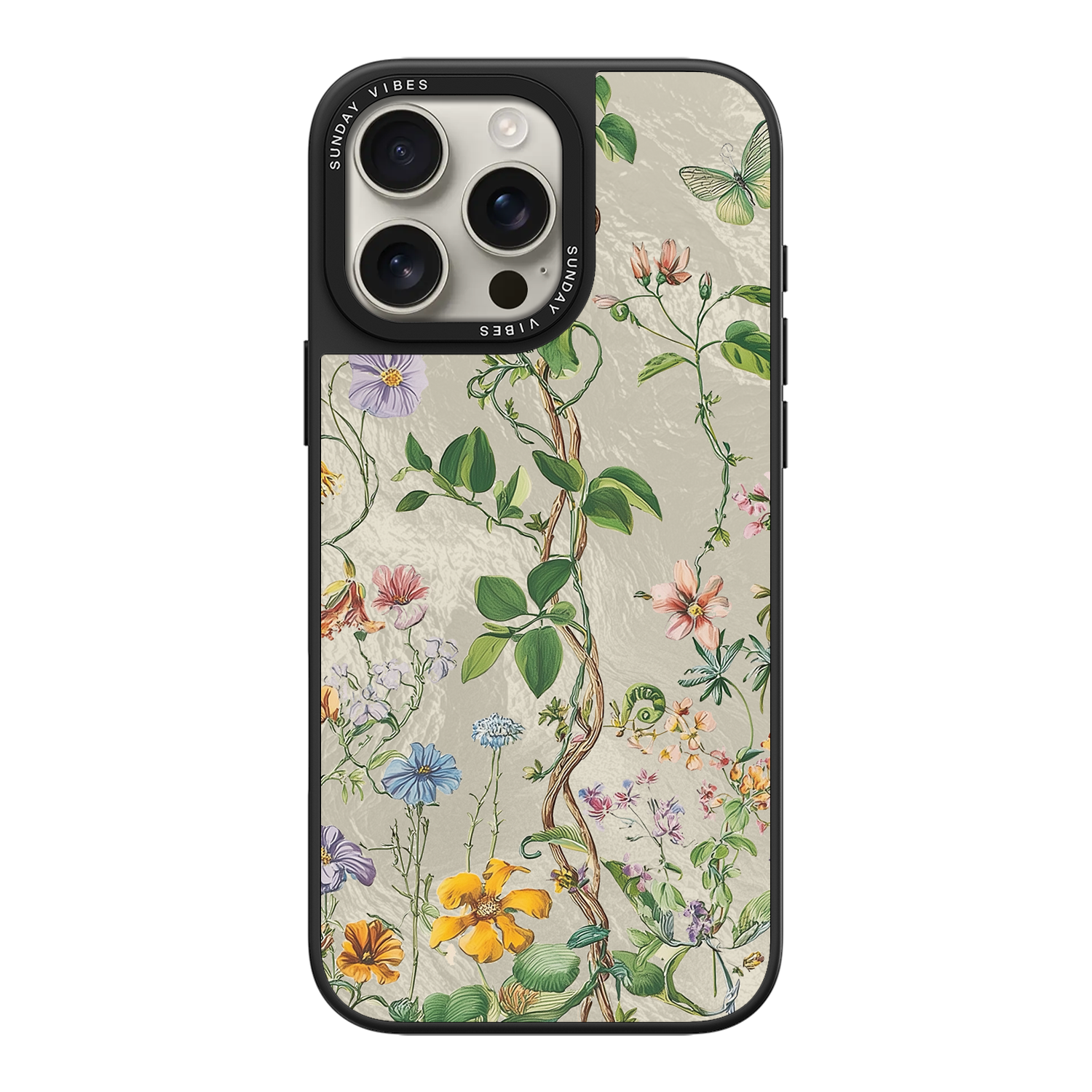Adorn your device with the elegant artistry of the Silver Vine iPhone Case. This striking design features a detailed botanical illustration of an intricate climbing vine and colourful wild flowers. The beautiful print is set against a dramatically textured, silver holographic background witha little bit gold that shimmers and shifts, merging vintage detail with a sophisticated metallic aesthetic. The case is built with a premium 3-layer back panel: a base holographic layer with texture, a middle ultra HD gallery print layer, and a velvet smooth anti-scratch and anti-fingerprint top coating.