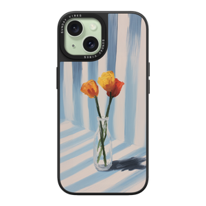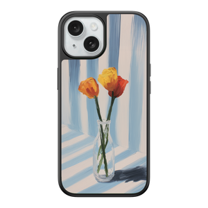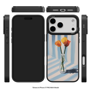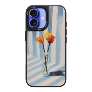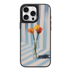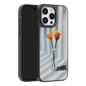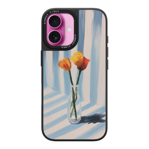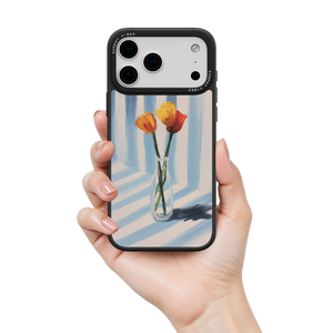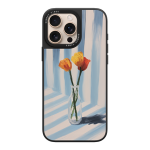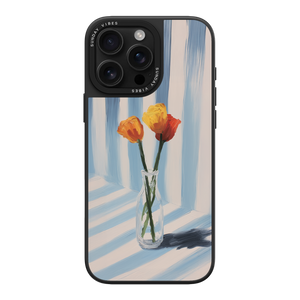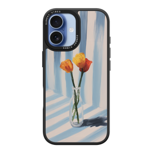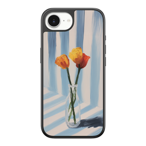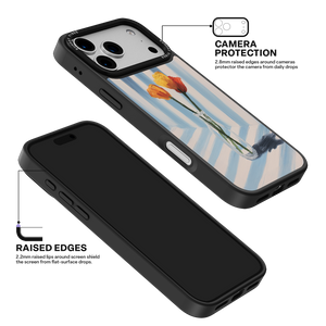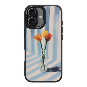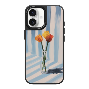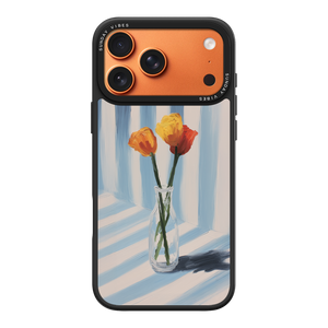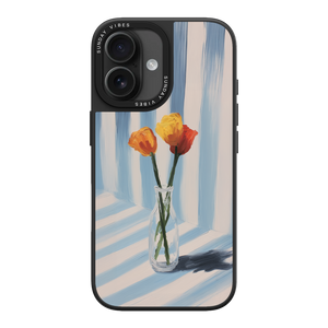 Adorn your device with the expressive artistry of the Vase Verse iPhone Case. This striking design showcases a painterly arrangement of warm-toned tulips set against a dramatic, bold blue and white striped background, bringing a powerful artistic flair to your daily style. The case is built with a premium 3-layer back panel: a base layer for protection, a middle ultra HD gallery print layer, and a velvet smooth anti-scratch and anti-fingerprint top coating.