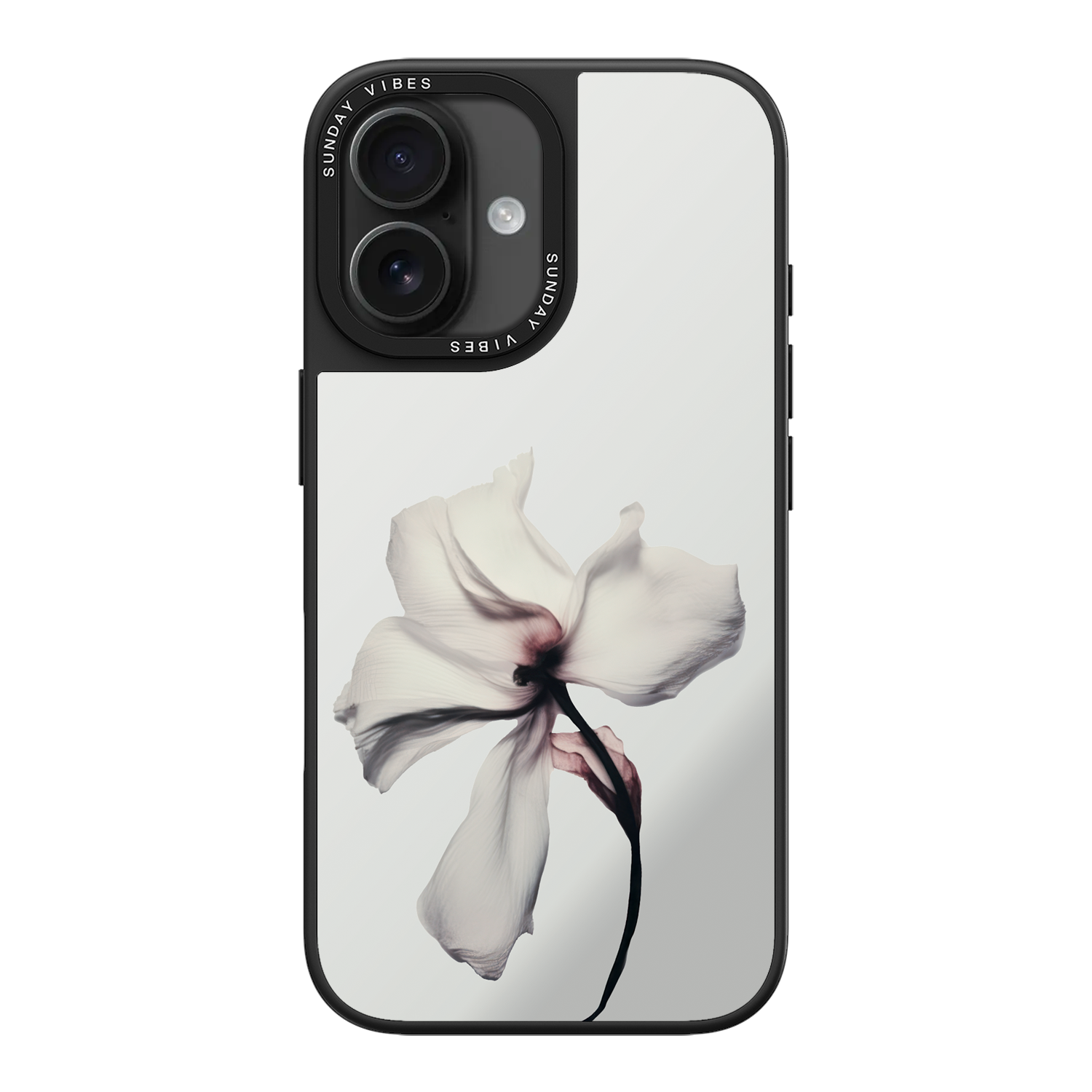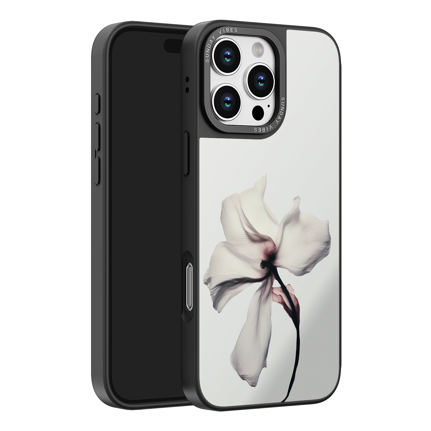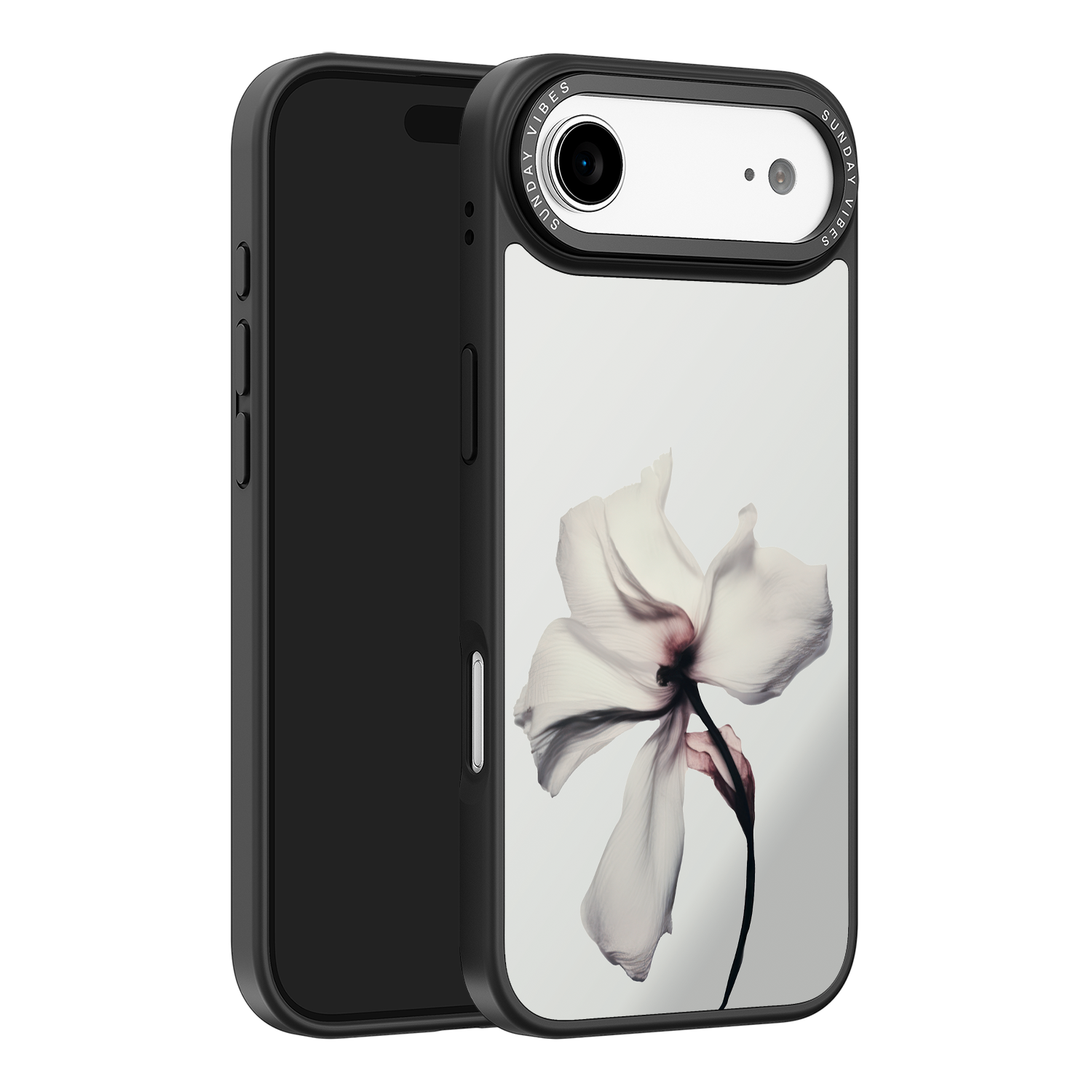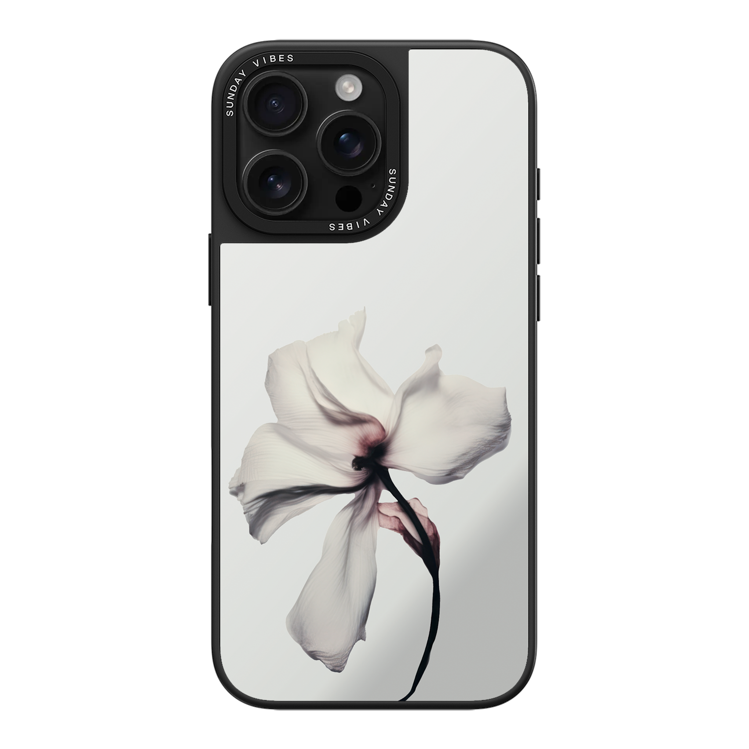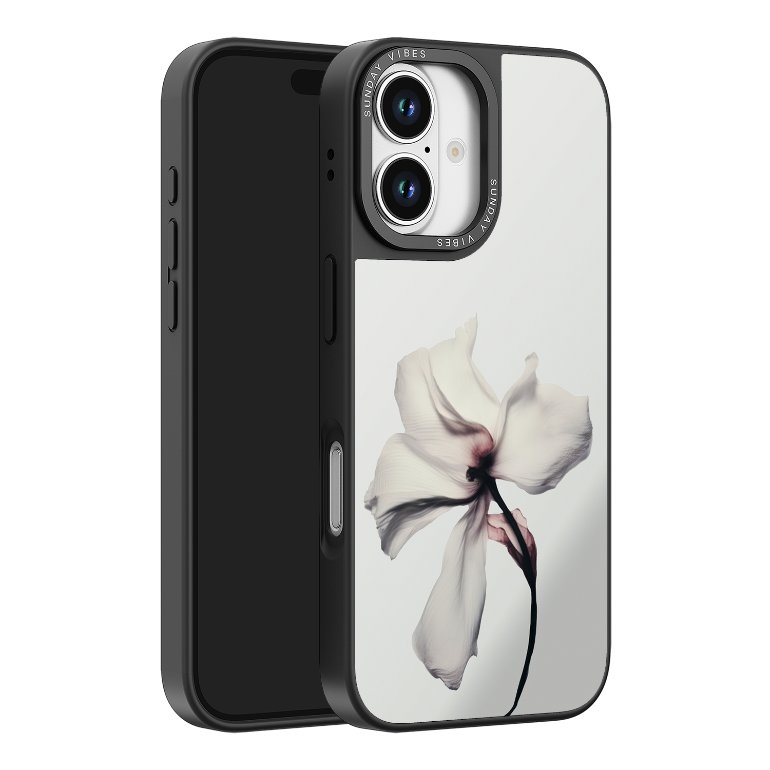 Elevate your look with the stark, sophisticated glamour of the White Shadow iPhone Case. The minimalist print features the dramatic outline and soft texture of a solitary bloom, perfectly contrasting the high-shine reflective silver backdrop. This design merges a clean, contemporary aesthetic with essential mirror convenience.