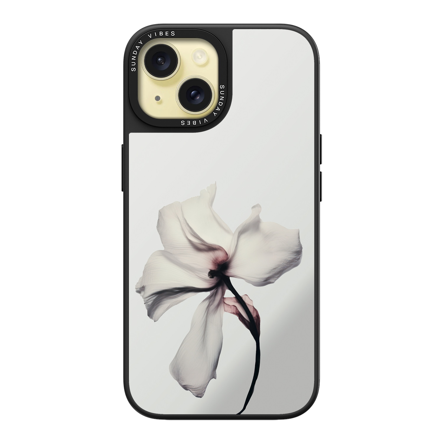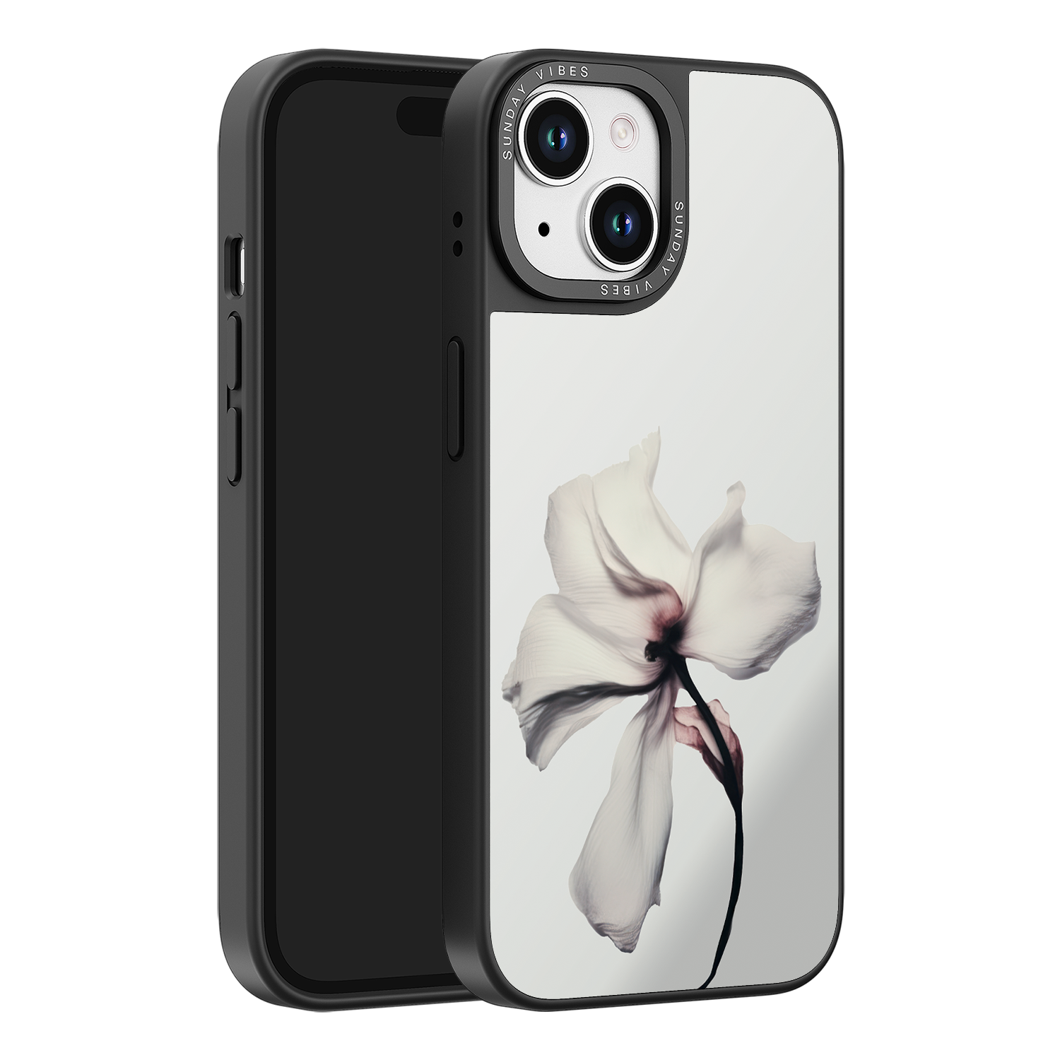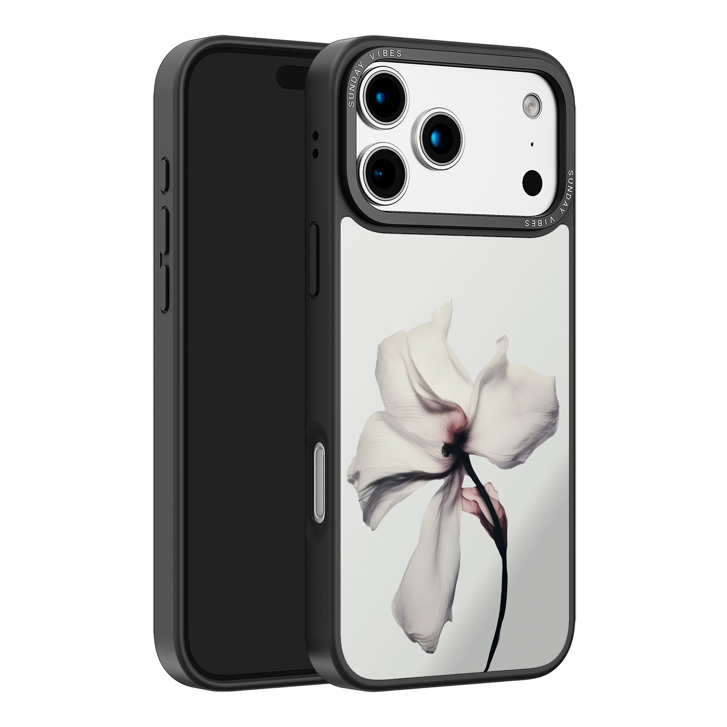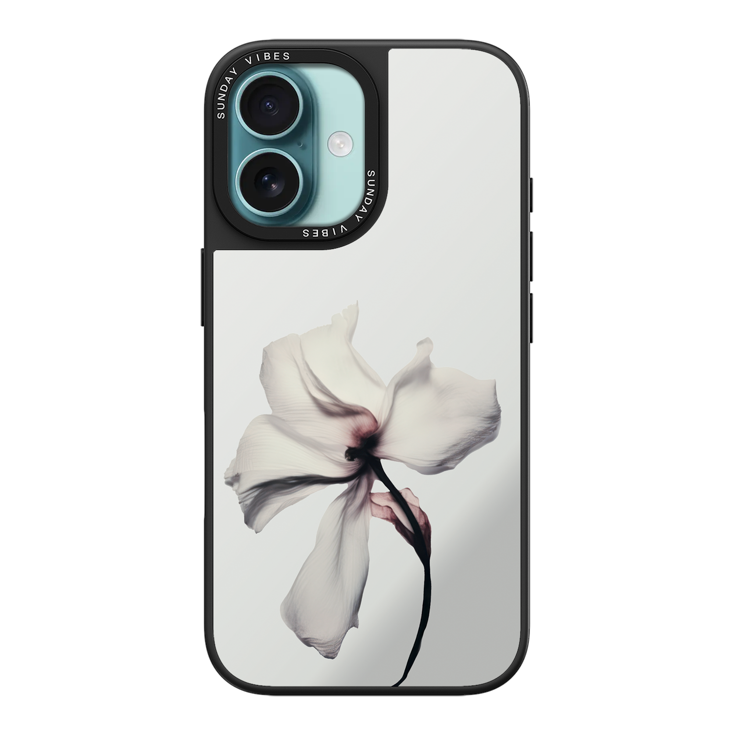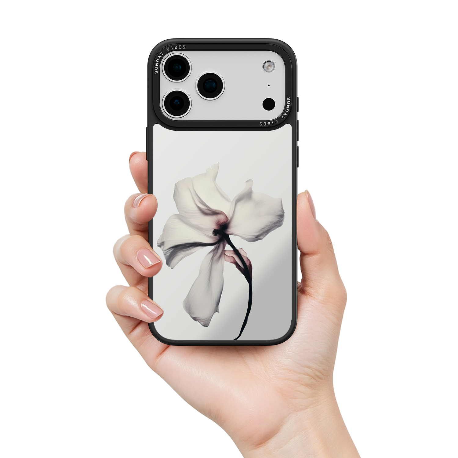 Elevate your look with the stark, sophisticated glamour of the White Shadow iPhone Case. The minimalist print features the dramatic outline and soft texture of a solitary bloom, perfectly contrasting the high-shine reflective silver backdrop. This design merges a clean, contemporary aesthetic with essential mirror convenience.