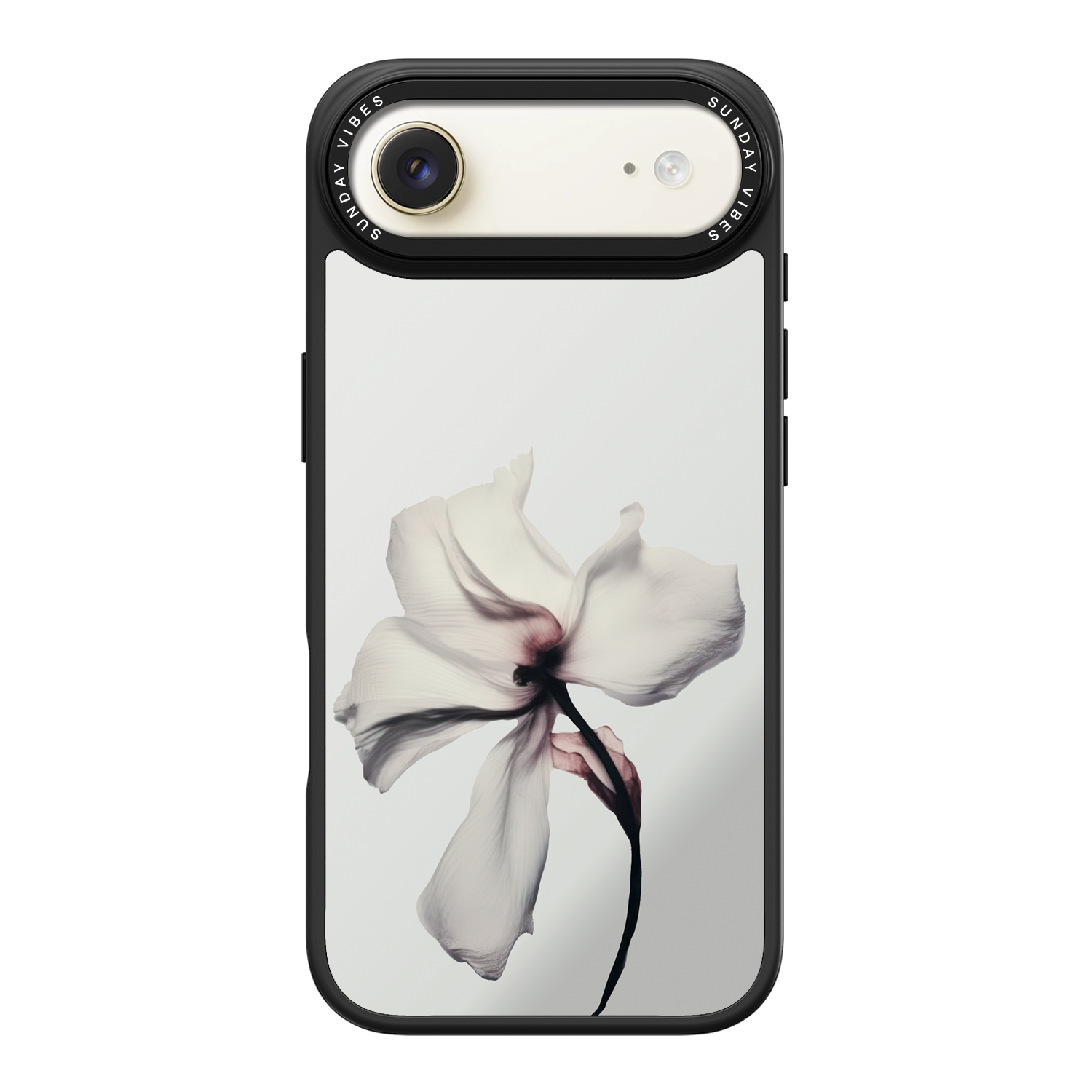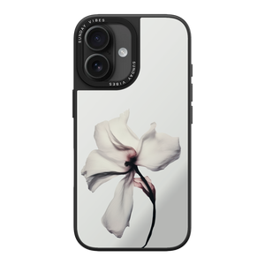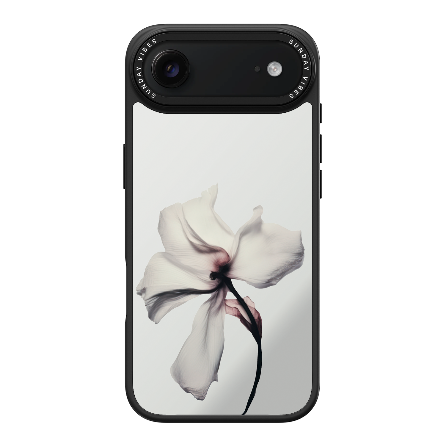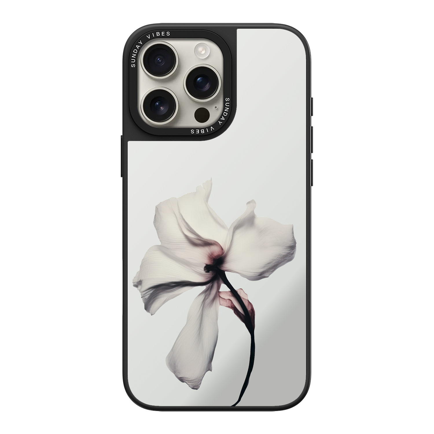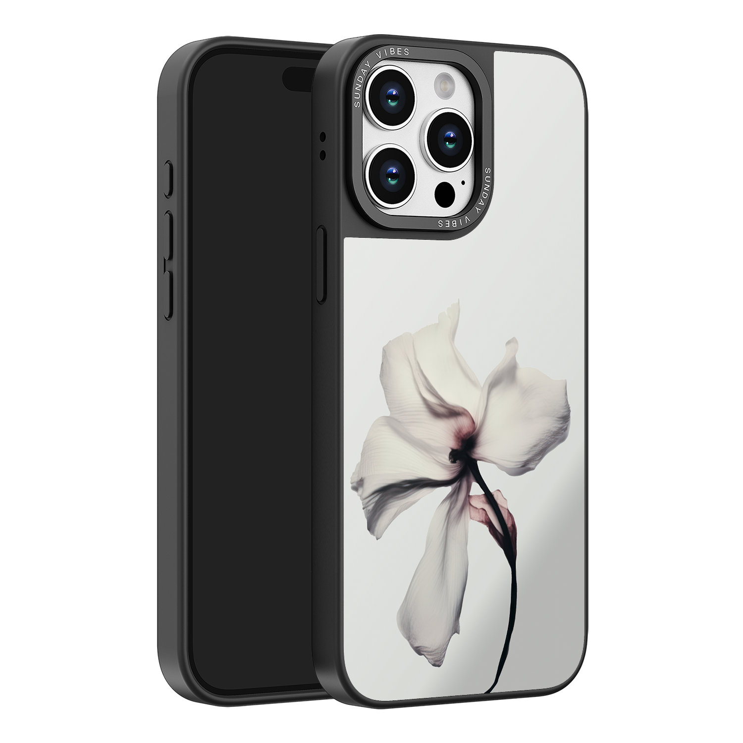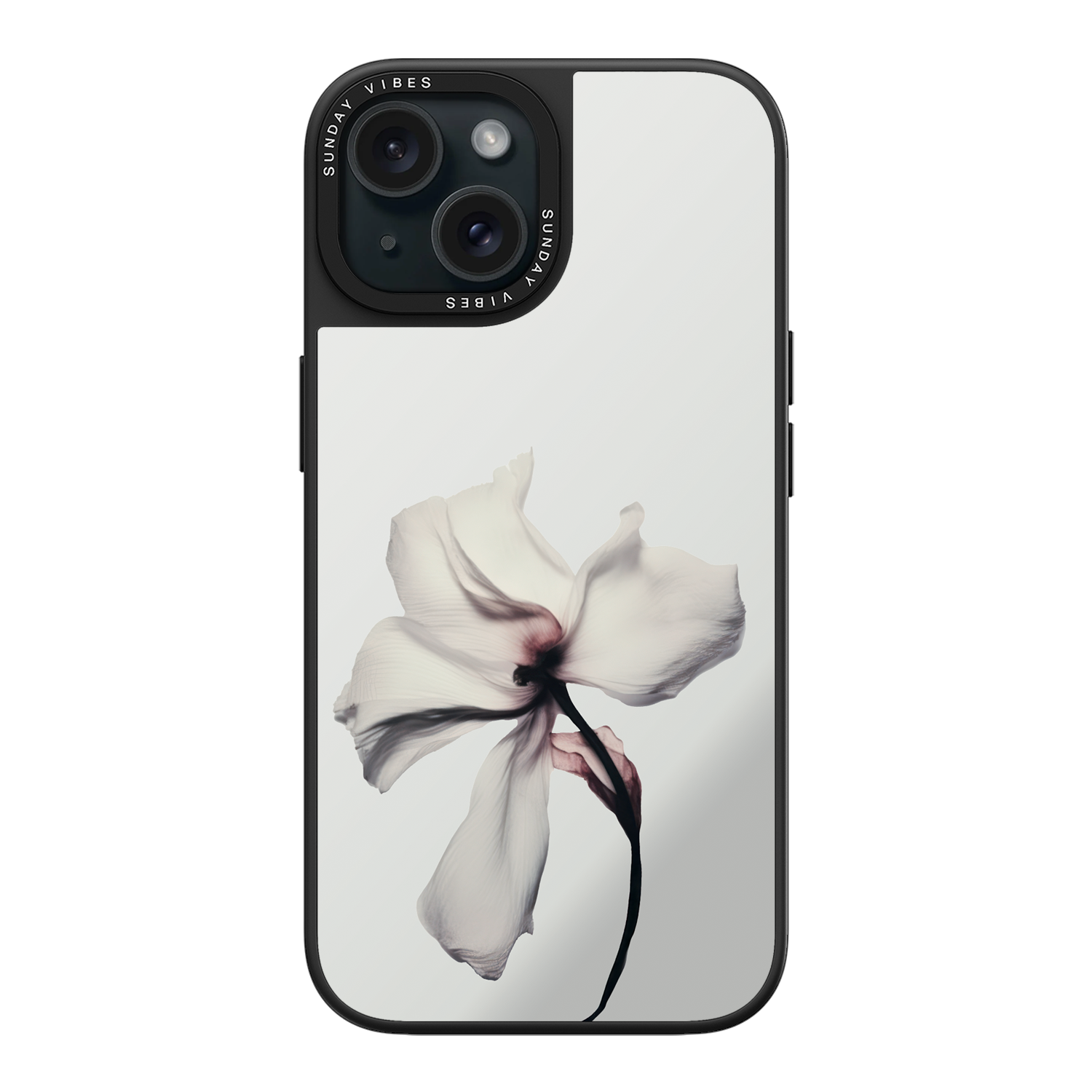 Elevate your look with the stark, sophisticated glamour of the White Shadow iPhone Case. The minimalist print features the dramatic outline and soft texture of a solitary bloom, perfectly contrasting the high-shine reflective silver backdrop. This design merges a clean, contemporary aesthetic with essential mirror convenience.