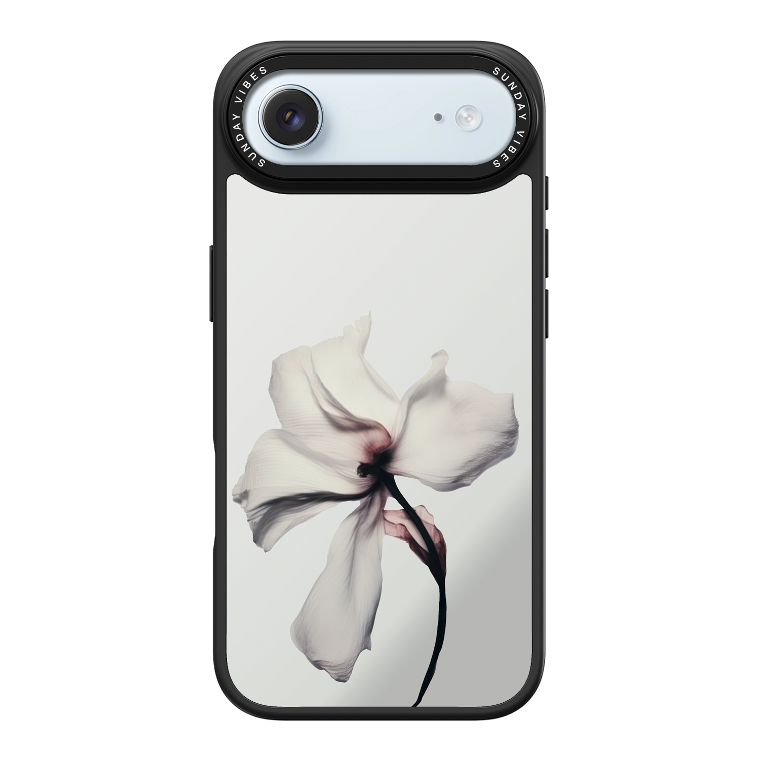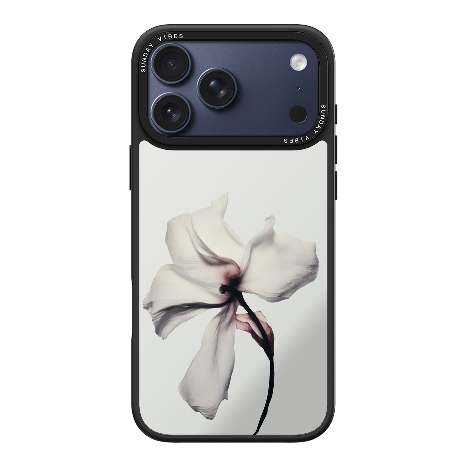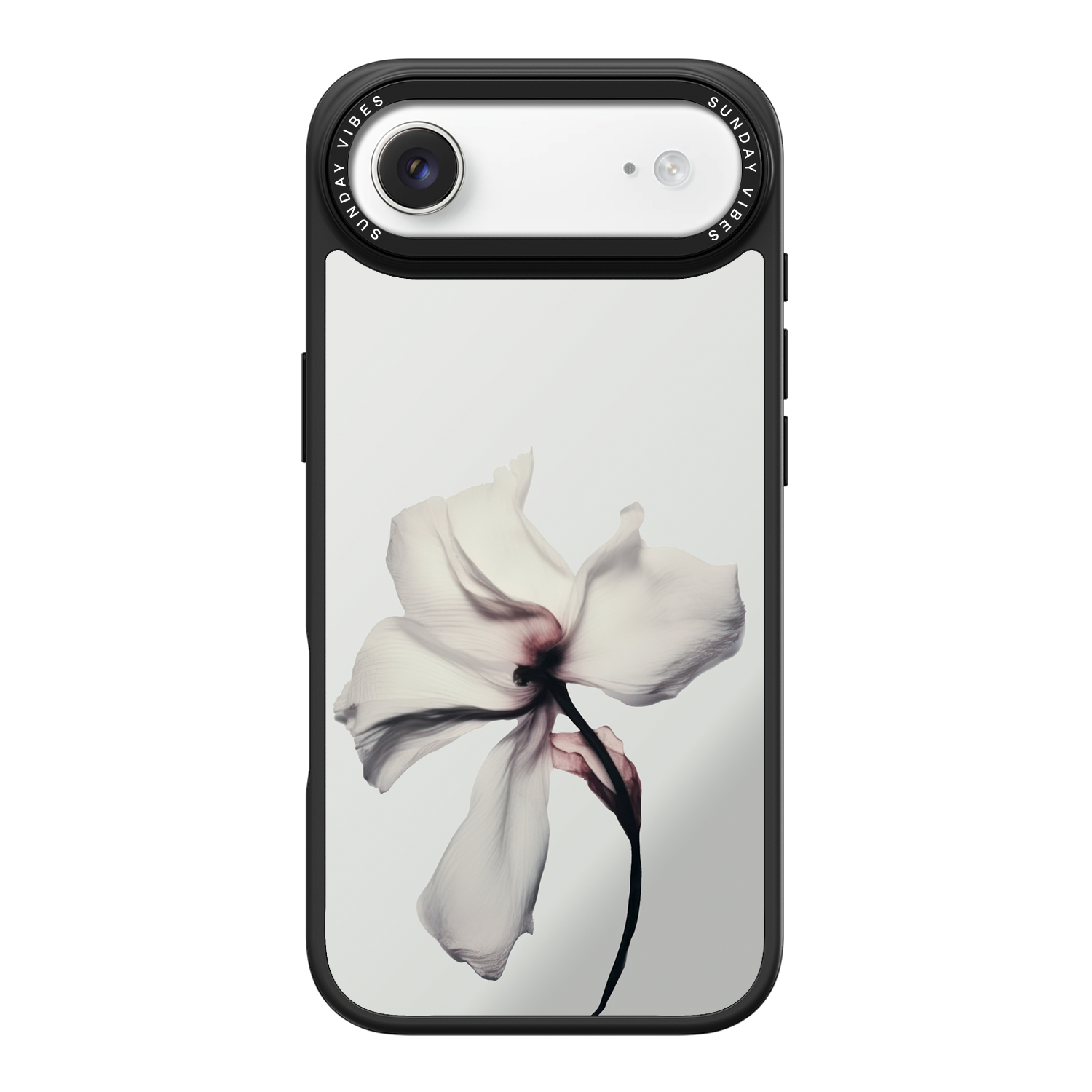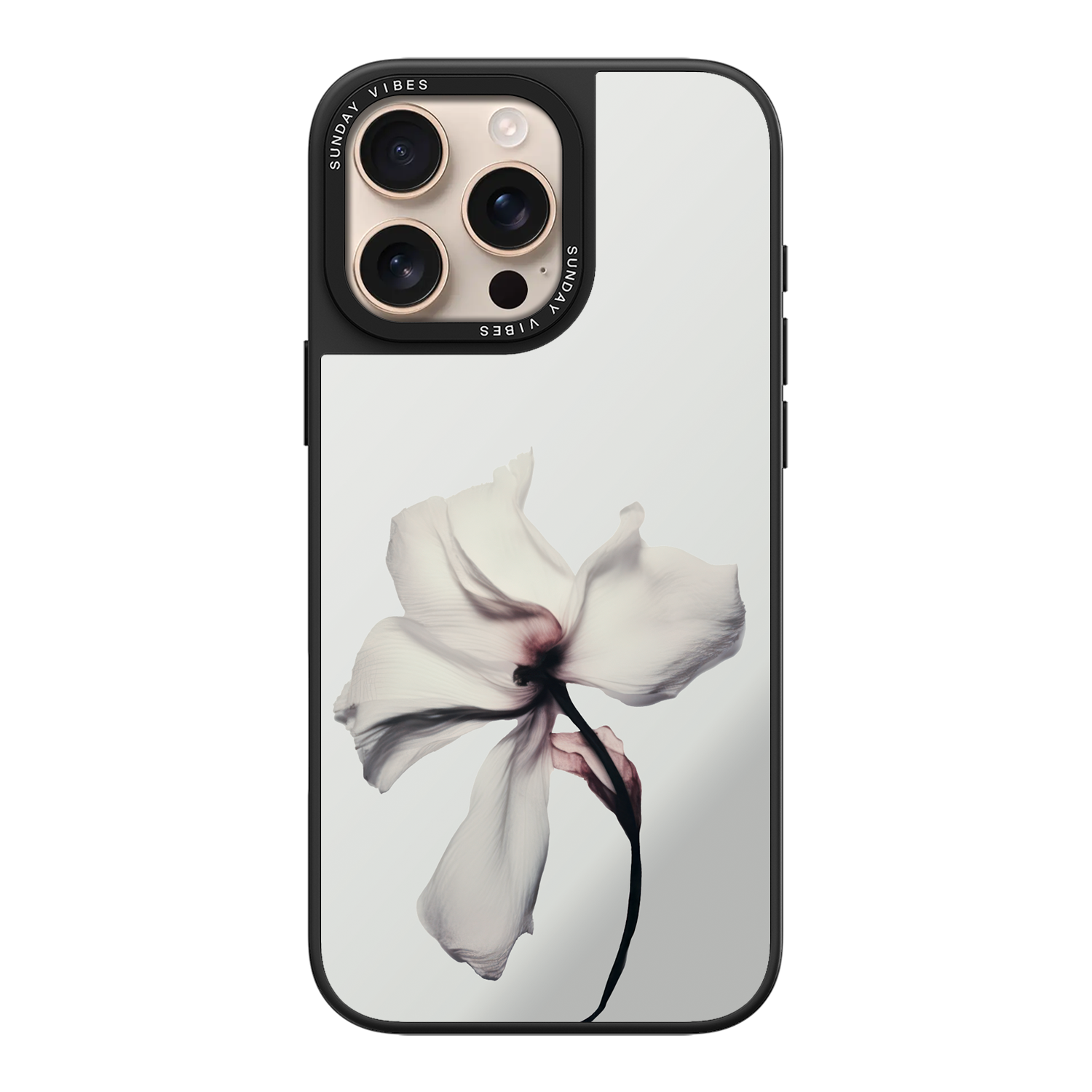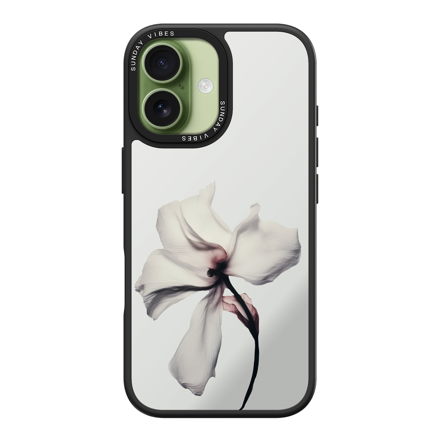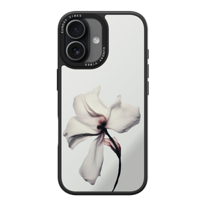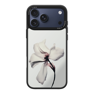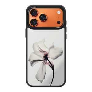 Elevate your look with the stark, sophisticated glamour of the White Shadow iPhone Case. The minimalist print features the dramatic outline and soft texture of a solitary bloom, perfectly contrasting the high-shine reflective silver backdrop. This design merges a clean, contemporary aesthetic with essential mirror convenience.