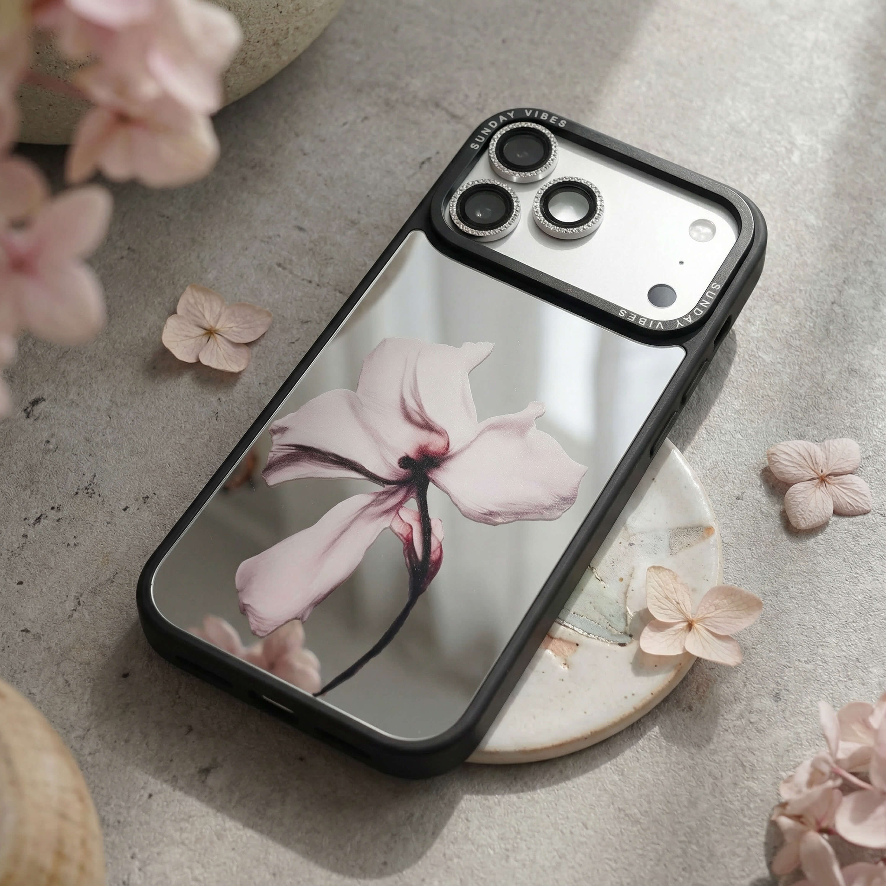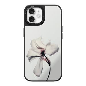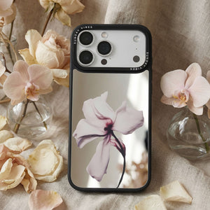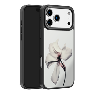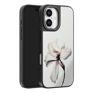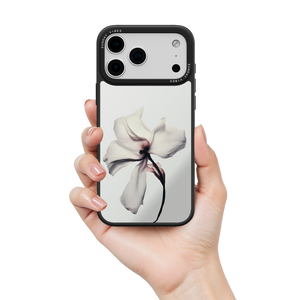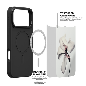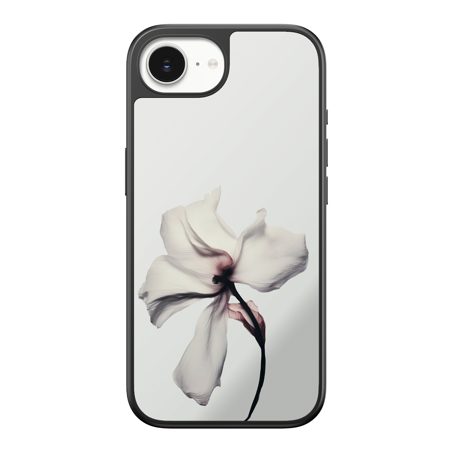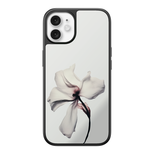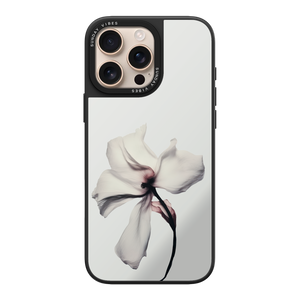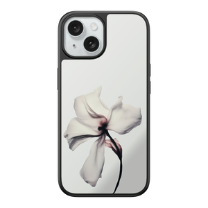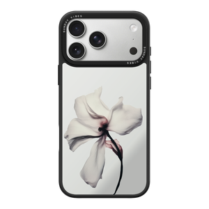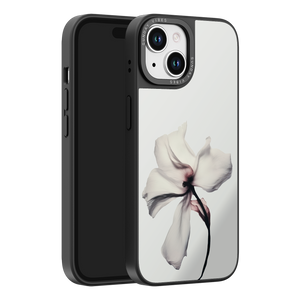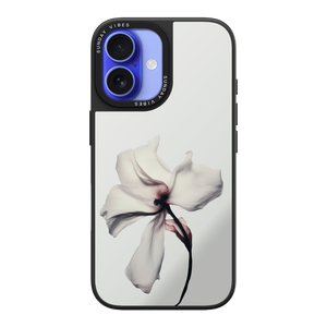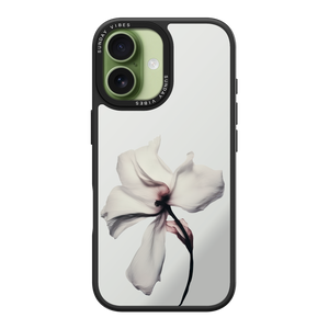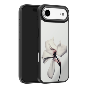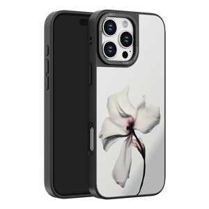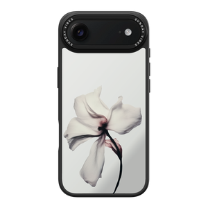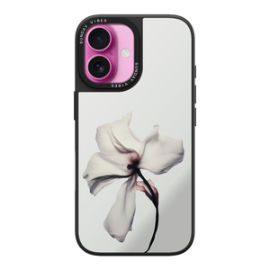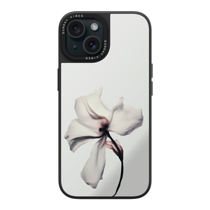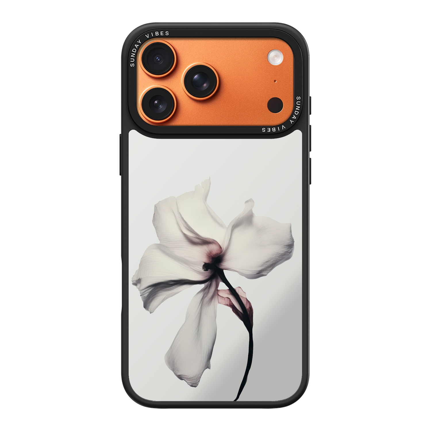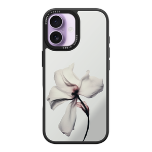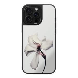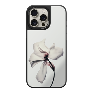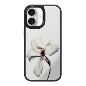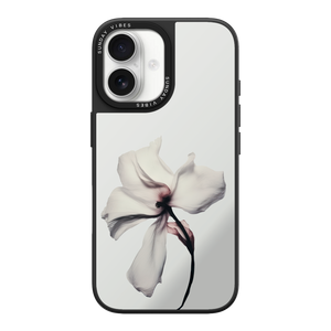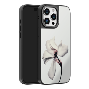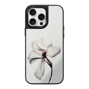 Elevate your look with the stark, sophisticated glamour of the White Shadow iPhone Case. The minimalist print features the dramatic outline and soft texture of a solitary bloom, perfectly contrasting the high-shine reflective silver backdrop. This design merges a clean, contemporary aesthetic with essential mirror convenience.