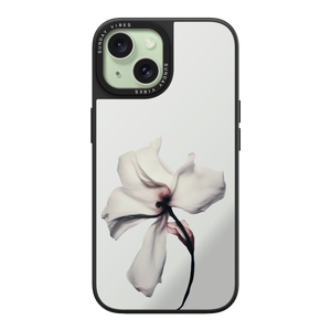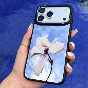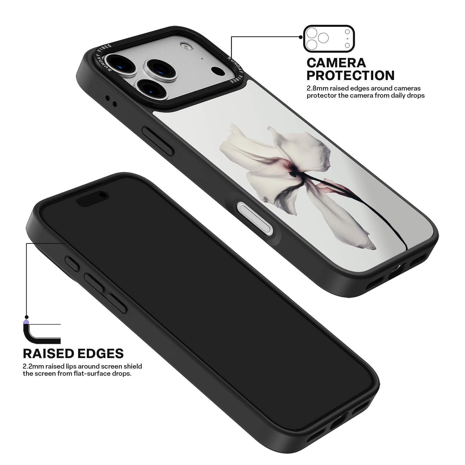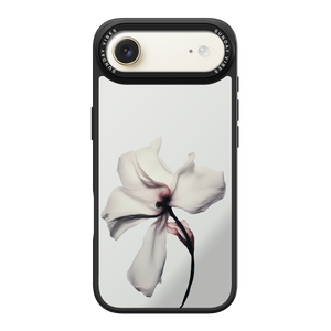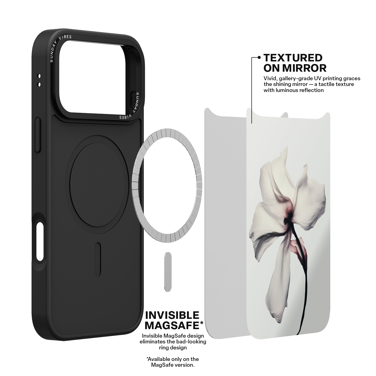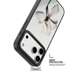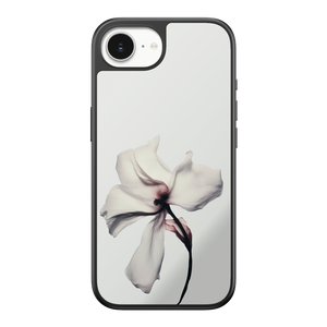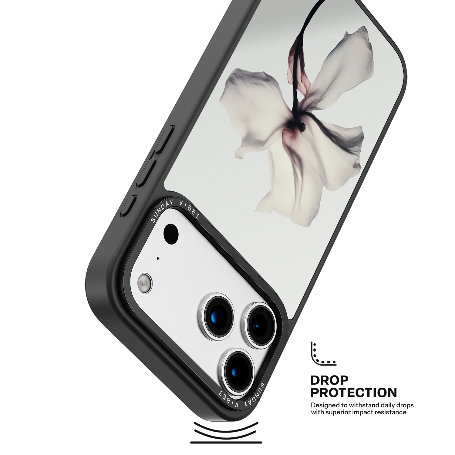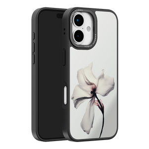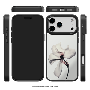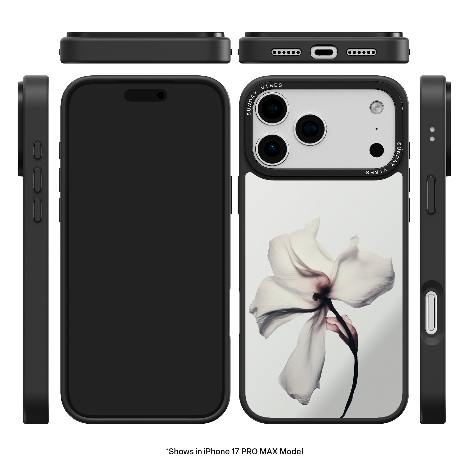 Elevate your look with the stark, sophisticated glamour of the White Shadow iPhone Case. The minimalist print features the dramatic outline and soft texture of a solitary bloom, perfectly contrasting the high-shine reflective silver backdrop. This design merges a clean, contemporary aesthetic with essential mirror convenience.